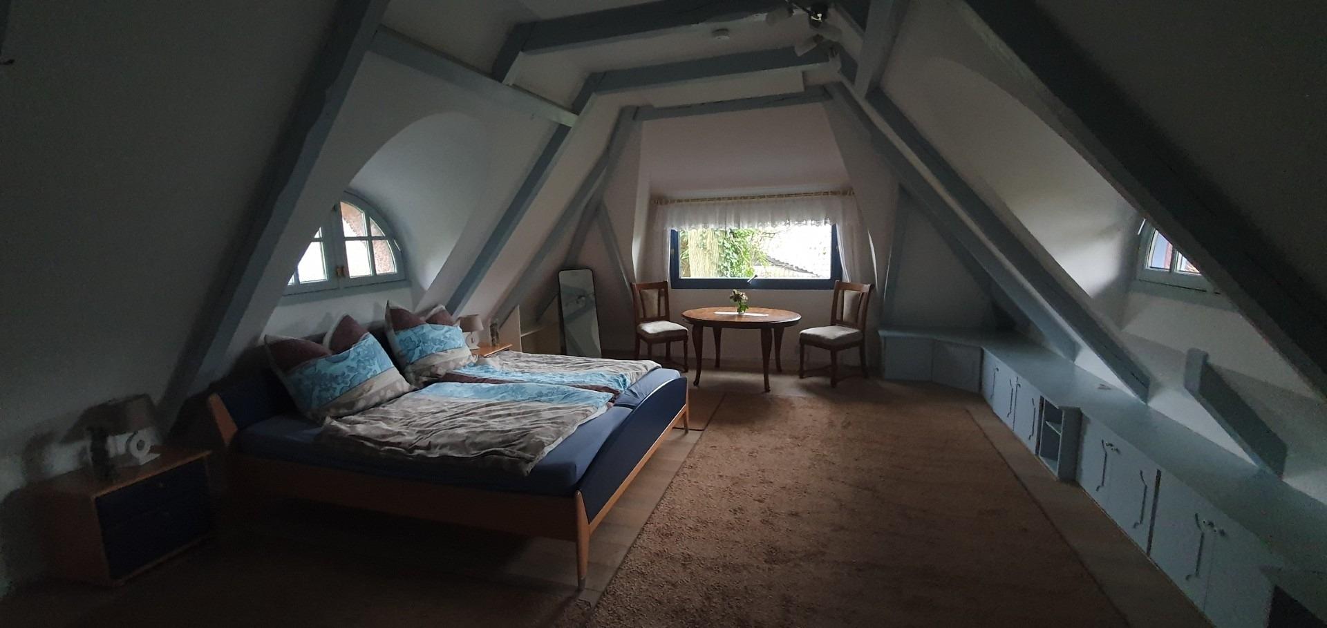 Ein weiterer, heller Raum birgt ein großes wertiges Doppelbett (Hülsta). Weiter stehen hier 2 Ohrensessel und bieten die Möglichkeit zu Entspannen und einen Blick auf die großzügige, uneinsehbare Terrasse.