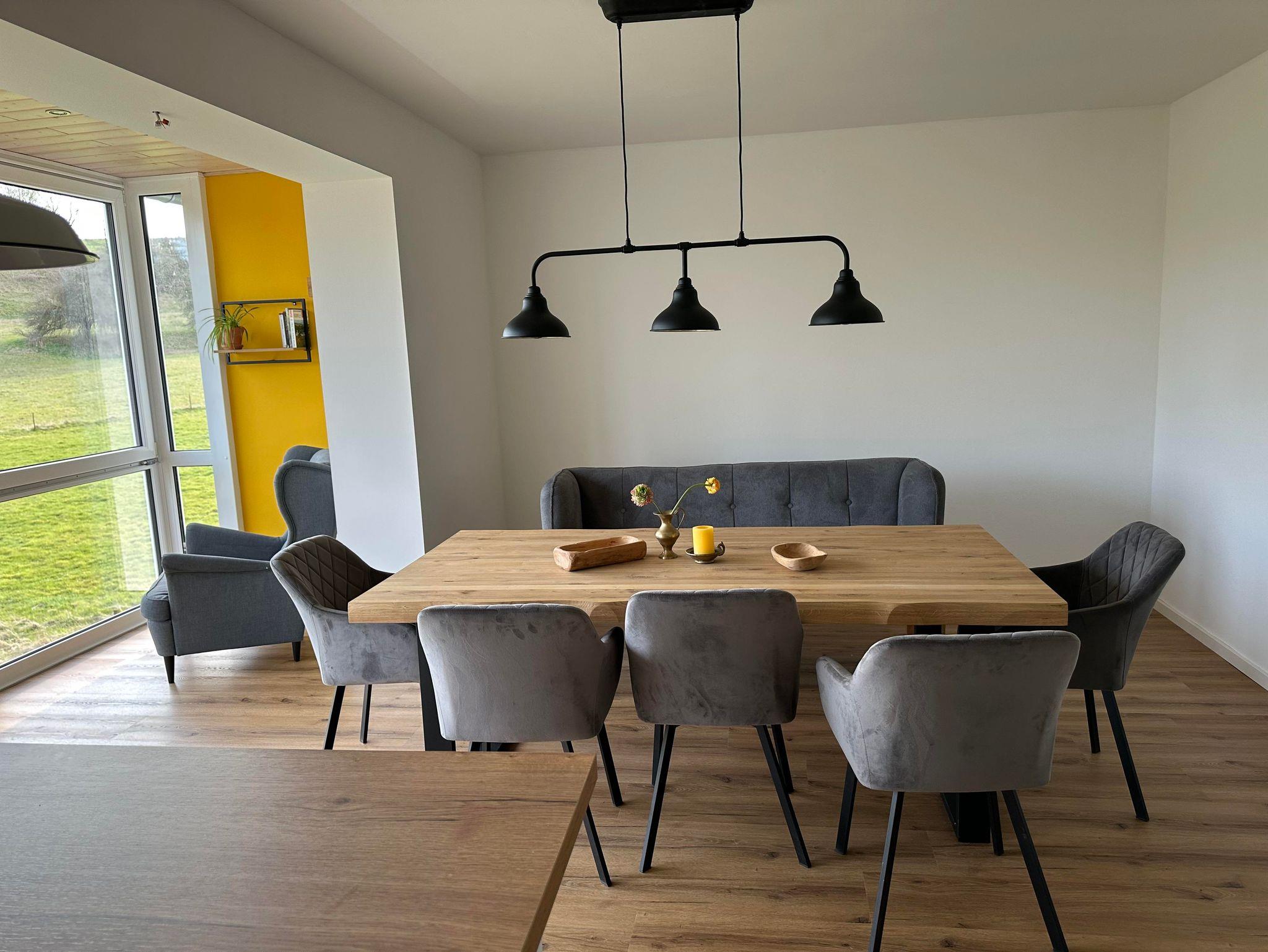 In der großzügigen vollausgestatteten Wohnküche mit Wintergarten, mit Blick in die Landschaft, befindet sich ein großer Esstisch mit 5 Stühlen, einer Sitzbank und einem TrippTrapp Hochstuhl.