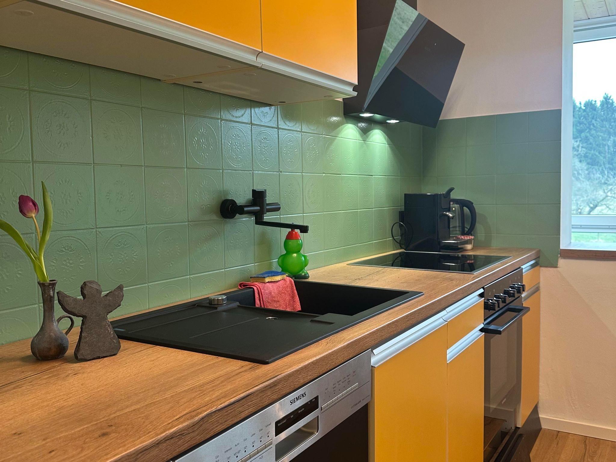 In der großzügigen Koch- und Wohnküche mit Wintergarten und großartigem Blick in die Landschaft, finden Sie einen großen Tisch mit min. 8 Sitzplätzen. Ein Hochstuhl von Stokke ist vorhanden.
