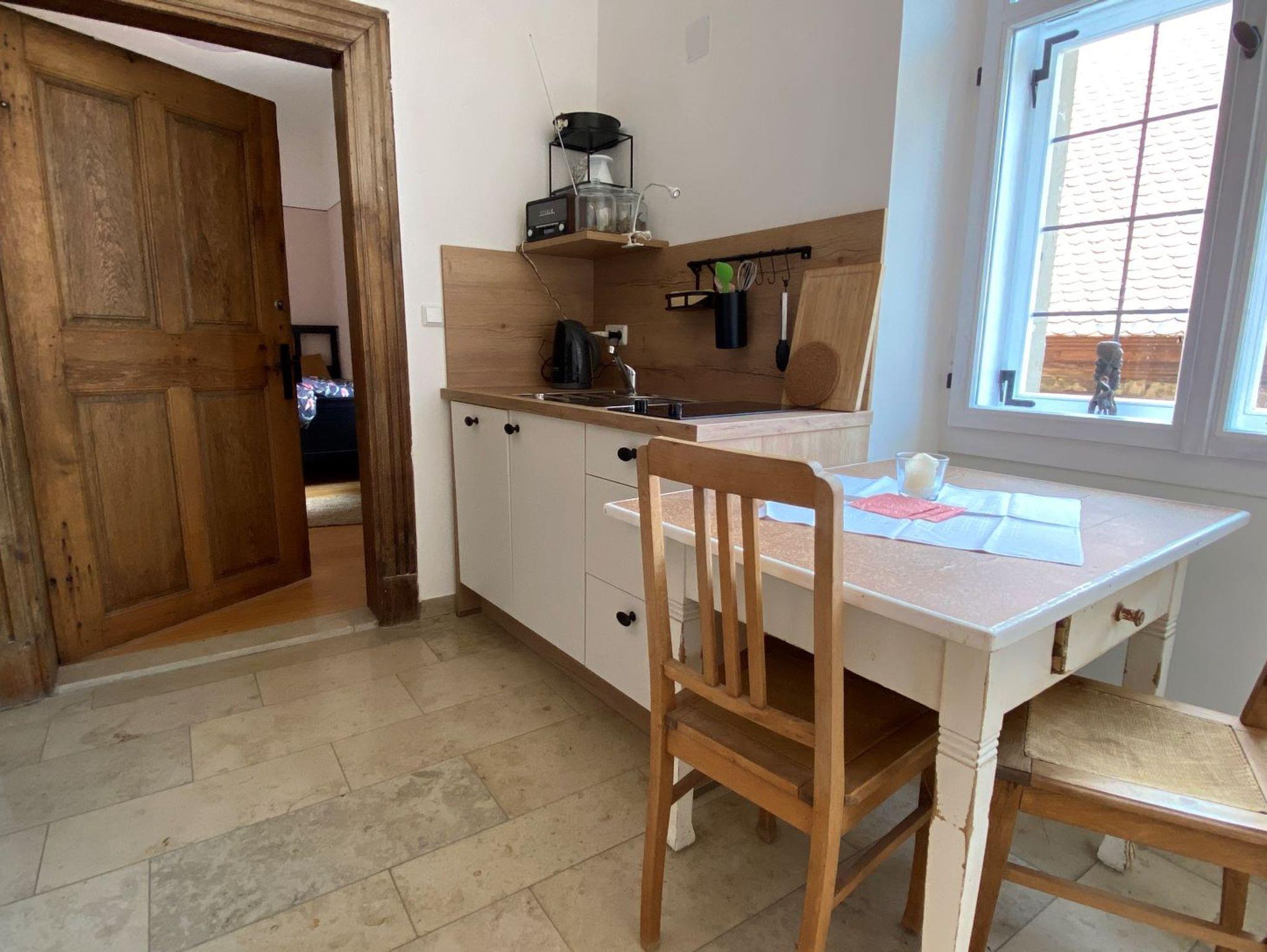 Unsere Ferienwohnung Jutta & Ludwig (50qm) im Obergeschoß ist mit einer MiniKüche ausgestattet. Dennoch müssen Sie auf nichts verzichten; auch diese Küche ist voll ausgestattet und bietet einen gemütlichen Essplatz direkt am Fenster mit Blick in unseren Hof. Das Schlafzimmer liegt
