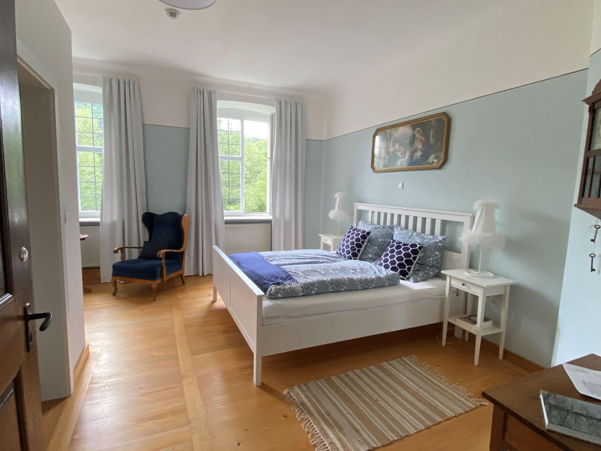 Unser Doppelzimmer Mechthildis (25qm) im Obergeschoss verwöhnt das Auge & Ohr mit einem weiten Blick über die Els auf unsere Streuobstwiese und der Elsbach rauscht wunderbar beruhigend und beständig am Haus vorbei. Bei Sonnenschein strahlt der Holzboden in warmen gelb und harmoniert wunderbar mit sanften Blautönen. Bei der Einrichtung haben wir viel Wert auf die Mischung aus modernen & funktionalen Elementen gelegt. Diese werden durch wunderschöne Antiquitäten ergänzt. Das Doppelbett ist 180x200 breit, Sitzgelegenheit bieten 2 Sessel. Das Badezimmer mit Dusche fügt sich harmonisch ein.