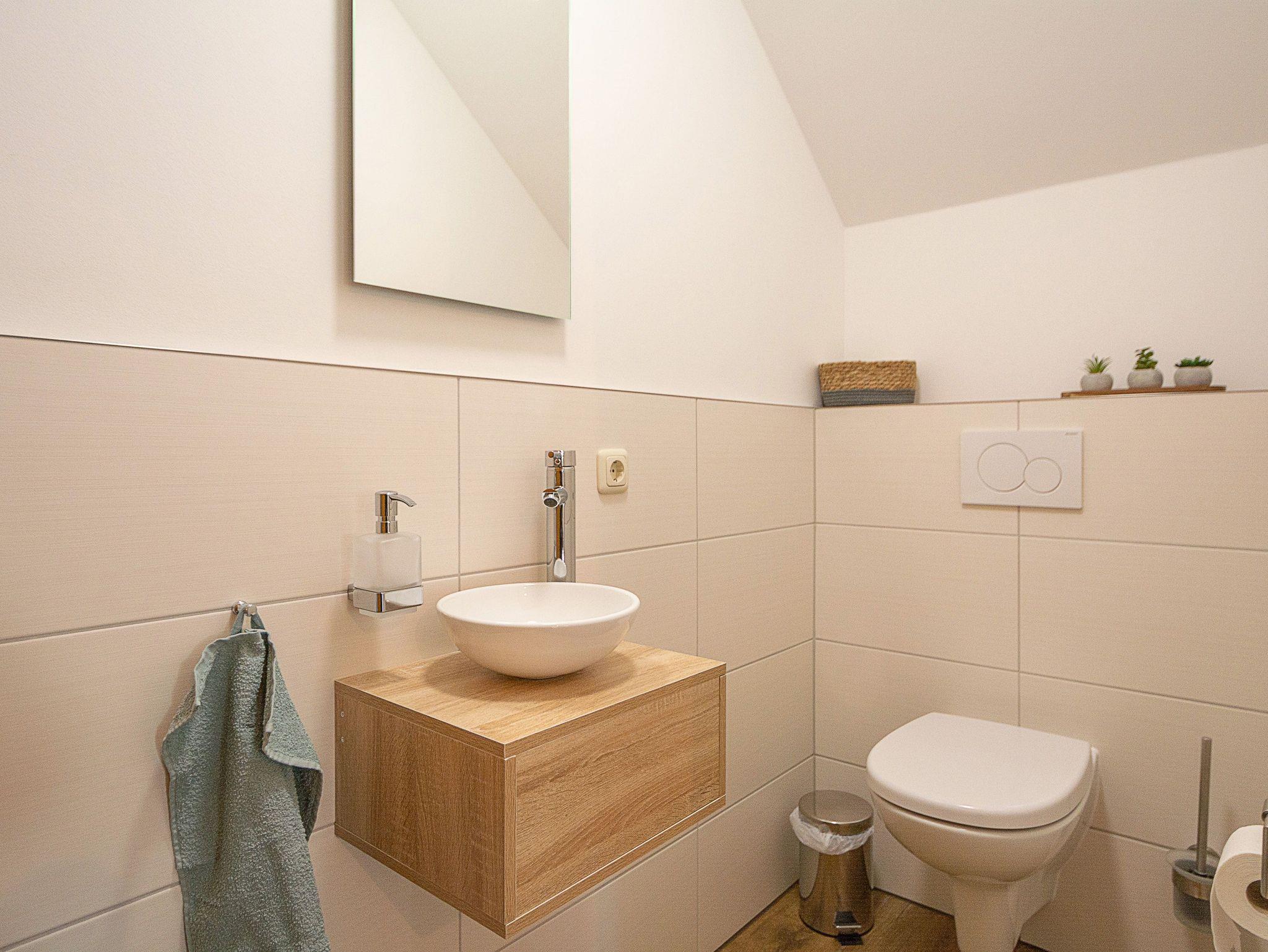 Das moderne geflieste Tageslichtbad verfügt über eine Badewanne, eine bodengleiche Dusche mit Regenwaldfunktion und WC sowie ein Fön, ein Handtuchheizkörper, ein Kosmetikspiegel und genügend Ablagefläche für Ihre Waschutensilien. Das Gäste-WC sowie ein Sitzbereich im Garten runden das Gesamtbild dieser Ferienwohnung ab.