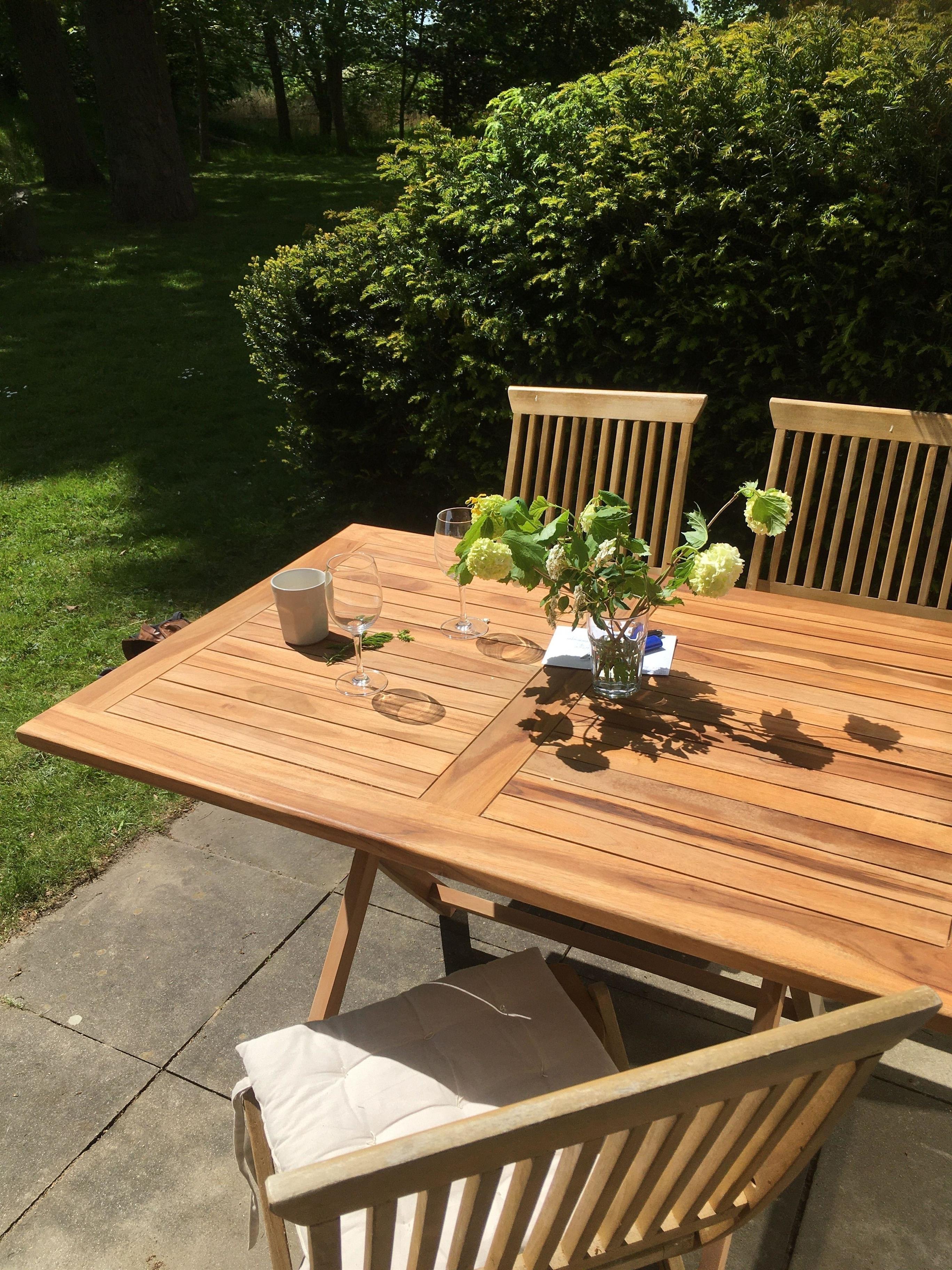 Zu der Wohnung gehört eine nach Süden ausgerichtete, halbüberdachte Terrasse mit Blick in den Gutspark. Gartenmöbel (1 Tisch, 4 Stühle, 2 Liegen) sind zur Nutzung in der Haupt- und Zwischensaison vorhanden. In der Nebensaison werden die Gartenmöbel untergestellt.