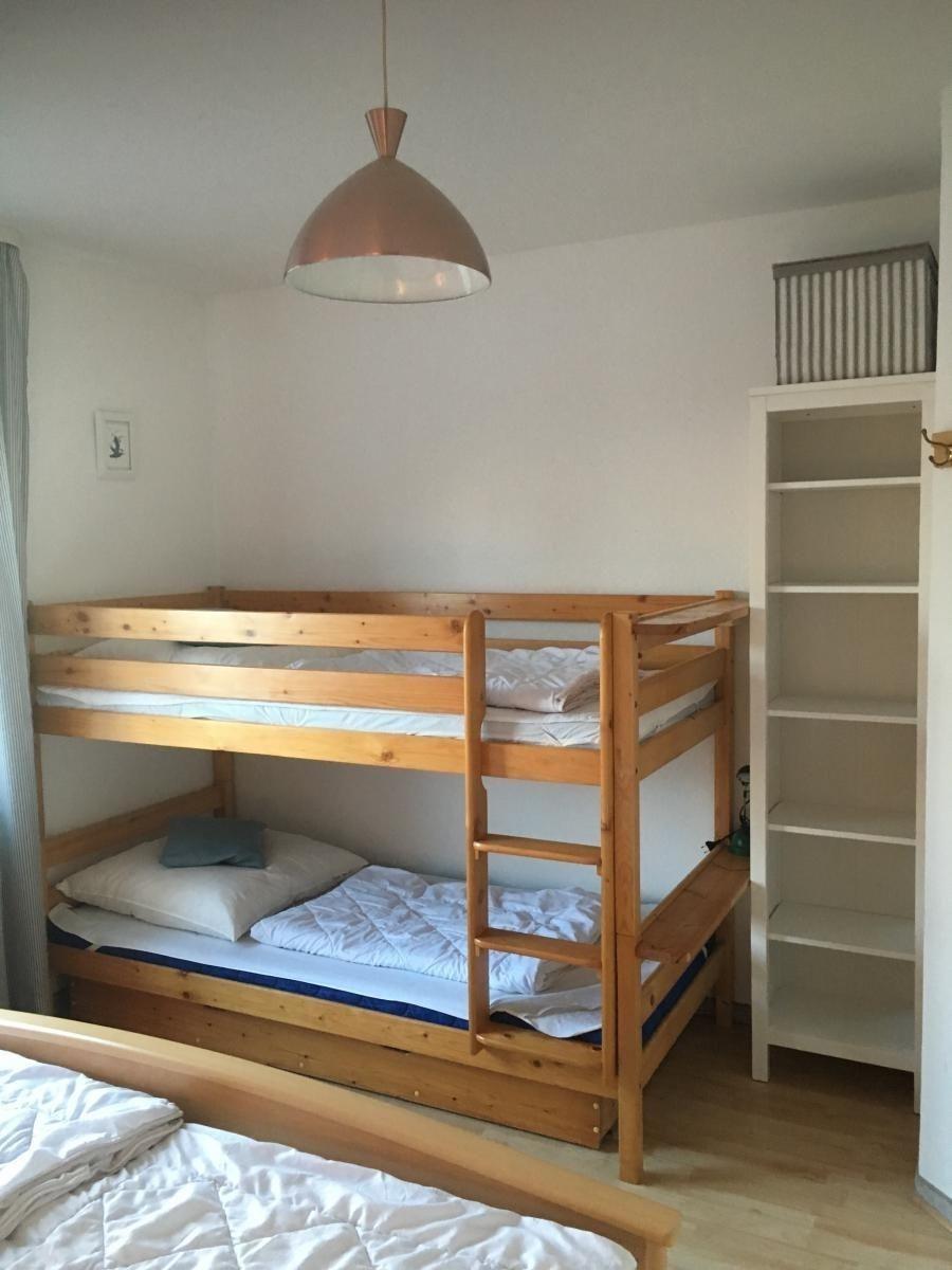 Das Schlafzimmer verfügt über ein Doppel- und ein Etagenbett sowie einen Kleiderschran. Ein Baby-Reisebett ist vorhanden (Wohnzimmer, rechts hinter der Schrankwand). Angrenzend zum Schlafbereich befindet sich ein 2021 neu gemachtes Duschbad mit WC (das Bad-Foto in der Bildergalerie ist veraltet).