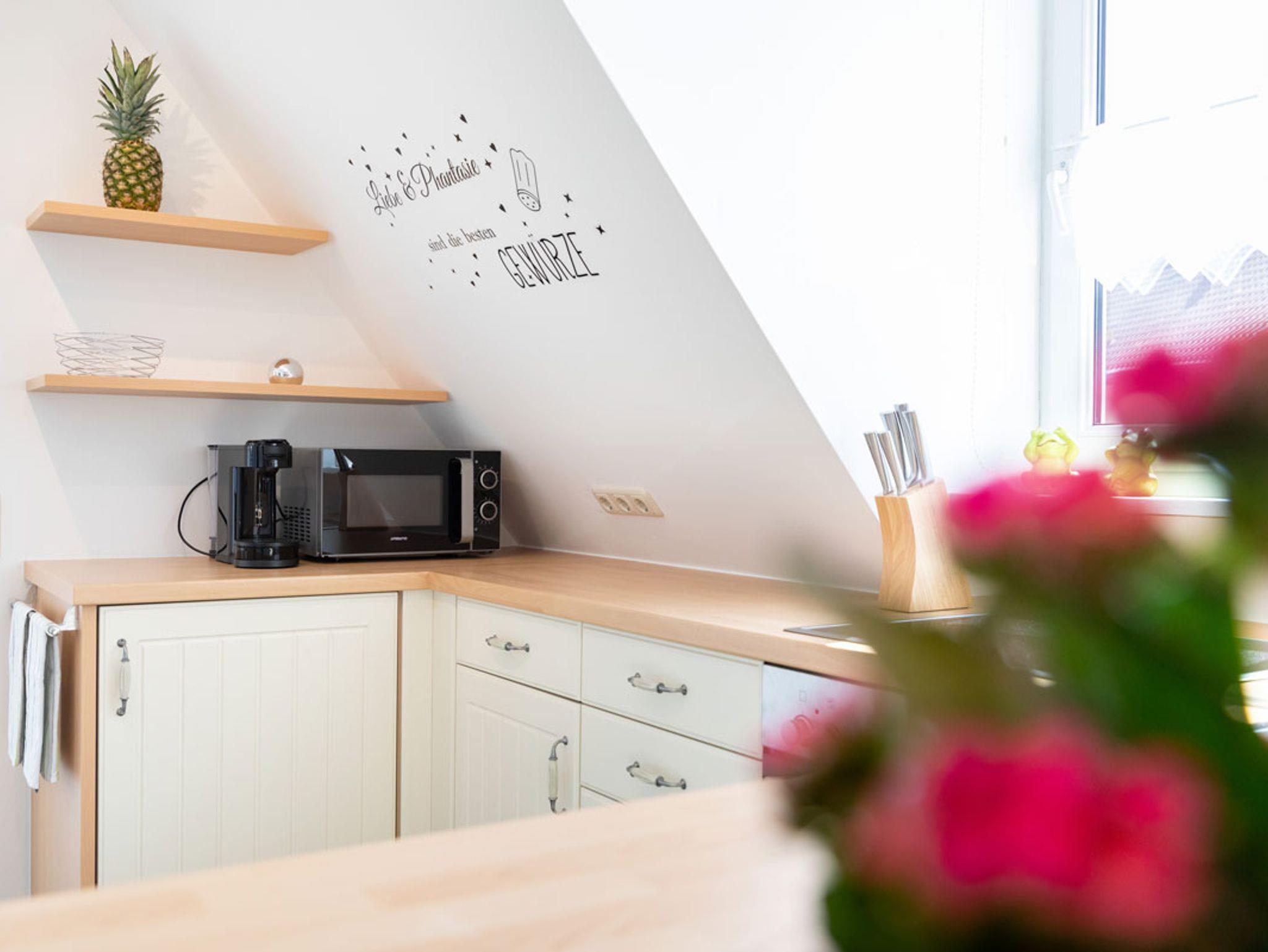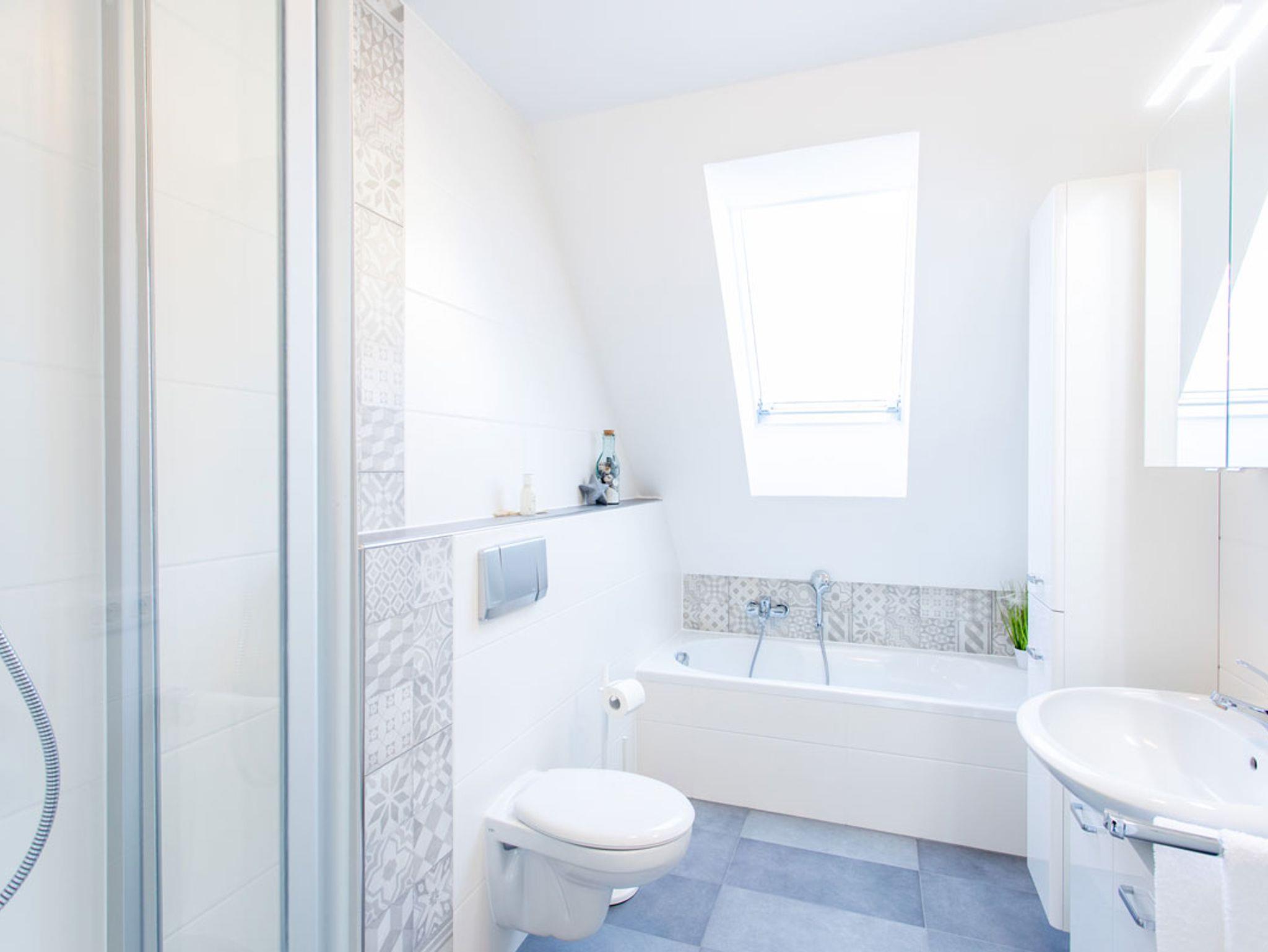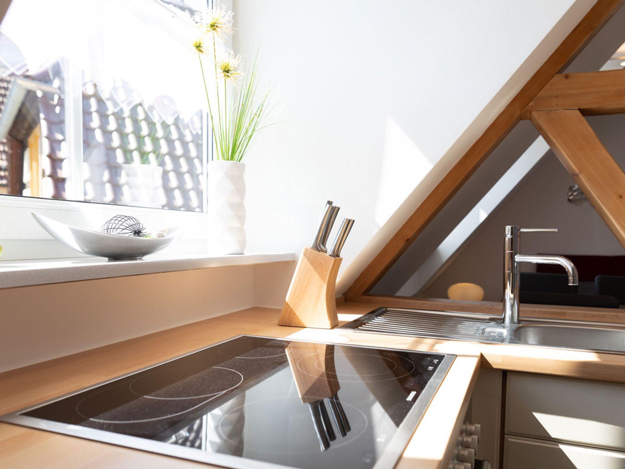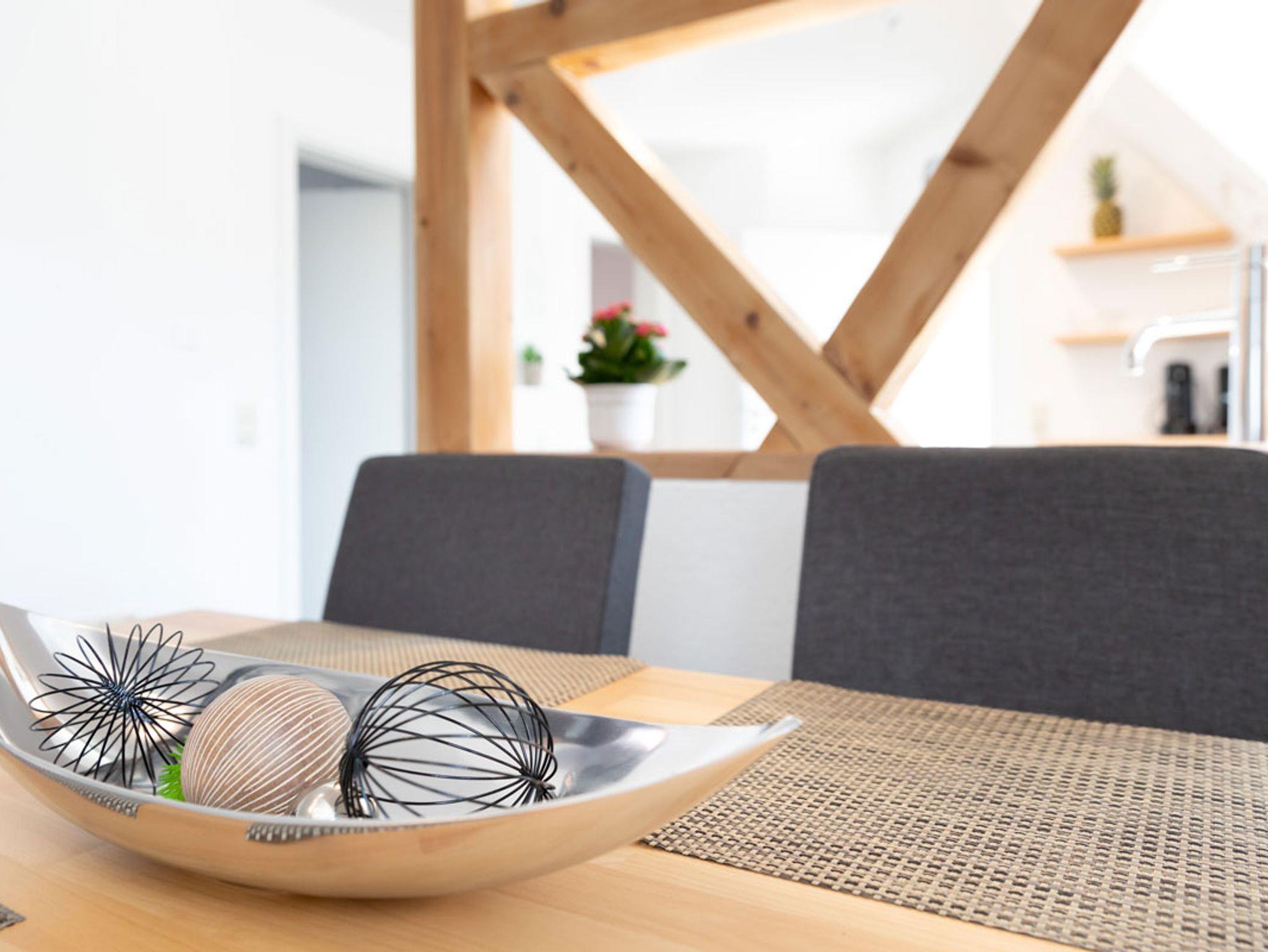 Unsere moderne Nichtraucher-Ferienwohnung mit 50m² Wohnfläche bietet Platz für bis zu 5 Personen. Das gemütliche Wohn-Esszimmer mit Schlafsofa, Esstisch und Flachbild-TV lädt zum Verweilen ein. Die komplett ausgestattete Küche mit Geschirrspüler, Kühlschrank, Herd, Backofen, Mikrowelle, Eierkocher, Toaster und Gewürzen lässt keine Wünsche offen. Die Ferienwohnung verfügt über 2 Schlafzimmer mit einem Doppelbett und zwei Einzelbetten, je einem Schrank und einer Kofferablage. Das geräumige Badezimmer mit Dusche, Badewanne, WC, Spiegel und Fön rundet das Gesamtbild ab. WLAN, Handtücher, Bettwäsche und Geschirrtücher stehen Ihnen kostenfrei zur Verfügung.