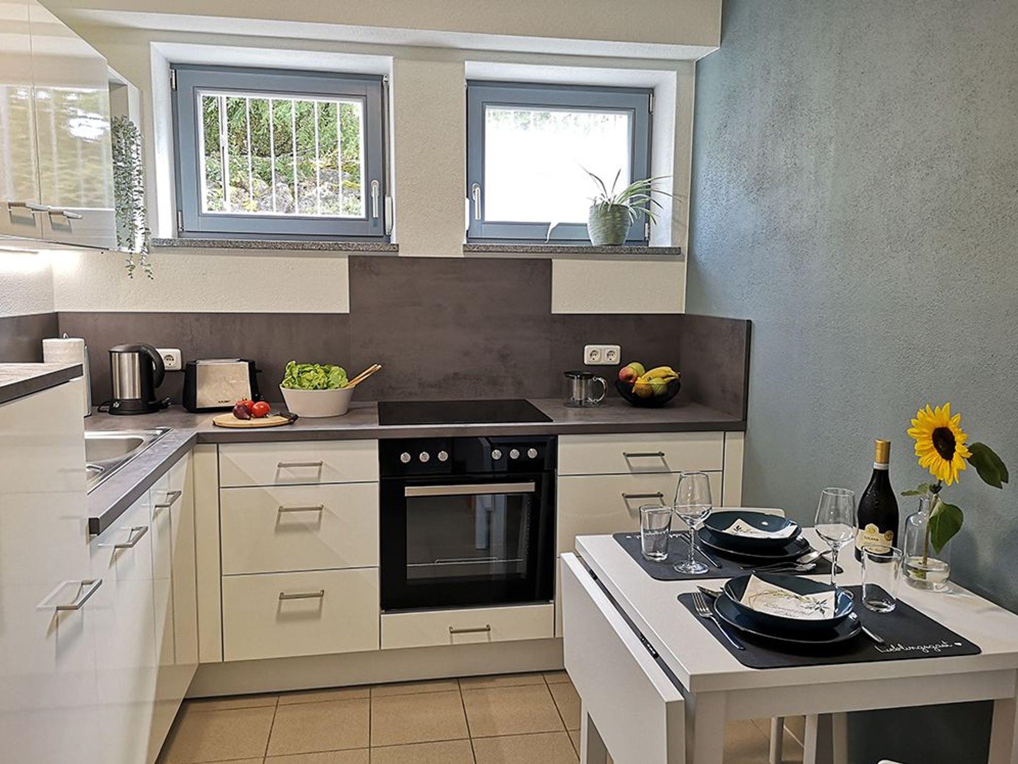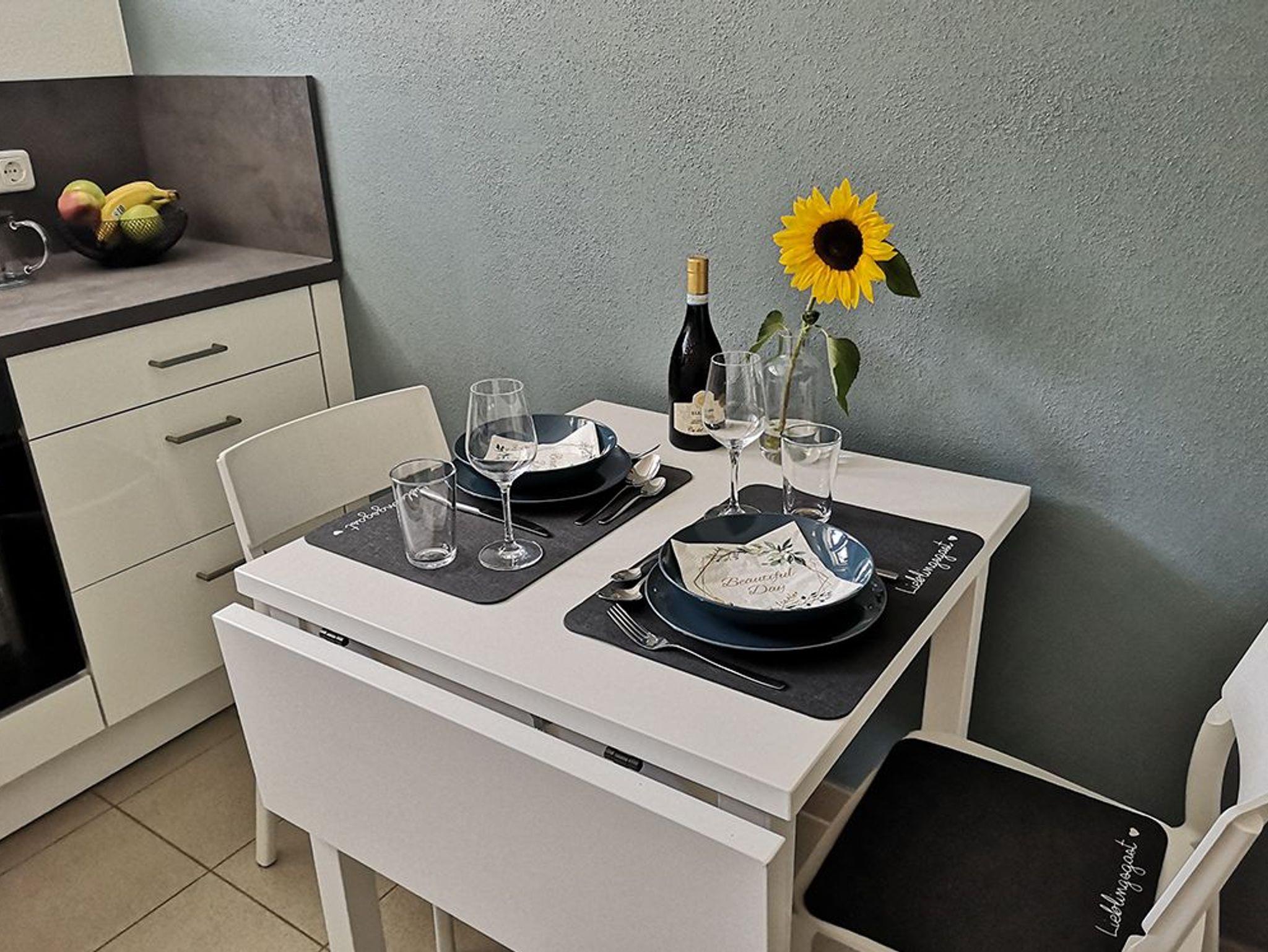 Die separate, komplett ausgestattete Küche mit Geschirrspüler, Ceran-Kochfeld, Backofen, Kühlschrank mit Gefrierfach, Wasserkocher, Toaster, Kaffeemaschine, Geschirr und Besteck ect. lässt keine Wünsche offen. Ein Esstisch für zwei Gäste befindet sich in der Küche.