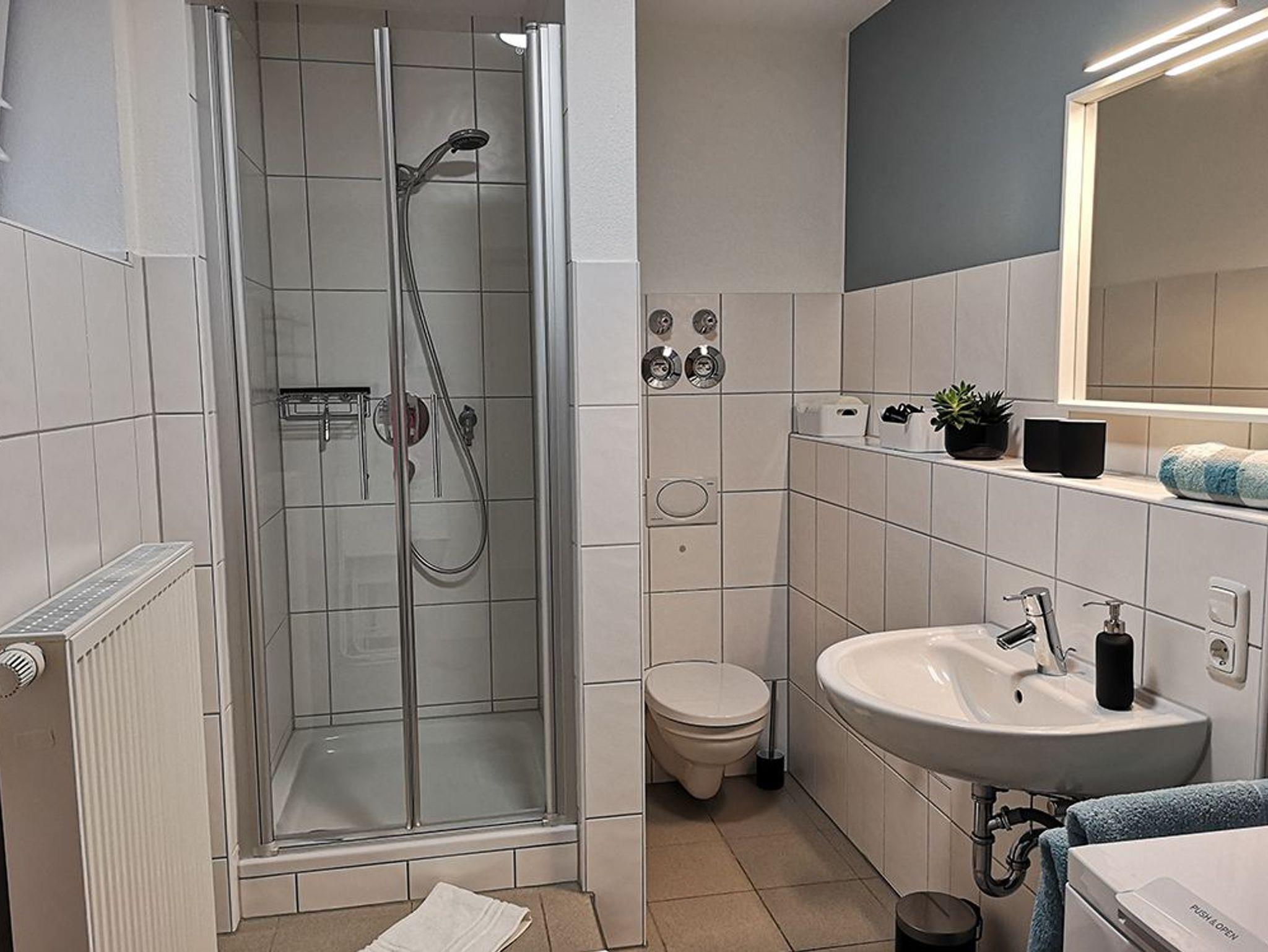 Das geräumige Badezimmer mit Fenster, Dusche, WC, Föhn und Waschmaschine rundet das Gesamtbild ab. Handtücher, Bettwäsche und Geschirrtücher liegen für Sie bereit. Im Sommer genießen Sie draußen im Morgenlicht Ihr Frühstück im eigenen Sitzbereich direkt neben der Wohnung. Das WLAN und Parkmöglichkeiten vor dem Haus können Sie kostenfrei nutzen.