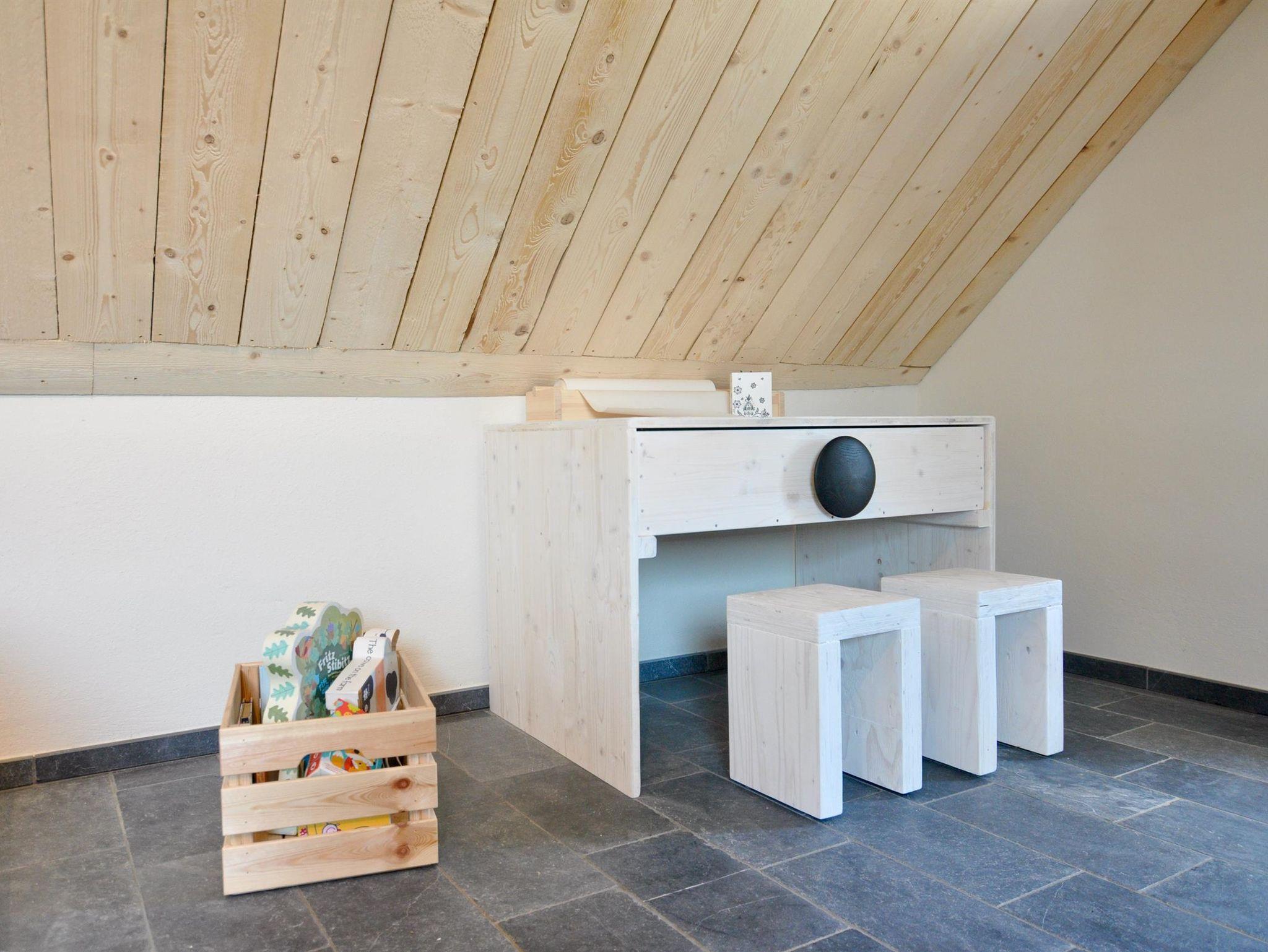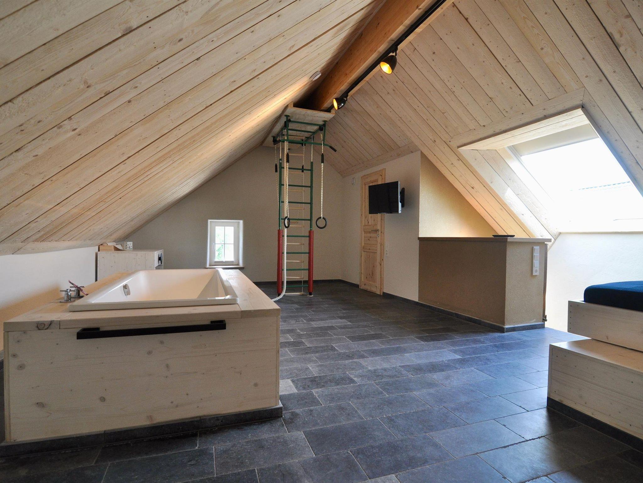 Das Häuschen ist im Inneren durchdacht und mit Liebe zum Detail eingerichtet. Das Wohnzimmer im Anbau ist großzügig und geht direkt auf die Holzterrasse, die u.a. mit Hochbeetblumenkästen, einem Gasgrill und zwei komfortablen Liegen und Sonnenschirm ausgestattet ist. Die Küche ist modern und mit allem ausgerüstet, was man so braucht; auch Bad und WC sind ganz neu gemacht. Im 1.Stock befindet sich eine bodentiefe Dusche! Das Schlafzimmer im 1. Stock hat ein kleines Seitenräumchen, das als Garderobe oder auch als Babyzimmer genutzt werden kann - überhaupt ist das Haus ganz darauf ausgerichtet, auch Kinder aufzunehmen, vom bereitstehenden Hochstuhl über den Toilettensitzverkleinerer bis hin zu Kinderspielen und -büchern. Das Kinderzimmer im 1. Stock ist auch dementsprechend eingerichtet. Der Raum im offenen großen Dachgeschoss (nicht abschließbar) - mit einer super freistehenden Badewanne mitten im Raum, einem weiteren Fernseher, Turngeräten usw. und einem sehr großen Doppelbett kann entweder als weiteres Schlafzimmer oder als Familienzimmer zum Entspannen oder Spielen genutzt werden.