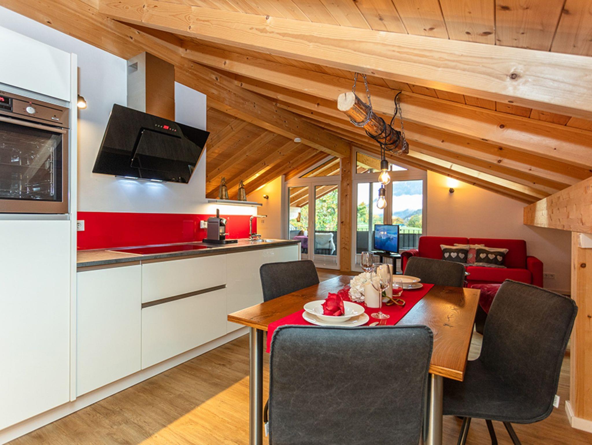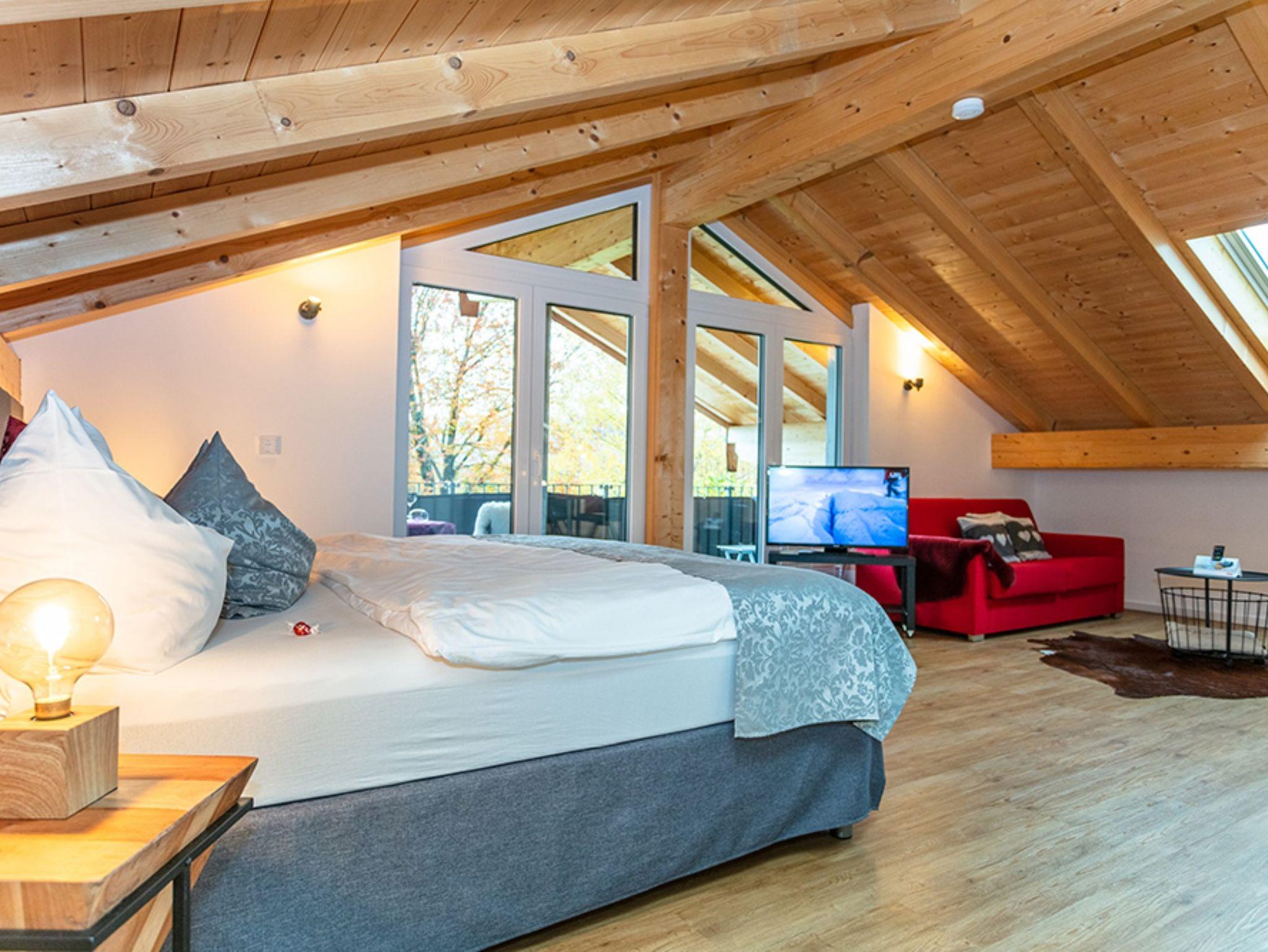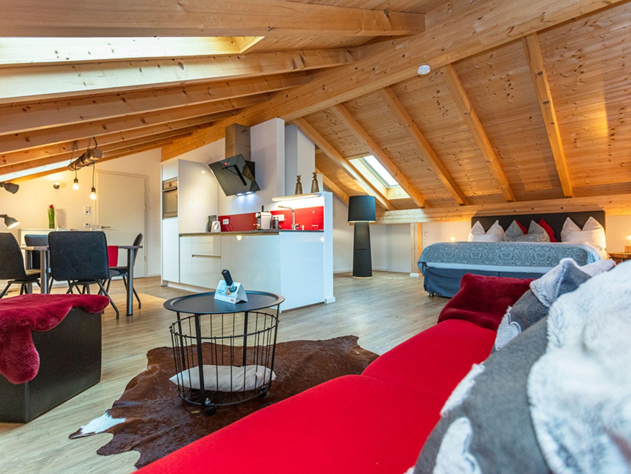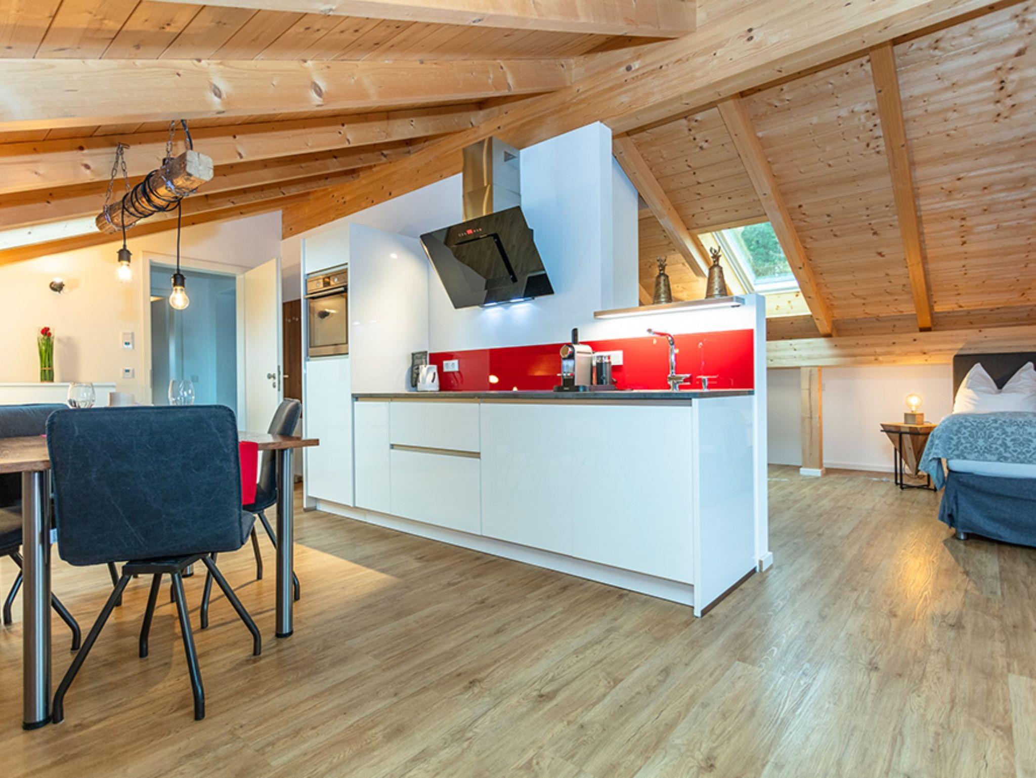 Unsere Penthouse Suite verfügt über geräumige 64 qm. Das Panoramafenster und unser Balkon laden zum Entspannen ein, die Fußbodenheizung sorgt für ein wohnliches und warmes Ambiente. Die Suite ist vollständig eingerichtet und verfügt über einen kombinierten Wohn- und Schlafbereich, mit einem Doppelbett und einem Schlafsofa. Die Küche ist voll eingerichtet mit Induktionskochplatten, Backofen, Kühlschrank, Geschirrspüler und Geschirr - und Kochutensilien. Im kombinierten Wohn/Schlafbereich besitzt das Apartement einen 40 Zoll Fernseher mit SAT-TV. Das großzügige Bad mit Dusche und WC ist mit hochwertigen italienischen Fliesen gestaltet.
