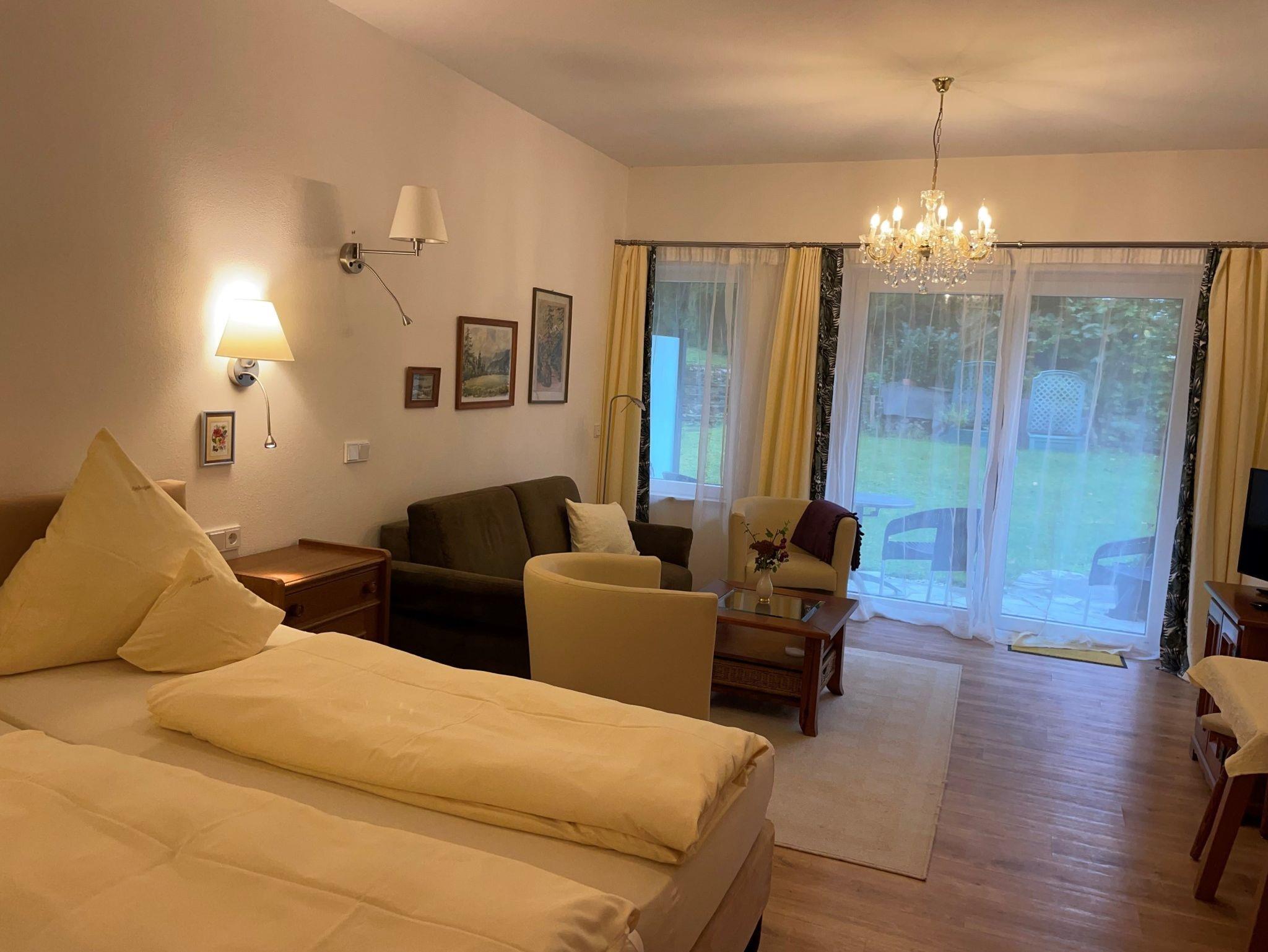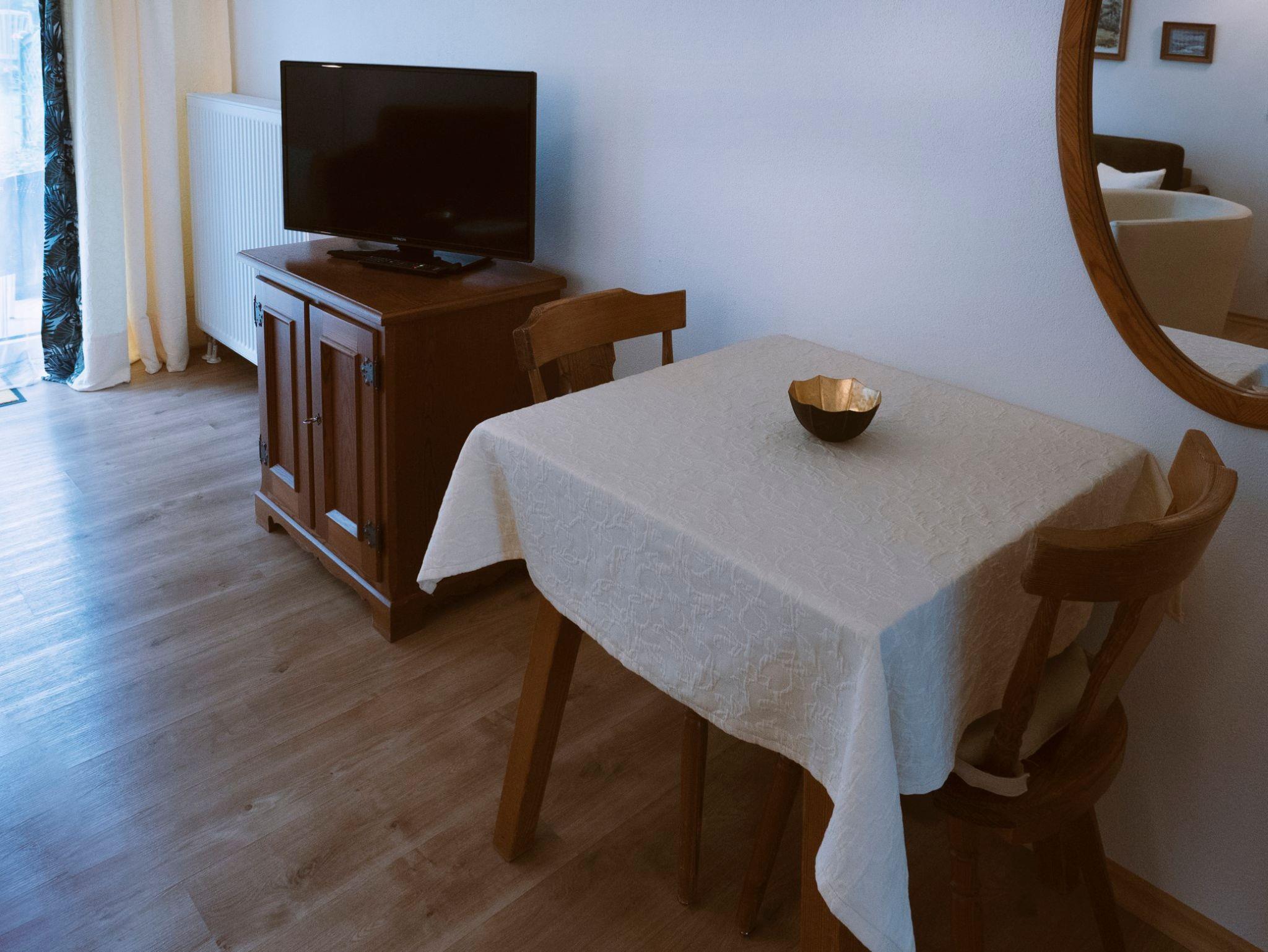 Unser 1 Zimmer Appartement mit Wohnschlafraum und Doppelbett lädt Sie zum Verweilen ein. Im Zimmer befindet sich ein Schrank mit Safe, ein Nachtkästchen, sowie eine Wohnecke mit Sesseln und einer kleinen Couch. Ein Tisch mit Stuhl, Fernsehen/Radio (Sat DVBT-2) WLan Fritz Box. Die Südterrasse mit Tisch und Stühlen sowie einem Liegestuhl bietet bei schönem Wetter einen Platz zum Genießen und Verweilen. Der Eingangsbereich mit eigenem Zugang führt Sie in die Diele mit kleiner Garderobe, das Telefonieren ist über WLan möglich. Die Küchenzeile mit Herd, Mikrowelle, Geschirrspüler, Nespressomaschine, Wasserkocher, Toaster ist komplett eingerichtet, eine kleine Essecke ist vorhanden. Das Badezimmer beinhaltet eine Dusche/WC, einen Fön und ein großes Fenster. Die Böden sind im Bad, Eingangsbereich, Küchenzeile und Terrasse gefliest. Ein hochwertiges Vinyl Parkett befindet sich im Wohnschlafraum. Das Appartement liegt in Hanglage und ist für Rollstuhlfahrer nicht geeignet. .