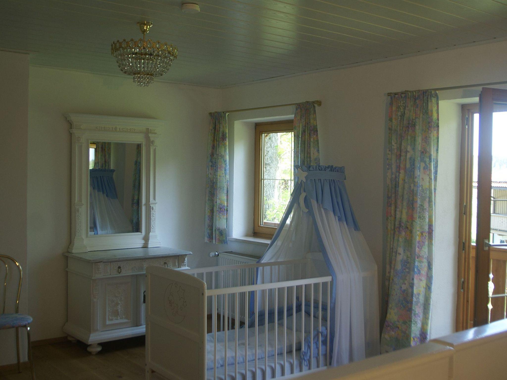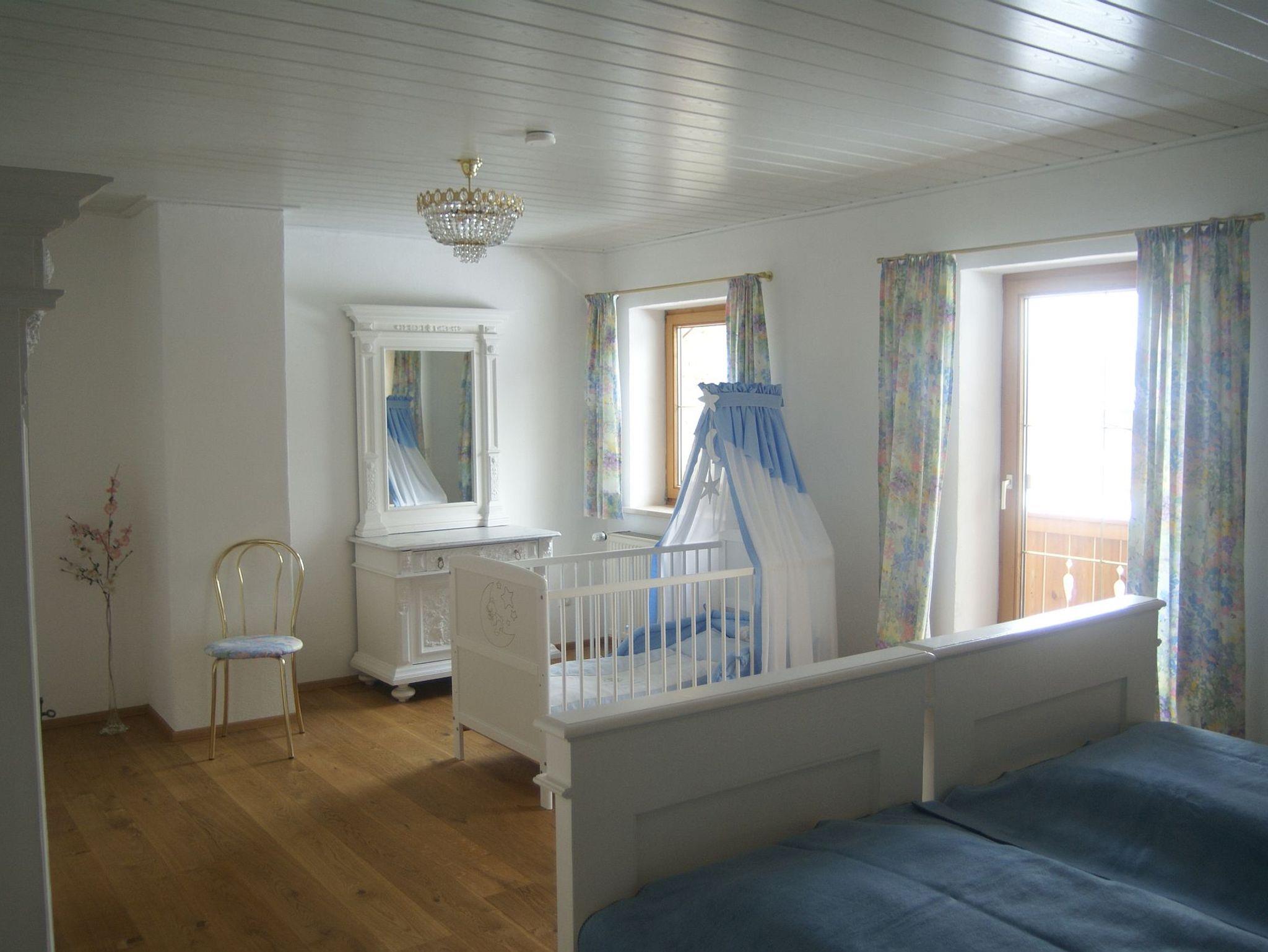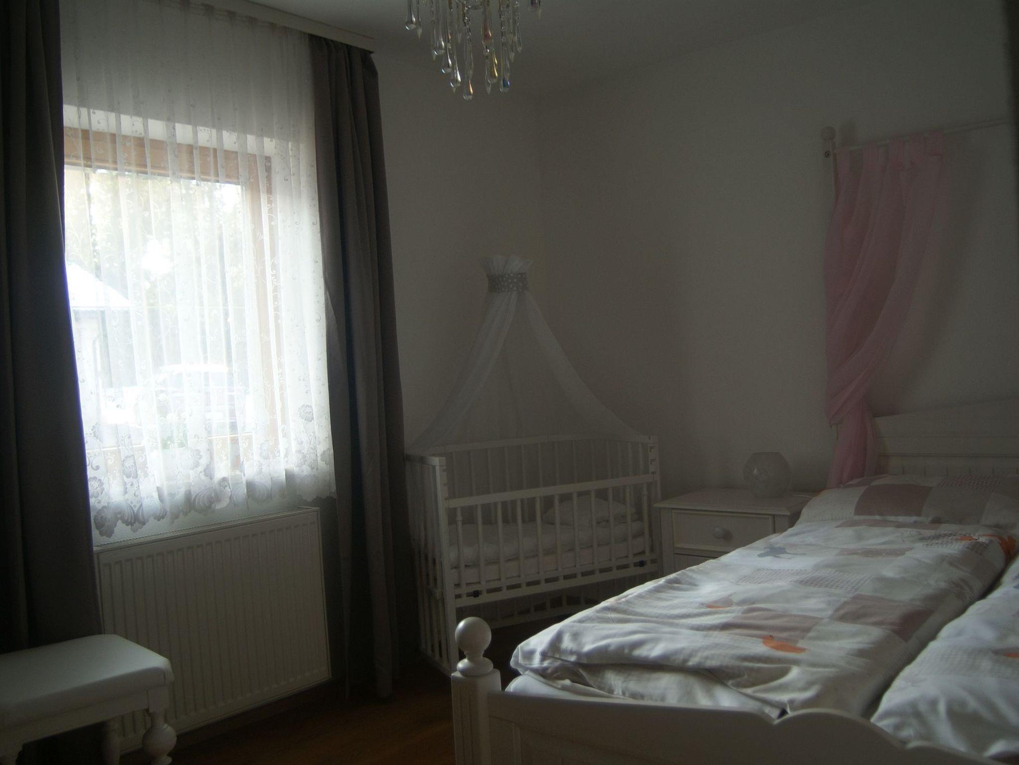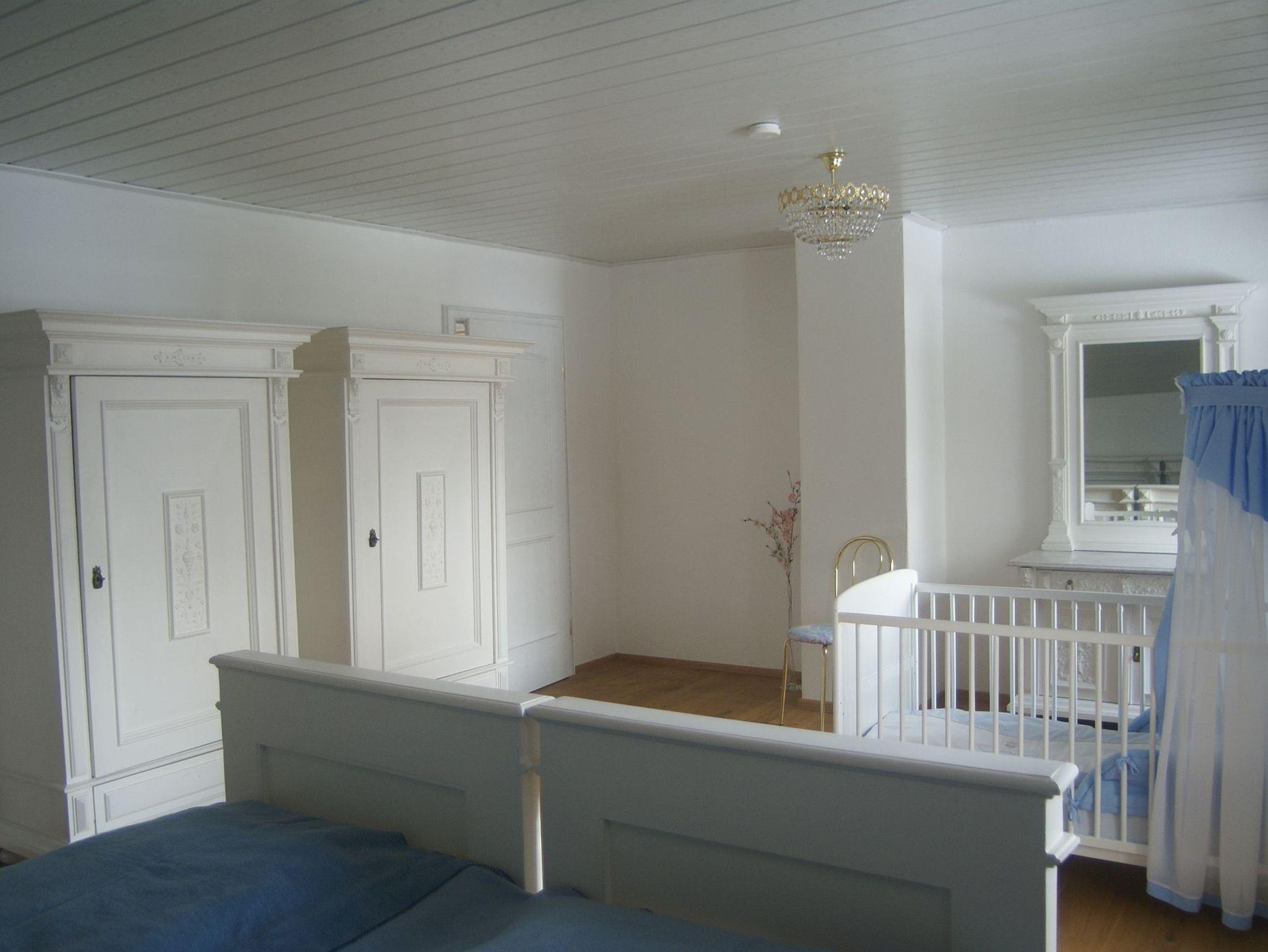 Ein kleines, liebevoll eingerichtetes Schlafzimmer mit breitem Bett und Babybettchen befinden sich ebenfalls im Erdgeschoss. Im Obergeschoss befinden sich drei große Schlafzimmer, alle mit Balkon, eines ca. 24 qm groß mit Doppelbett und einem Gitterbett für unsere kleinen Gäste. Die beiden anderen sind jeweils mit einem 140 cm breiten Bett und einer Couch oder Relax-Ecke ausgestattet. Badewanne und Dusche im geräumigen Badezimmer ergänzen unser Obergeschoss. Es befindet sich in jedem Stockwerk ein WC. Handtücher sowie Bett- und Tischwäsche stehen natürlich zur Verfügung. Auf Wunsch werden auch ein Wickeltisch mit Babybadewanne, Kinderhochstühle und zusätzliche Kinderbetten zur Verfügung gestellt.
