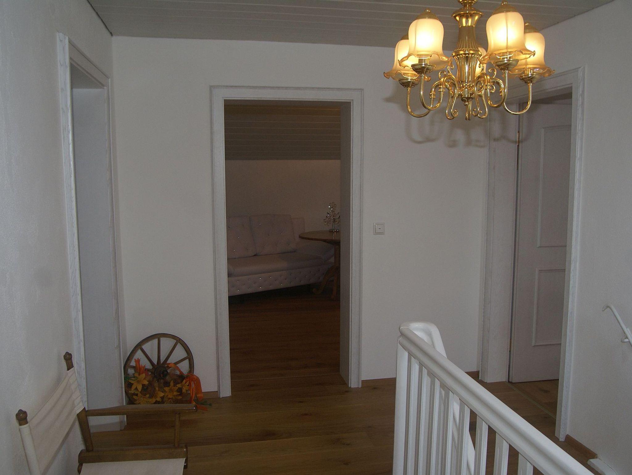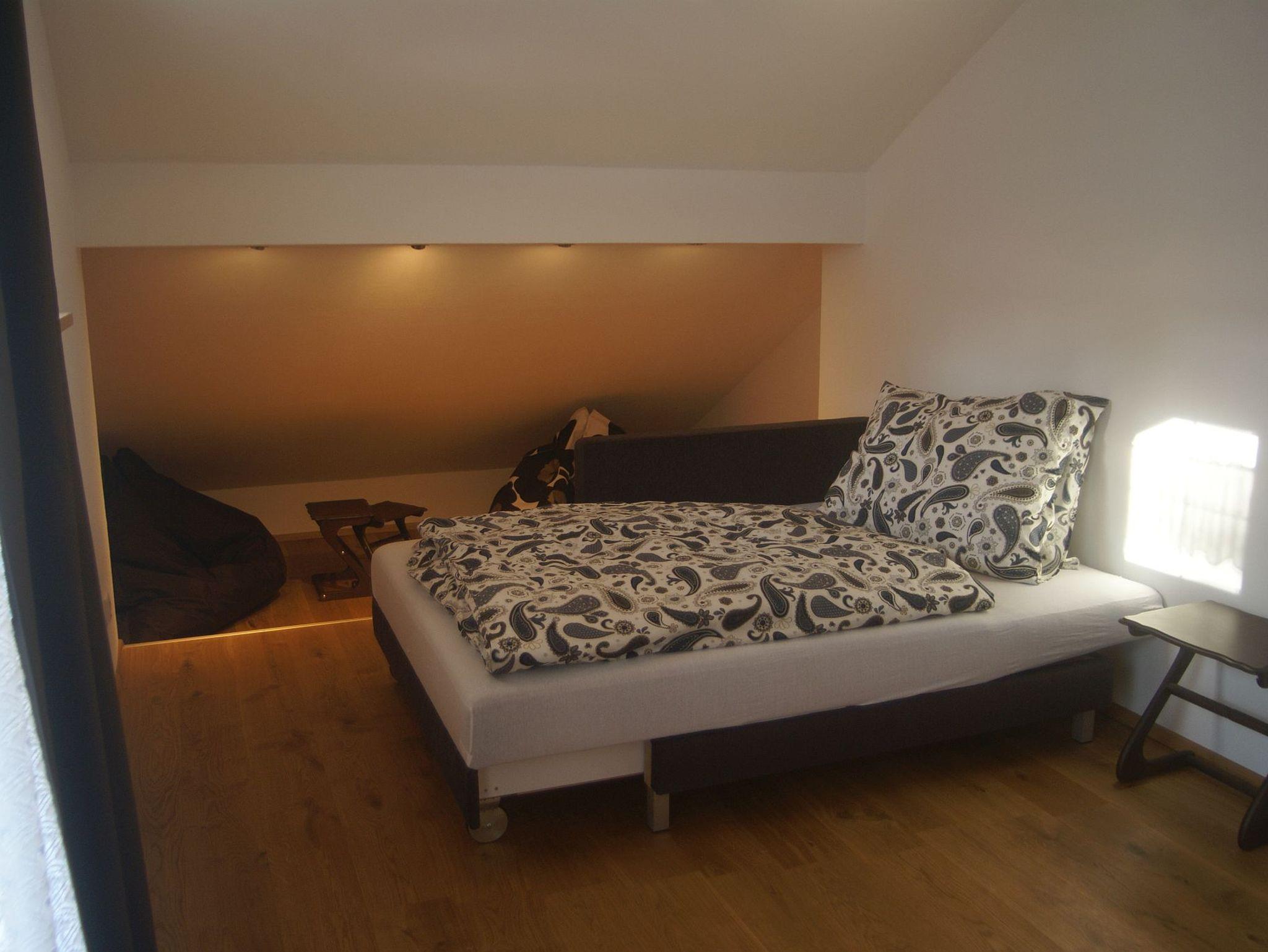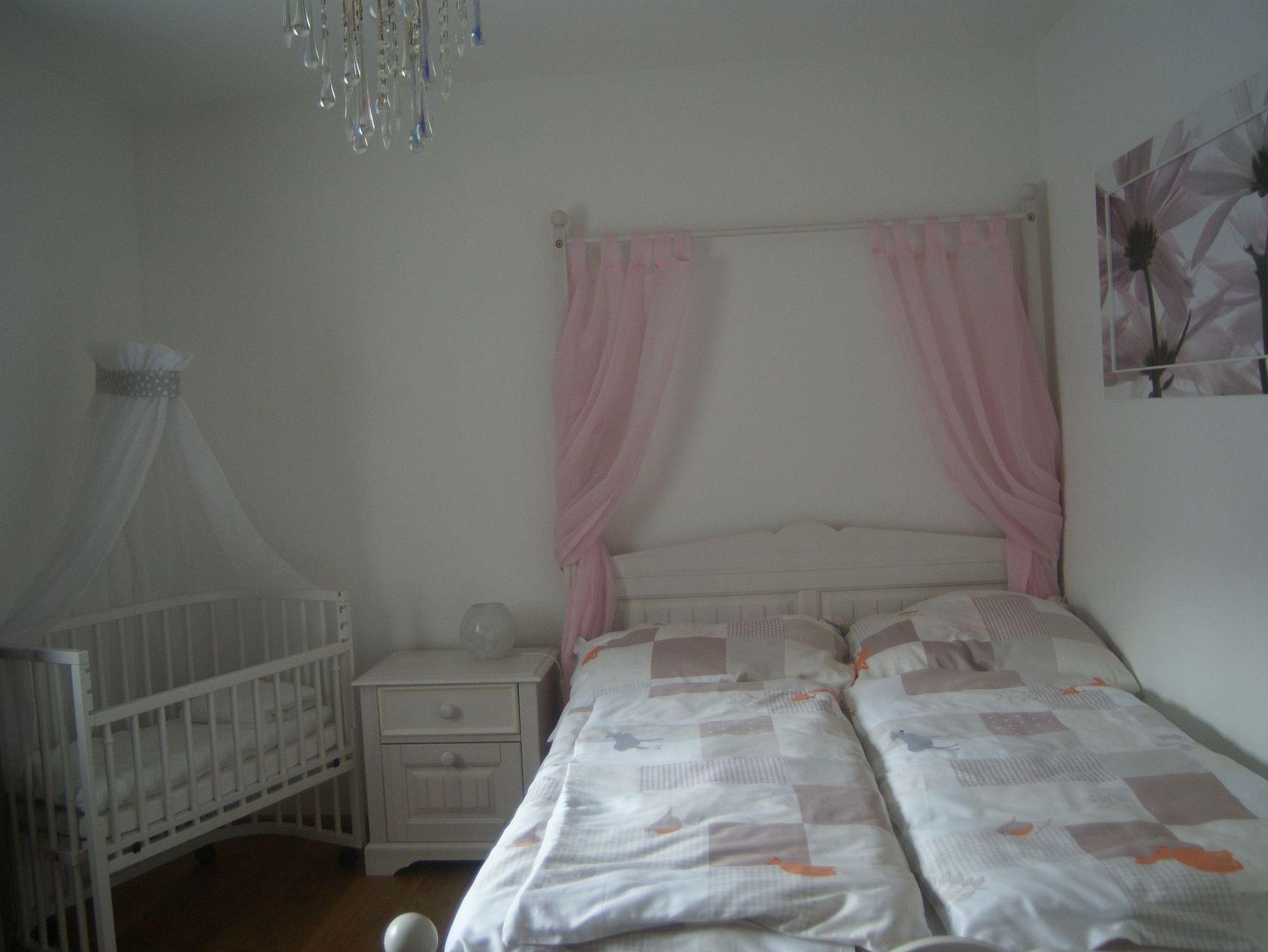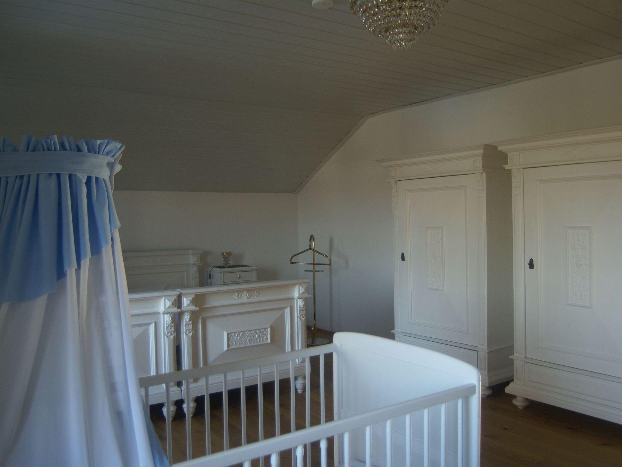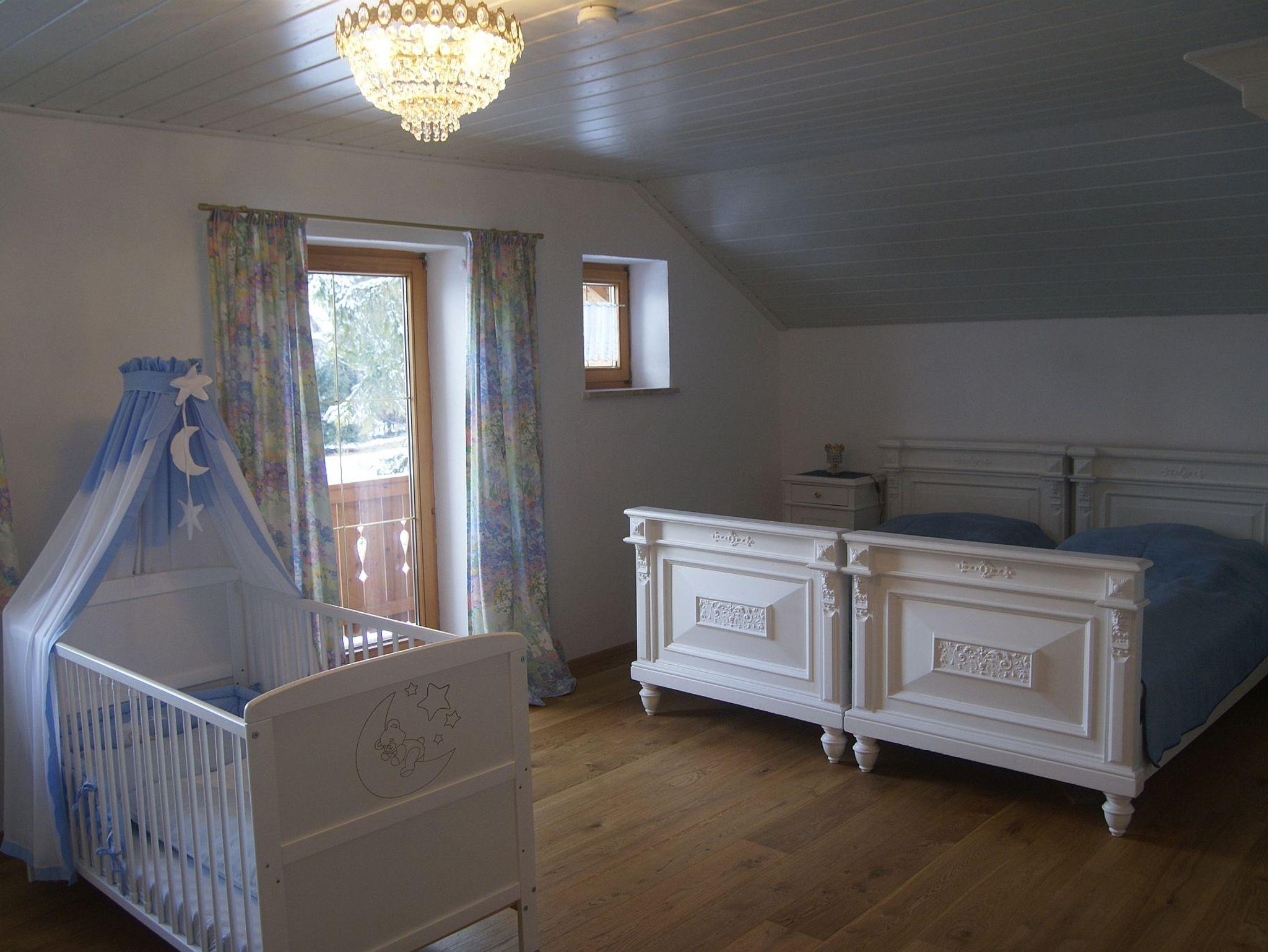 Ein kleines, liebevoll eingerichtetes Schlafzimmer mit breitem Bett und Babybettchen befinden sich ebenfalls im Erdgeschoss. Im Obergeschoss befinden sich drei große Schlafzimmer, alle mit Balkon, eines ca. 24 qm groß mit Doppelbett und einem Gitterbett für unsere kleinen Gäste. Die beiden anderen sind jeweils mit einem 140 cm breiten Bett und einer Couch oder Relax-Ecke ausgestattet. Badewanne und Dusche im geräumigen Badezimmer ergänzen unser Obergeschoss. Es befindet sich in jedem Stockwerk ein WC. Handtücher sowie Bett- und Tischwäsche stehen natürlich zur Verfügung. Auf Wunsch werden auch ein Wickeltisch mit Babybadewanne, Kinderhochstühle und zusätzliche Kinderbetten zur Verfügung gestellt.