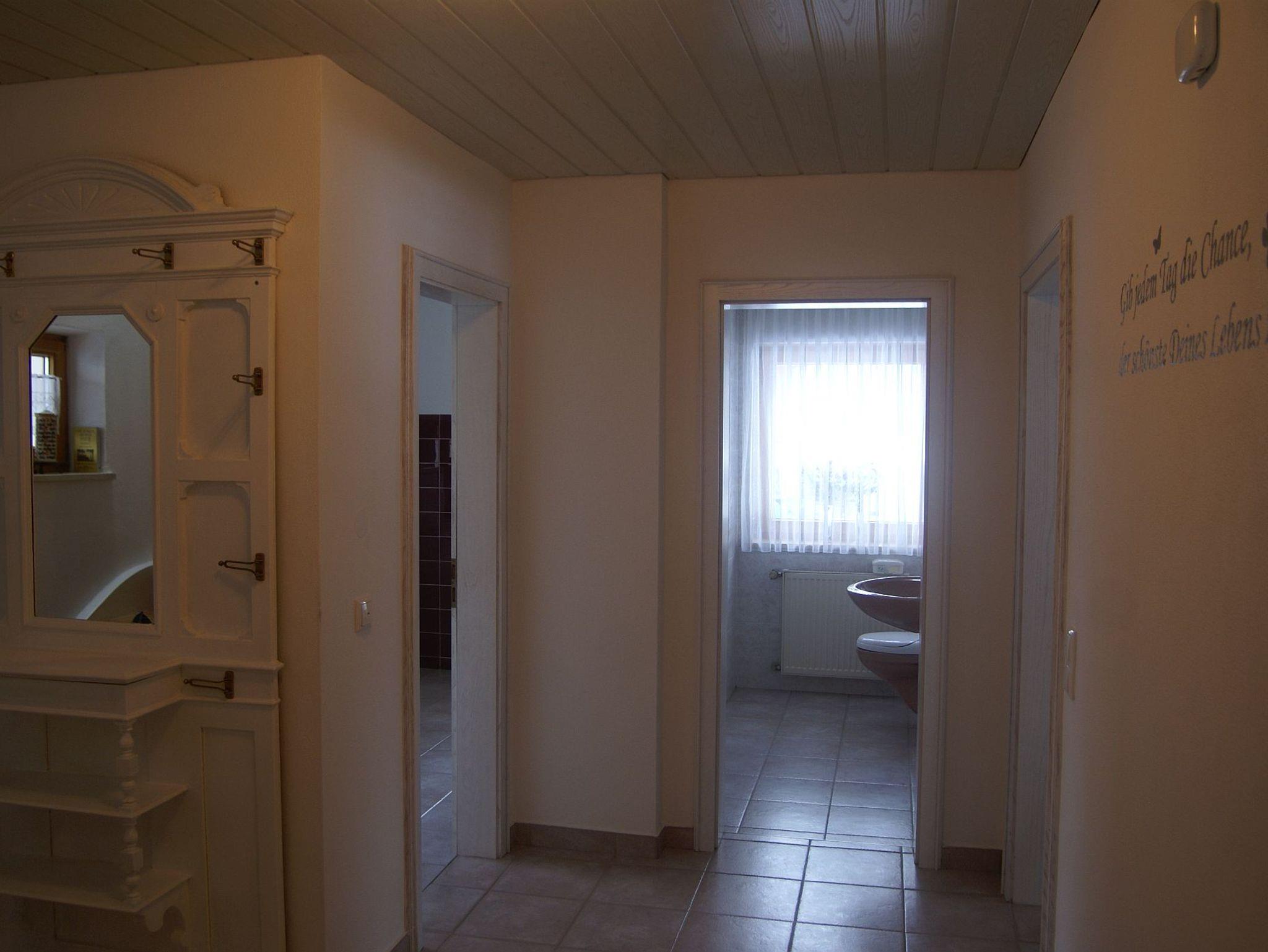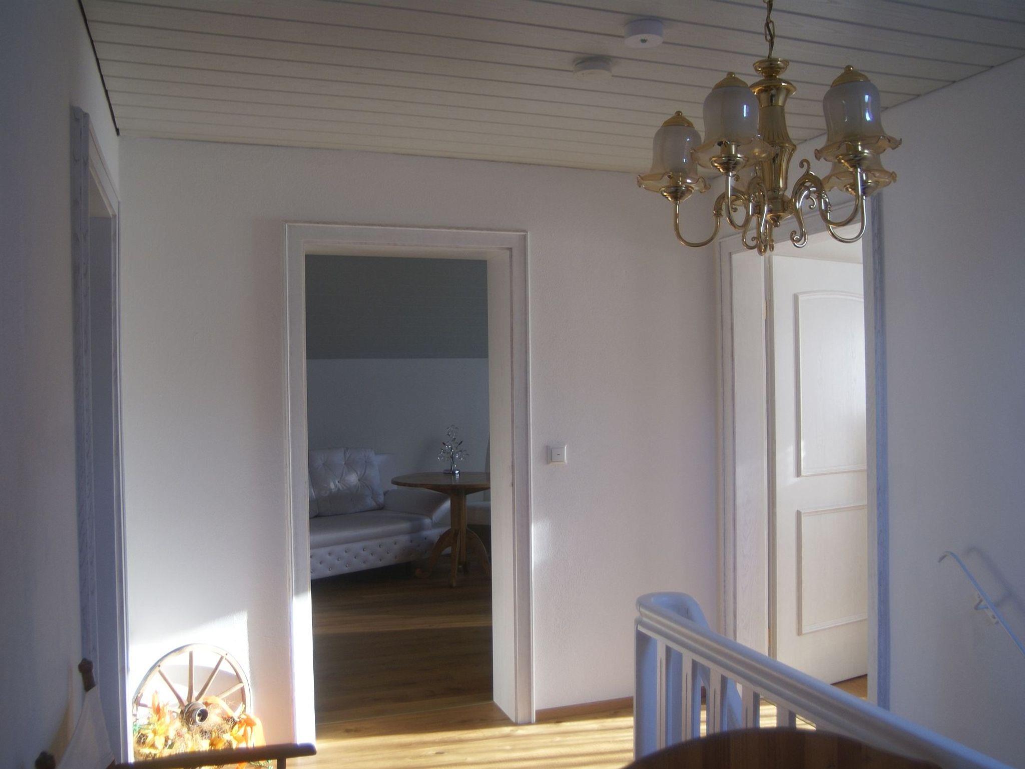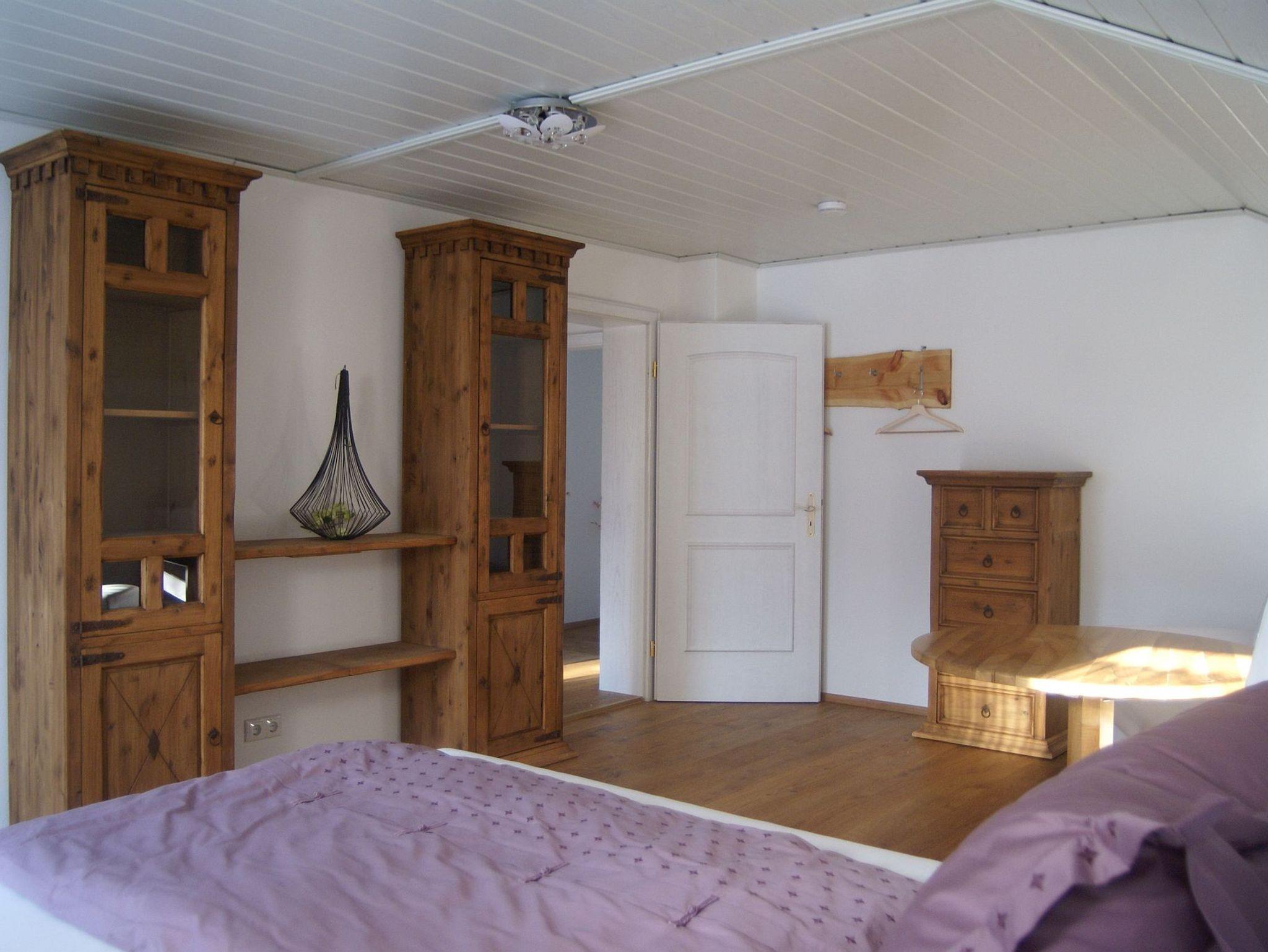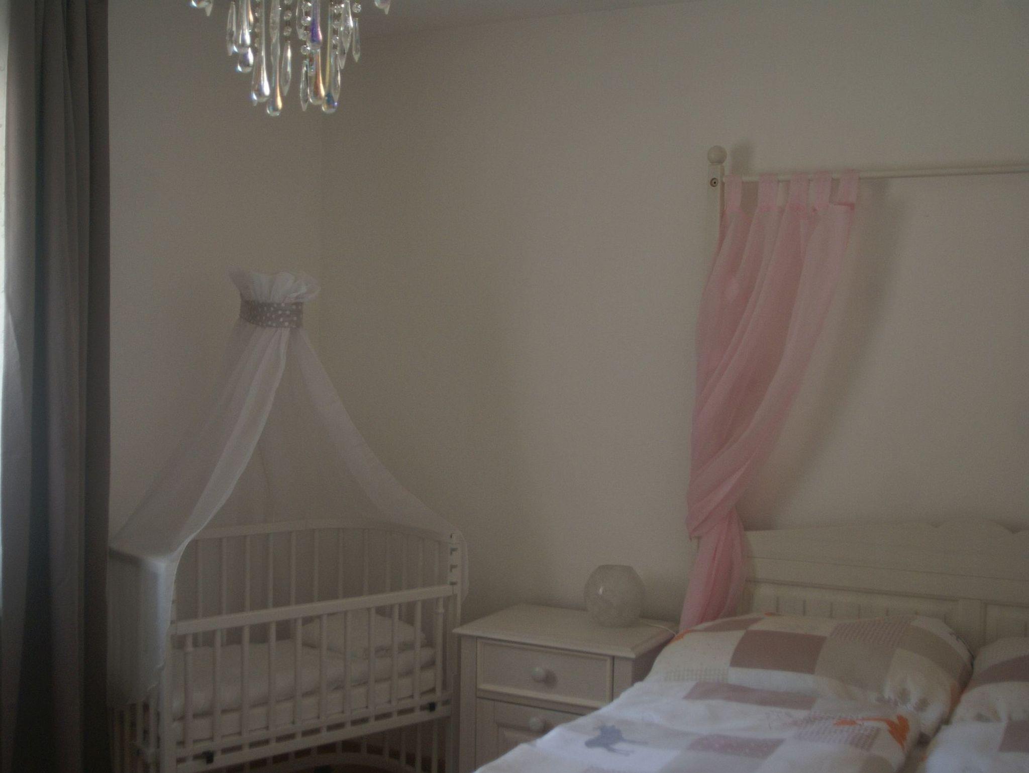 Ein kleines, liebevoll eingerichtetes Schlafzimmer mit breitem Bett und Babybettchen befinden sich ebenfalls im Erdgeschoss. Im Obergeschoss befinden sich drei große Schlafzimmer, alle mit Balkon, eines ca. 24 qm groß mit Doppelbett und einem Gitterbett für unsere kleinen Gäste. Die beiden anderen sind jeweils mit einem 140 cm breiten Bett und einer Couch oder Relax-Ecke ausgestattet. Badewanne und Dusche im geräumigen Badezimmer ergänzen unser Obergeschoss. Es befindet sich in jedem Stockwerk ein WC. Handtücher sowie Bett- und Tischwäsche stehen natürlich zur Verfügung. Auf Wunsch werden auch ein Wickeltisch mit Babybadewanne, Kinderhochstühle und zusätzliche Kinderbetten zur Verfügung gestellt.