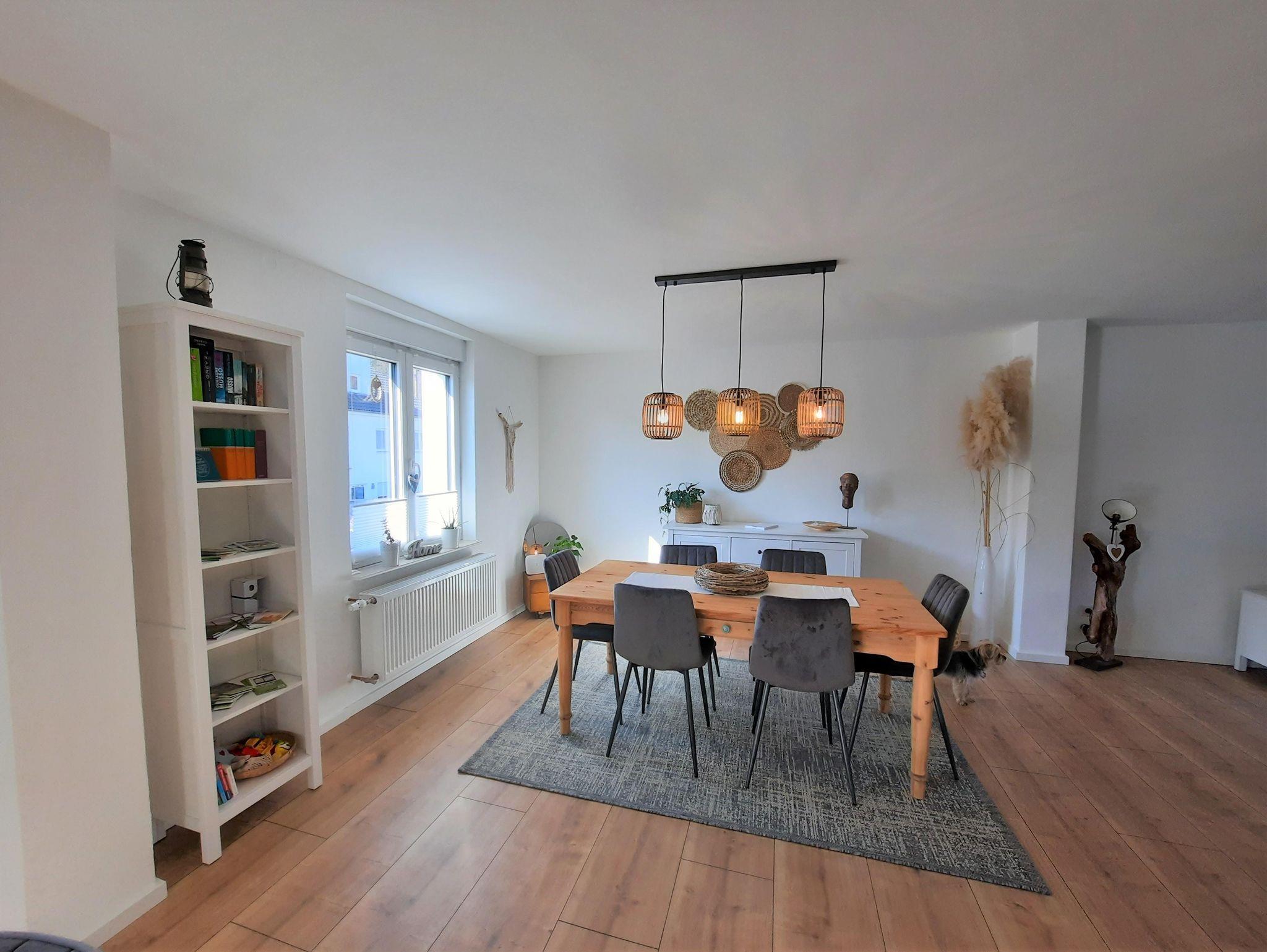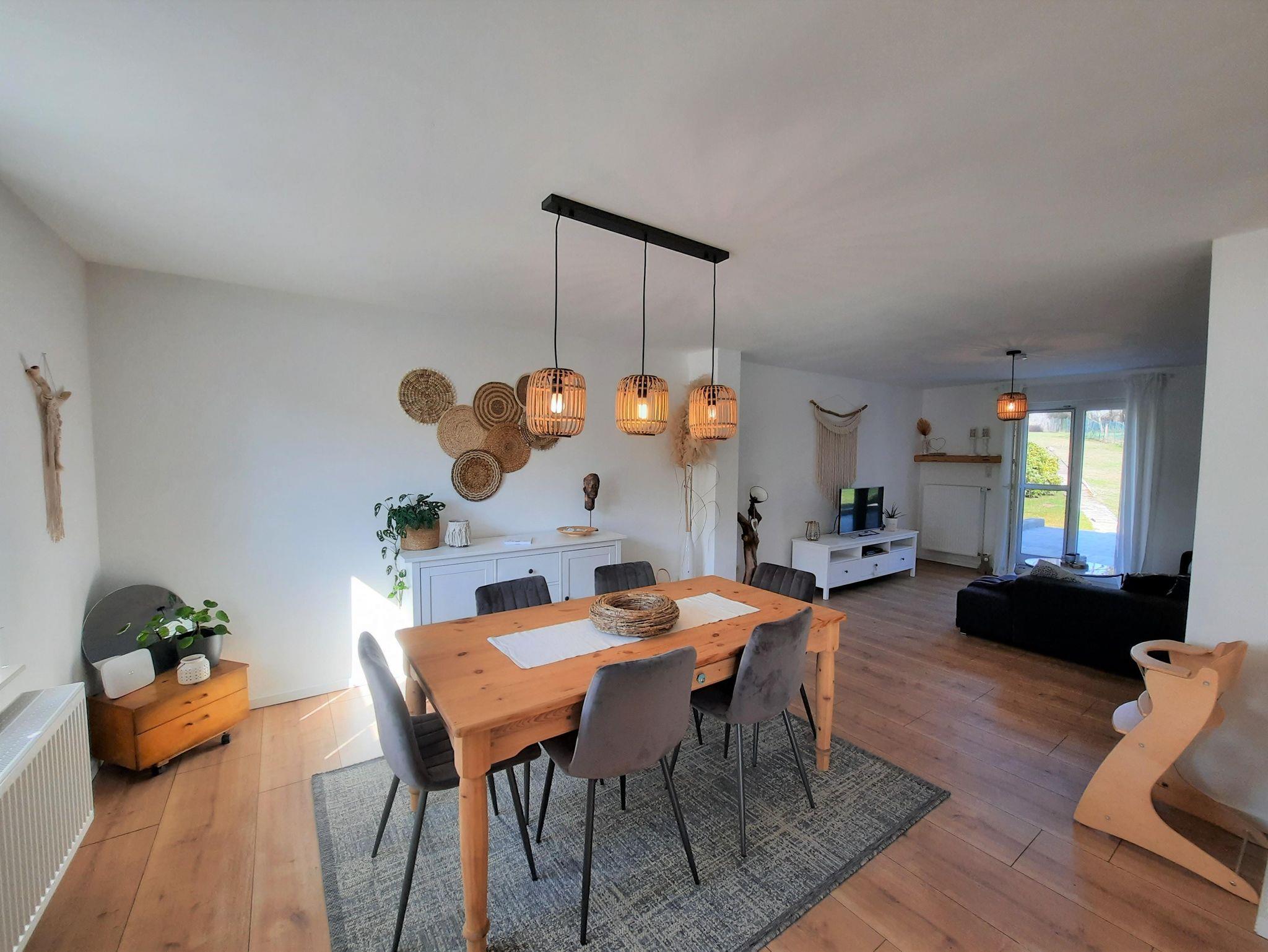 Dieses 100 m² große Einfamilienhaus steht Ihnen zur Alleinnutzung zur Verfügung. Im Erdgeschoss erwarten Sie ein großzügiger Wohnbereich mit gemütlicher Wohnlandschaft, eine moderne Einbauküche & ein Esszimmer mit Zugang zur großen Terrasse & dem 10 Ar Garten. Im Obergeschoss befinden sich 2 Schlafzimmer (Doppelbetten & Gitterbett) sowie ein Bad mit Dusche & Badewanne. WLAN, Bettwäsche & Handtücher inklusive. Stellplatz & Garage vorhanden.