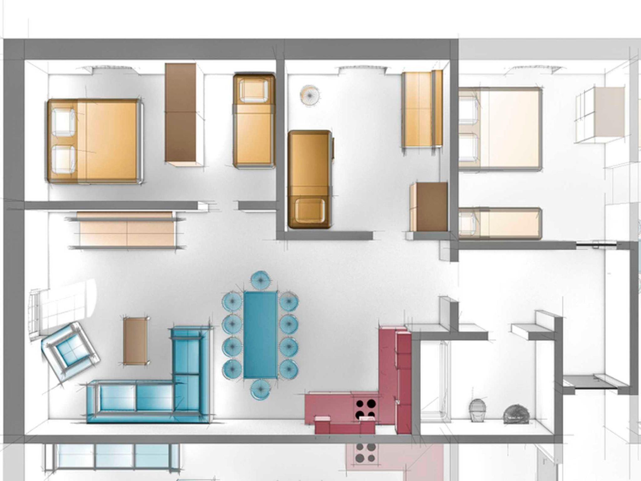 Diese Wohnung lässt sich mit Wohnung 3 zu einer großen Wohnung verbinden. Die Verbindungstür ist zwischen Kinderzimmer von Wohnung 4 und Schlafzimmer von Wohnung 3.