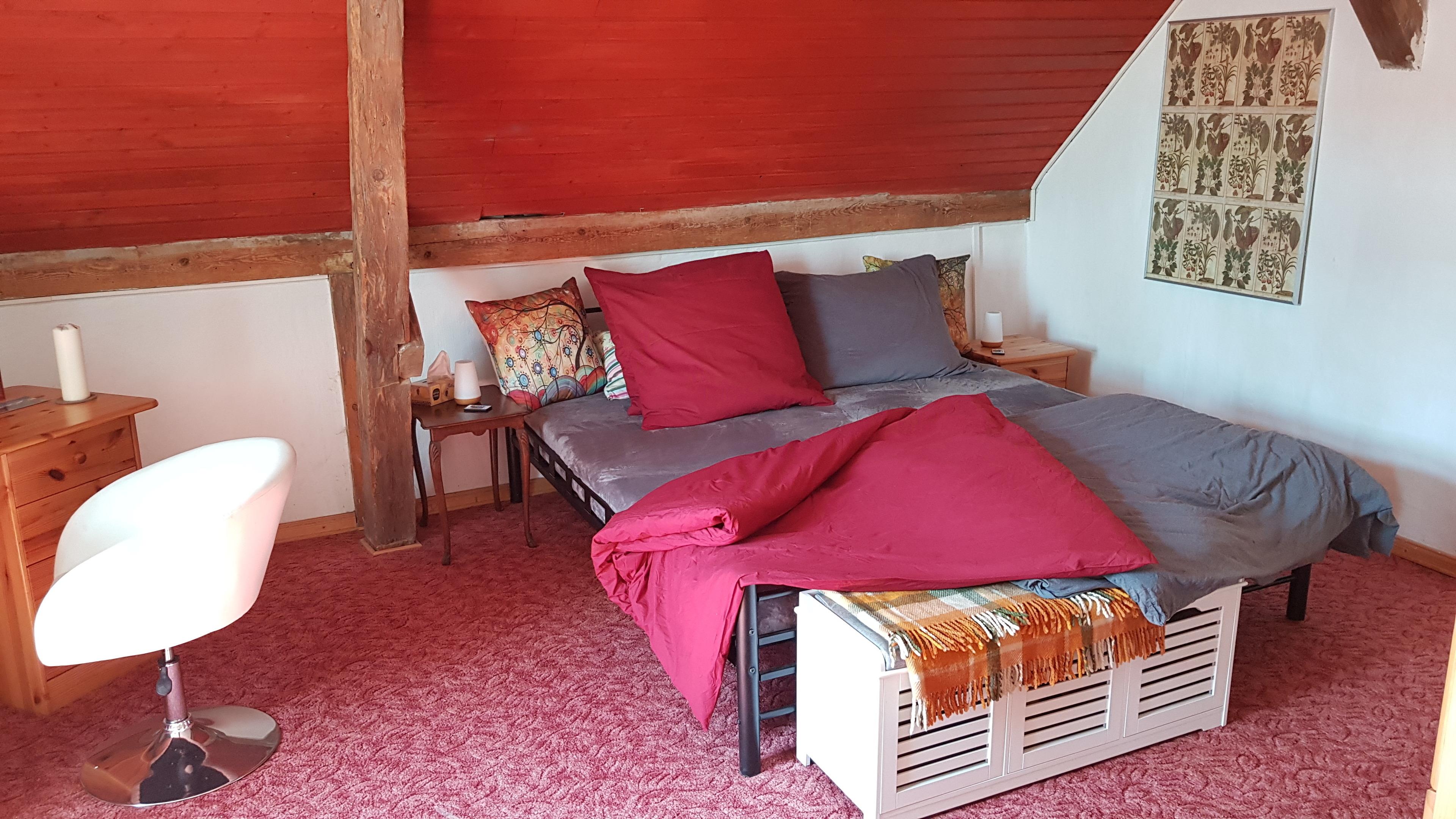 Zweiraumwohnung, 60 m² im 1. Stockwerk. Das Oberstübchen im Alten Pfarrhaus hat einen besonderen Charme mit alten Balken und Türen und bietet dennoch alle modernen Annehmlichkeiten. Das Haus ist umgeben von einem traumhaft großen Garten mit altem Baumbestand.