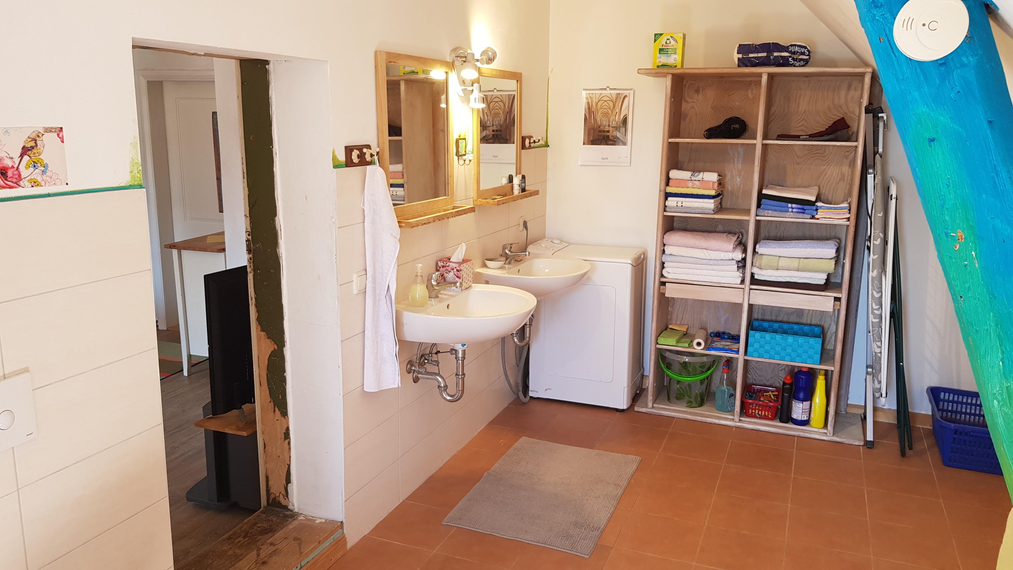 Das Bad hat zwei Waschbecken nebeneinander, eine Dusche und eine Waschmaschine.