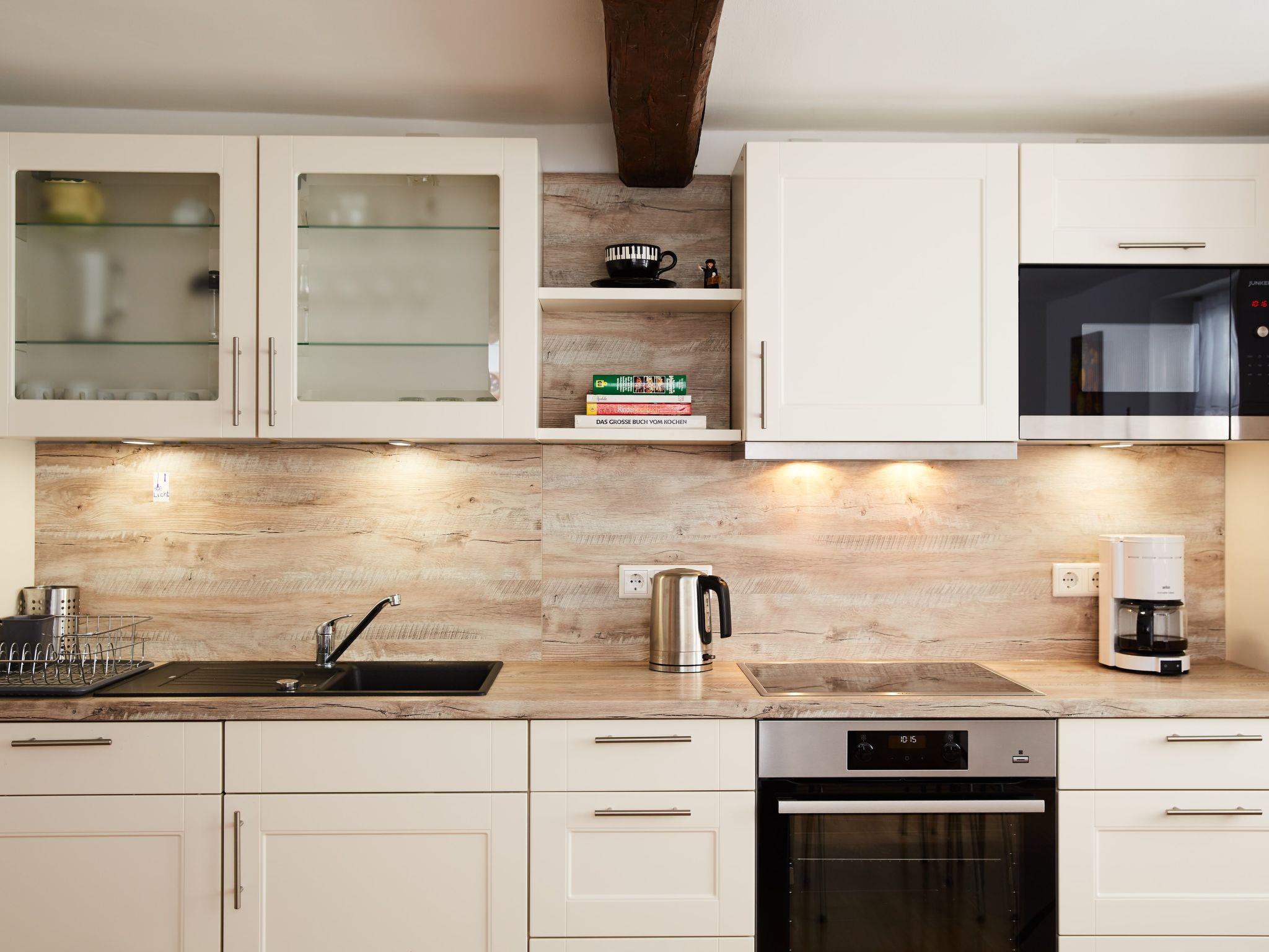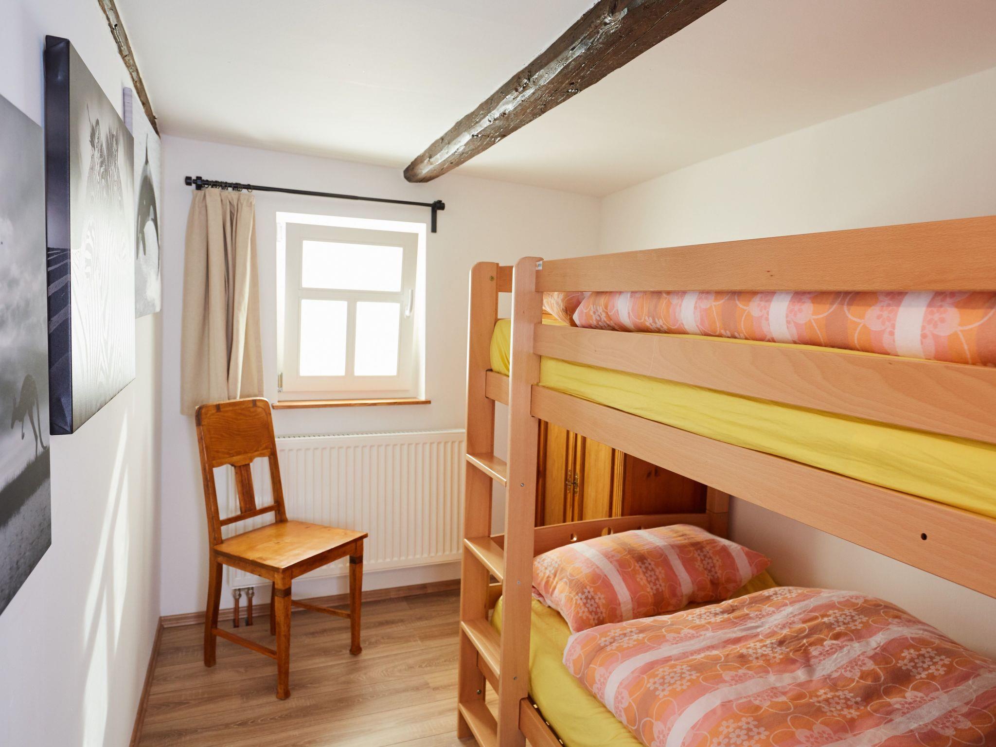 Your holiday home is a former village tavern from 1602. The listed half-timbered house was extensively renovated in all trades between 2009 and 2011 and today presents itself as a contemporary gem with two living rooms (one with a fireplace and play corner for the kids), an eat-in kitchen from 2018 with a large old dining table, four bedrooms (three of them with double beds, one with bunk beds), two bathrooms (one with a shower and one with a bathtub), adjoining rooms and a 200 m2 garden. The house is located directly in the old village centre of Behringen (near the castle and the church) and has a living space of 120 m2. In the 3rd quarter of 2021, all rooms were renovated and then refurnished. The old floorboards in the two living rooms and one bedroom were sanded down and resealed, the floor coverings in the other rooms were renewed and then the entire house was repainted.a small stream flows in front of the property, a bridge leads to the property! In the rooms on the upper floor, the ceiling height is lower than in new buildings, as is usual in these old houses.