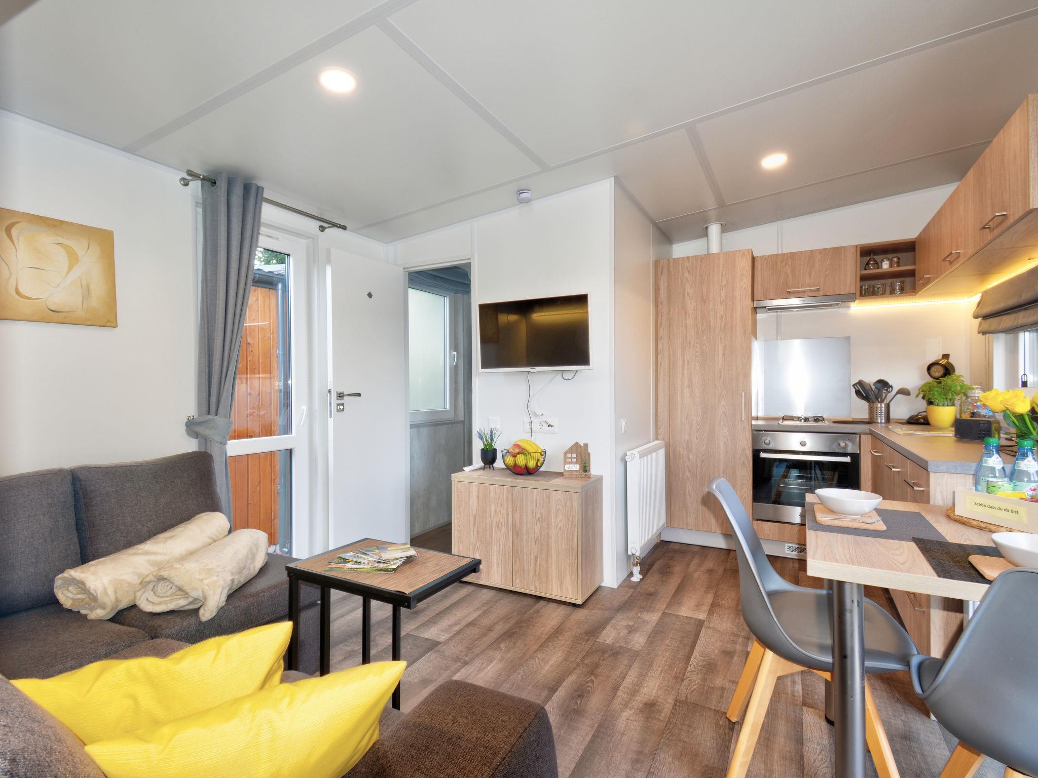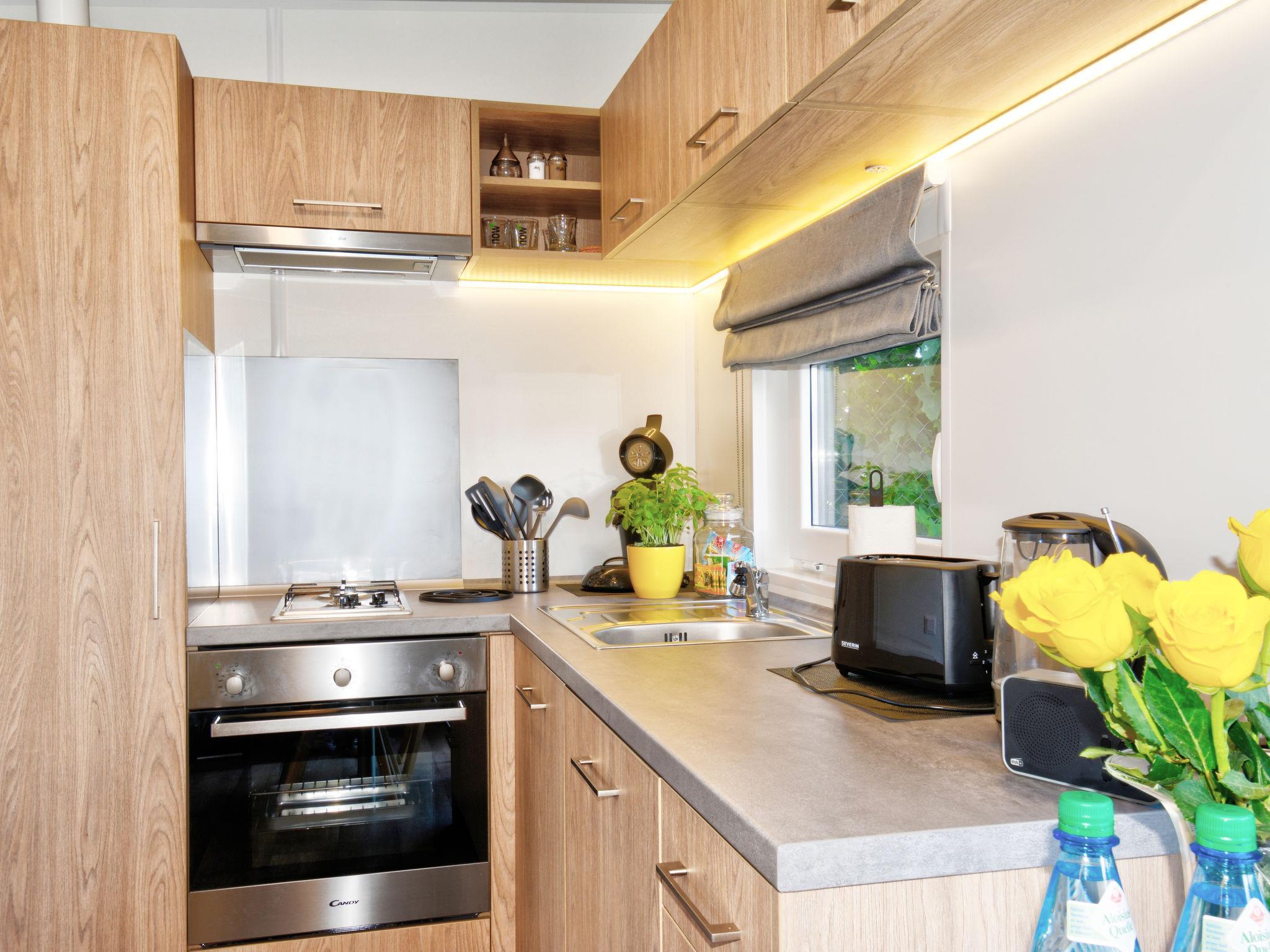 "Tiny Haus Kuschelnest", 2-room mobile home 25 m2. Object suitable for 2 adults + 2 children. Cosy furnishings: living/sleeping room with 1 sofabed (120 cm, length 170 cm), satellite TV. Exit to the terrace. 1 room with 1 french bed (140 cm, length 200 cm). Open kitchen (oven, Gas stove, 2 gas rings, kettle, electric coffee machine). Shower/WC. Gas heating. Terrace. Terrace furniture. Parking (1 car) at the house. Please note: non-smoking house. Maximum 1 pet/ dog allowed.