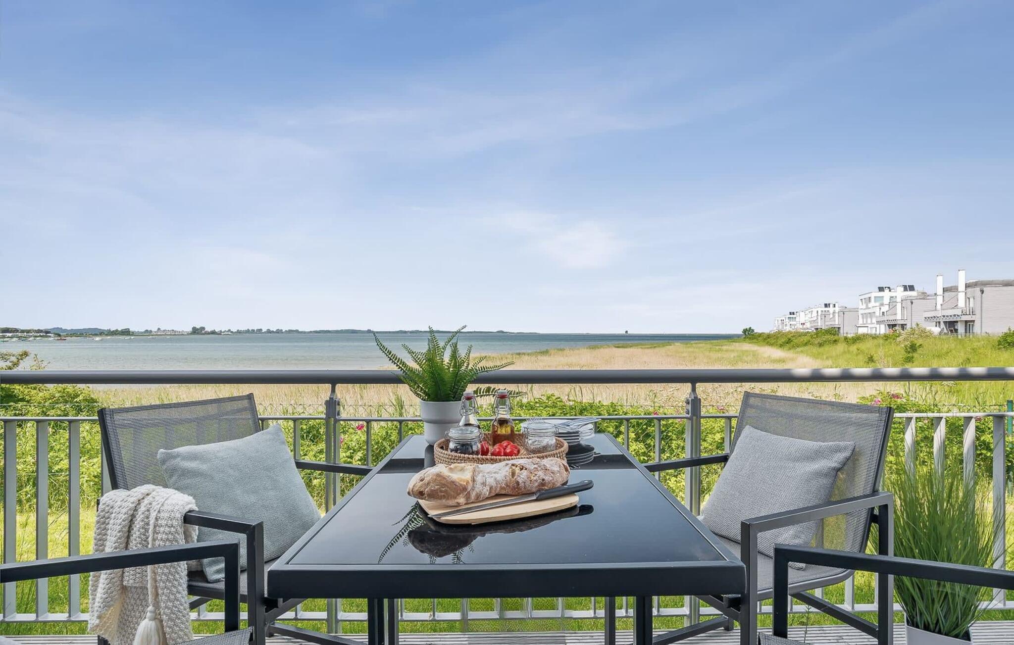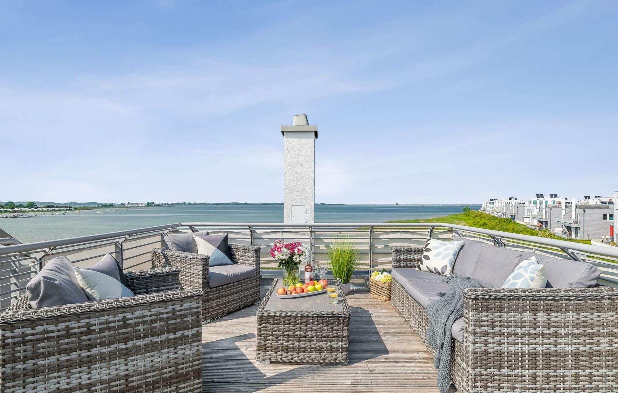 Vårt favorittsted: Den store takterrassen med loungemøbler, som gir en allsidig utsikt over den brede Schlei og seil- og sportsbåthavnen i Østersjø-feriestedet.