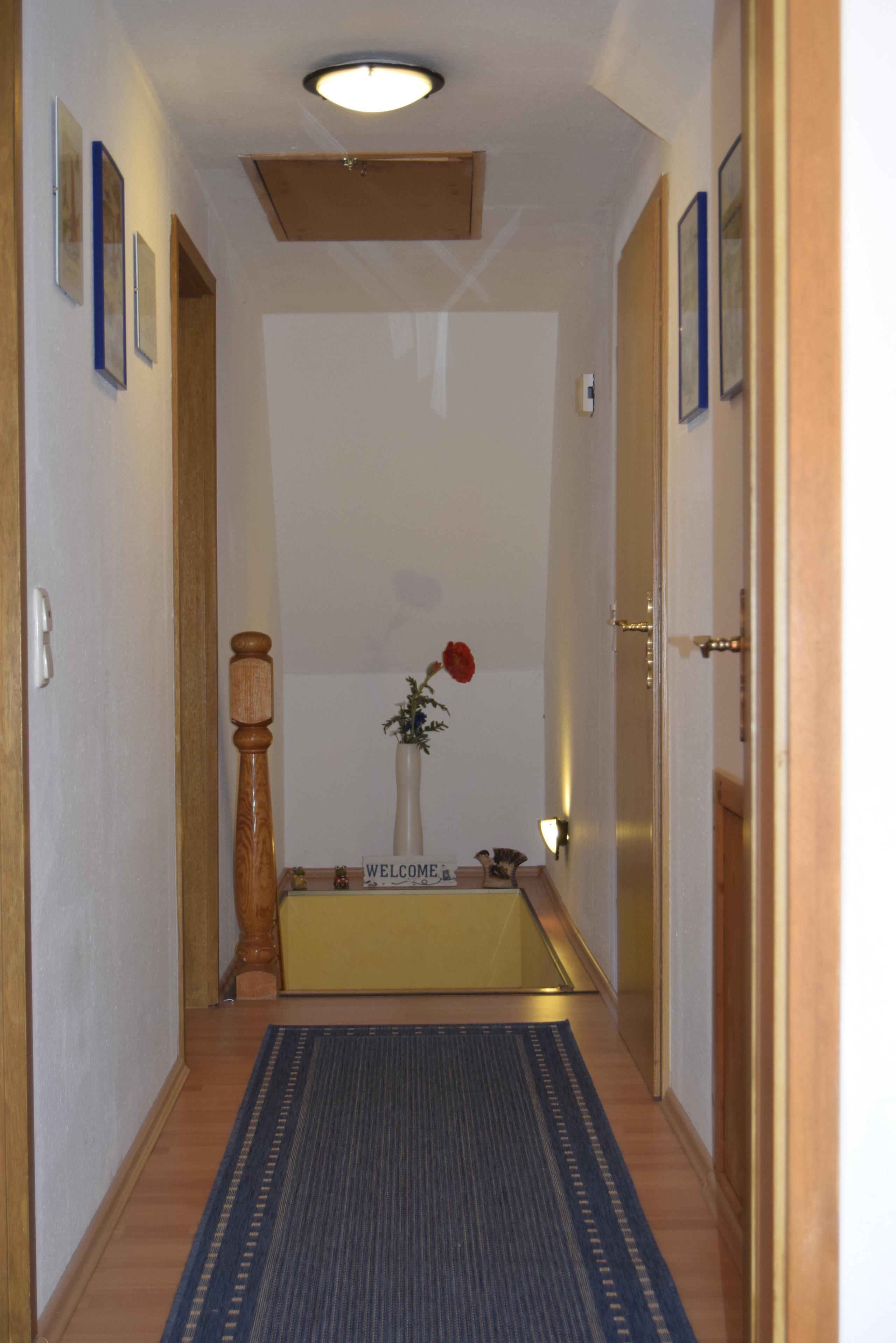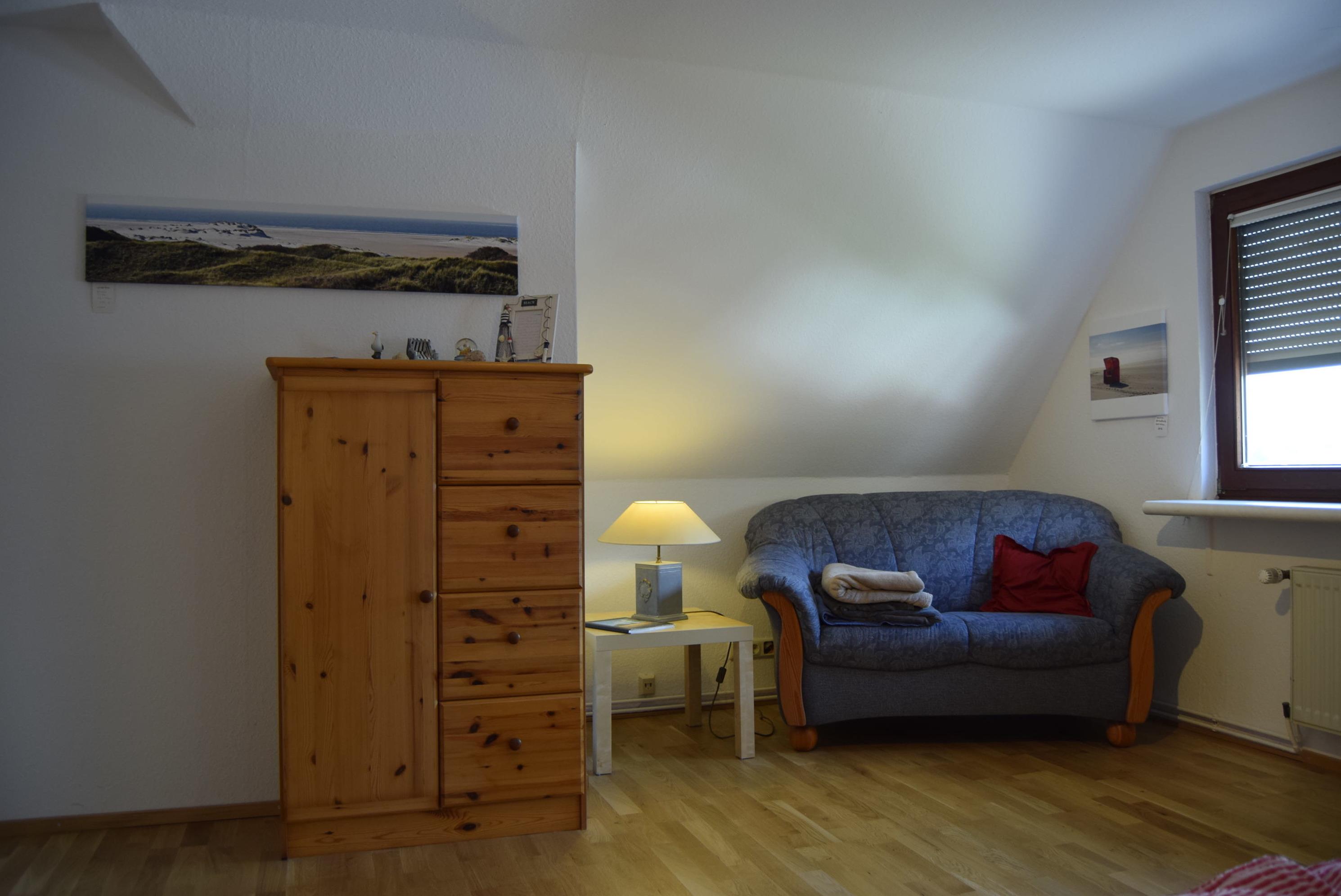 Von hier aus gelangt man ins Obergeschoss der Wohnung. Dort befinden sich das Schlafzimmer mit Doppelbett (1,80 x 2,00 m) sowie der kombinierte Wohn-/Schlafraum mit einer Doppelschlafcouch.