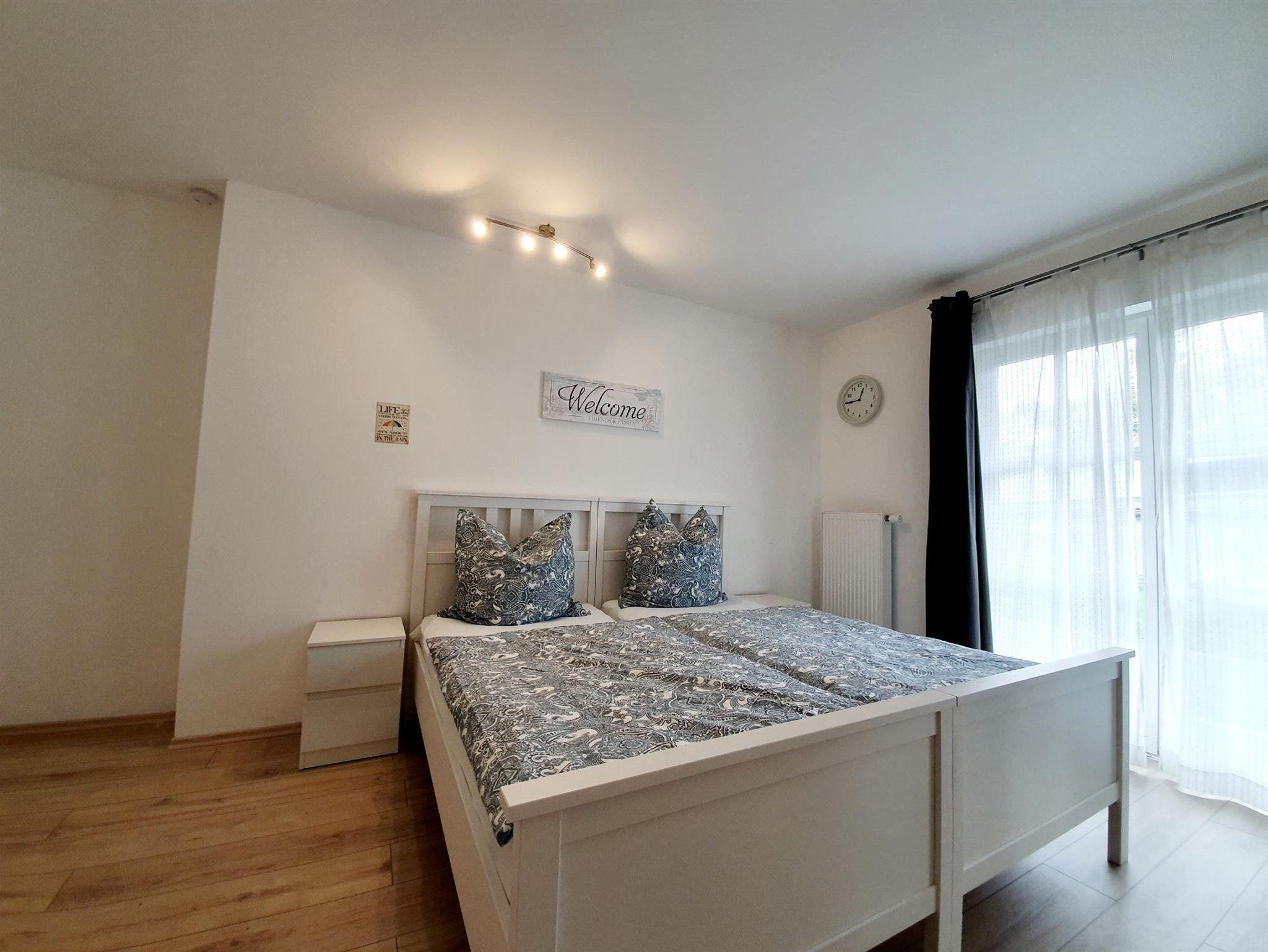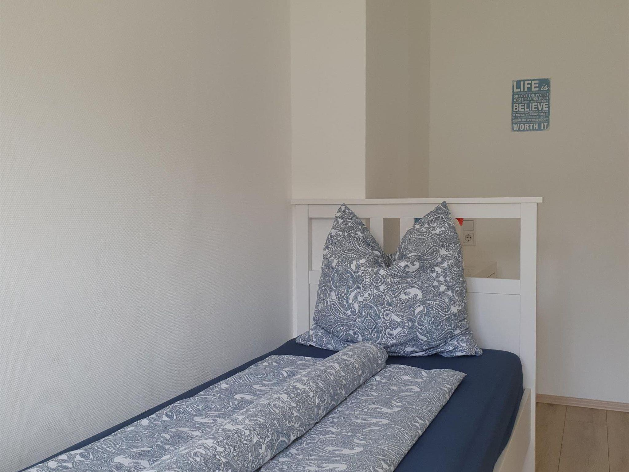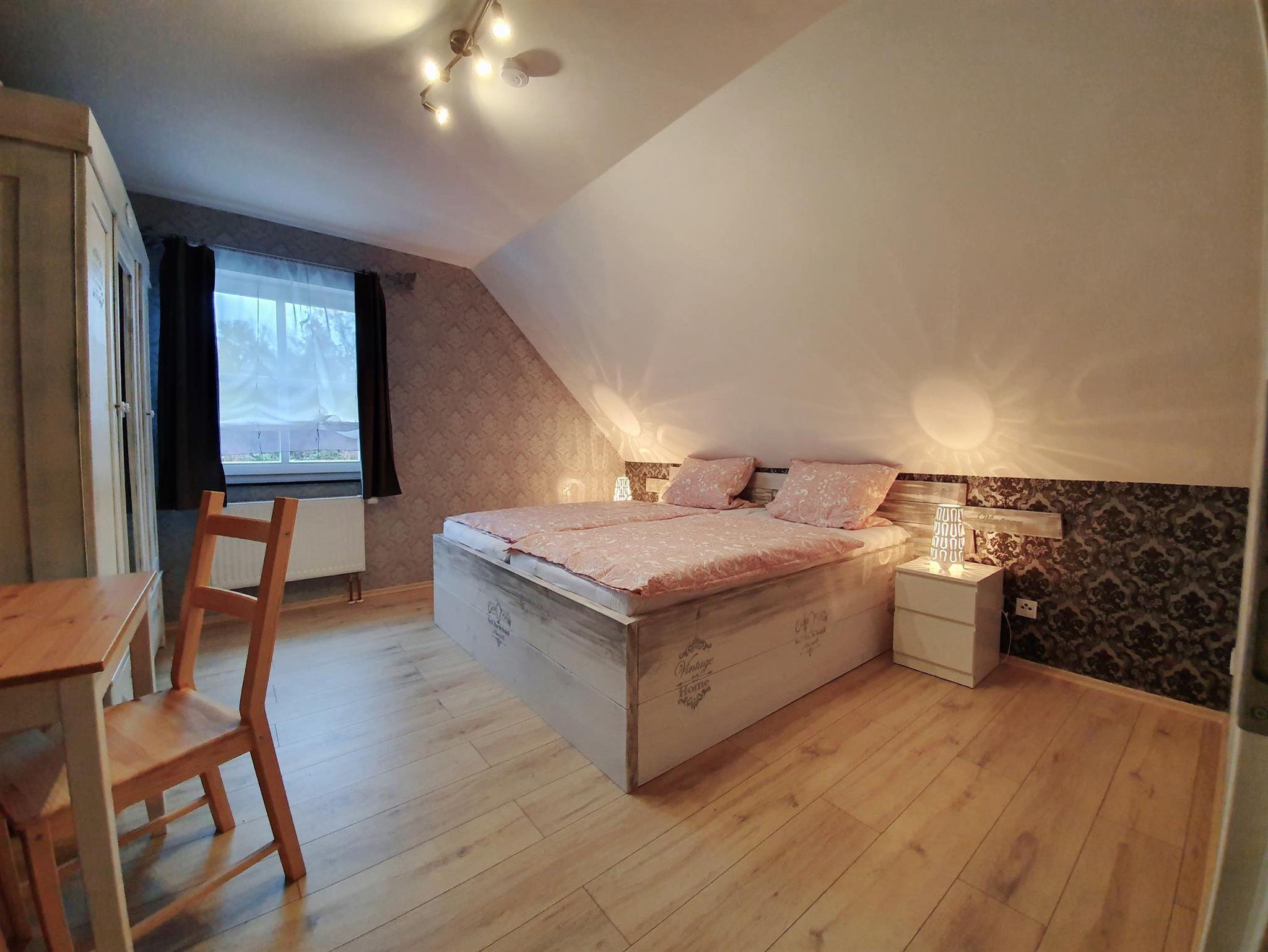 Im Obergeschoss befinden sich 3 weitere Schlafräume aufgeteilt in 3 Doppelzimmer (2 Zimmer mit 2 Doppelbetten und 1 Zimmer mit 2 Einzelbetten). In einem Doppelzimmer befindet sich ein Fernseher. Weiterhin gehört zu der komfortablen Ausstattung eine zusätzliche Single Küche, 1 Duschbad und ein großes Bad mit Badewanne und Dusche.