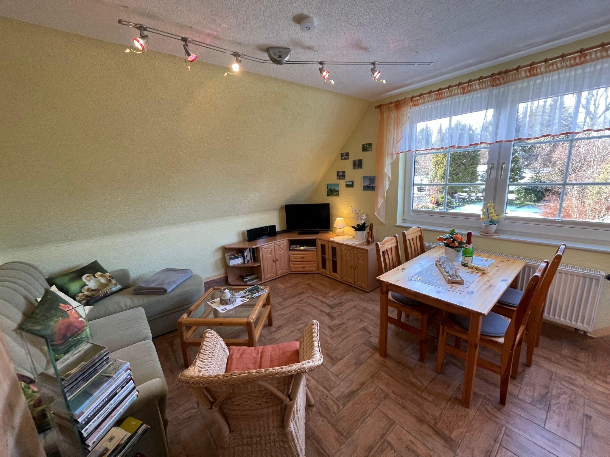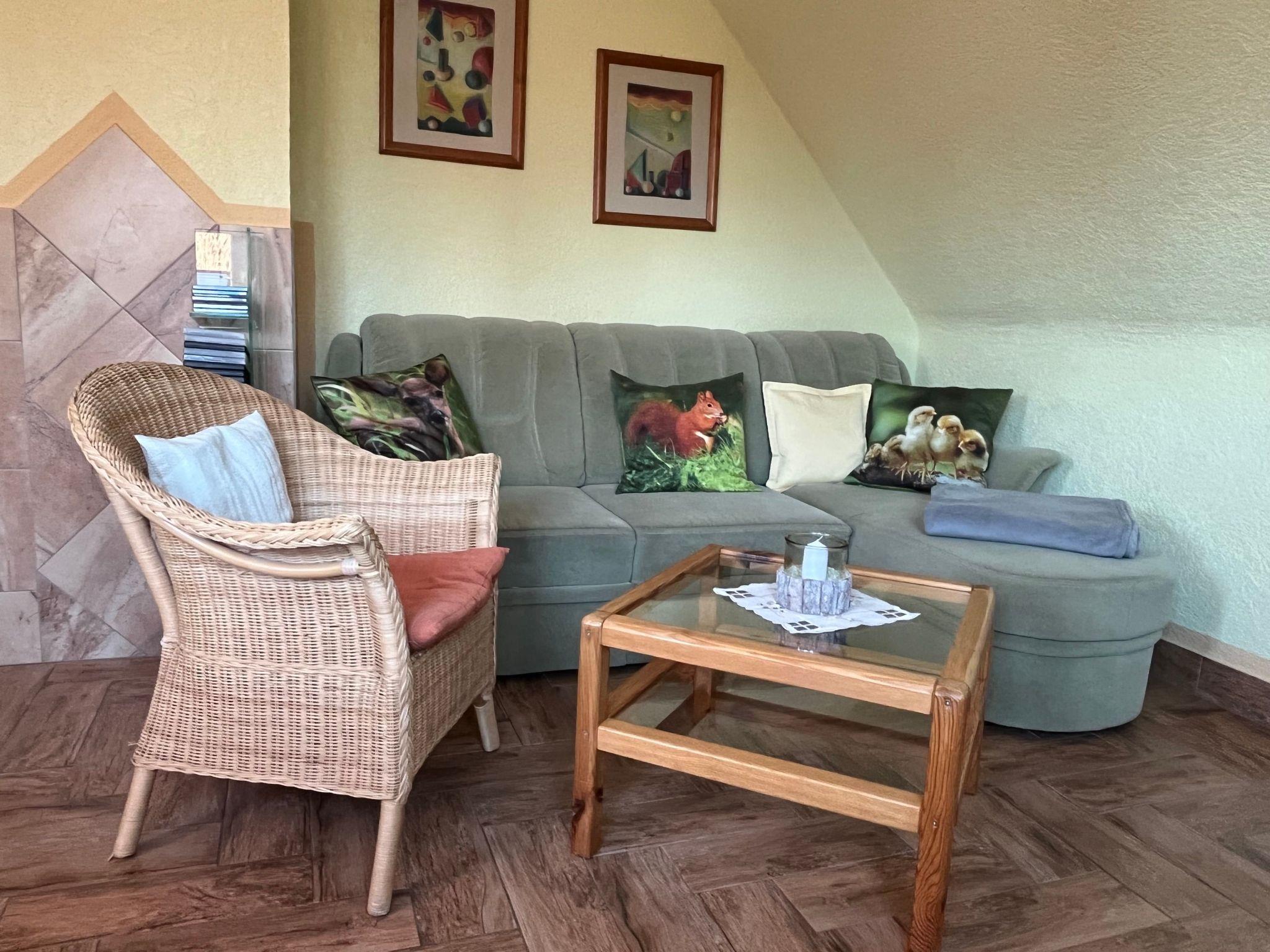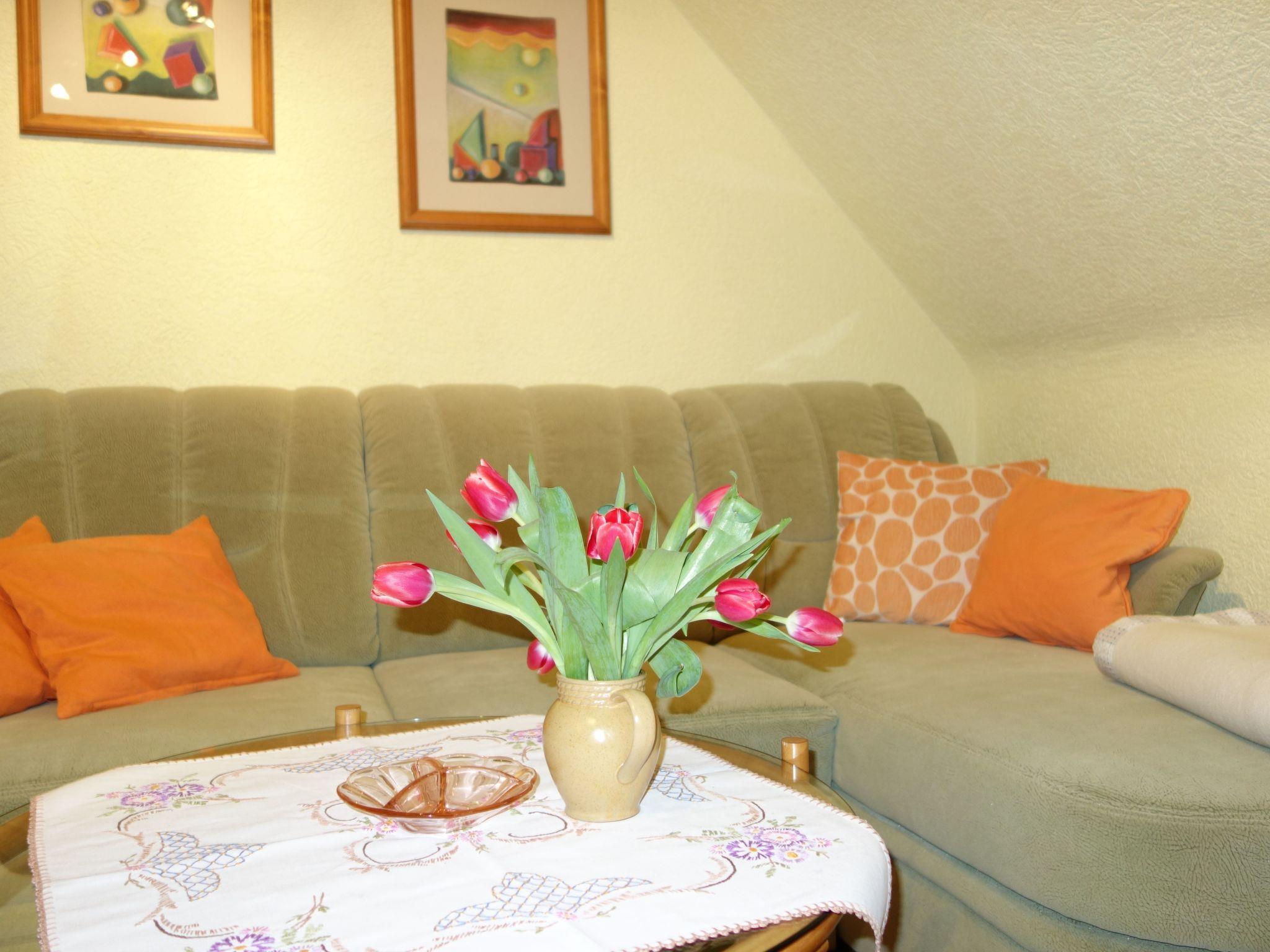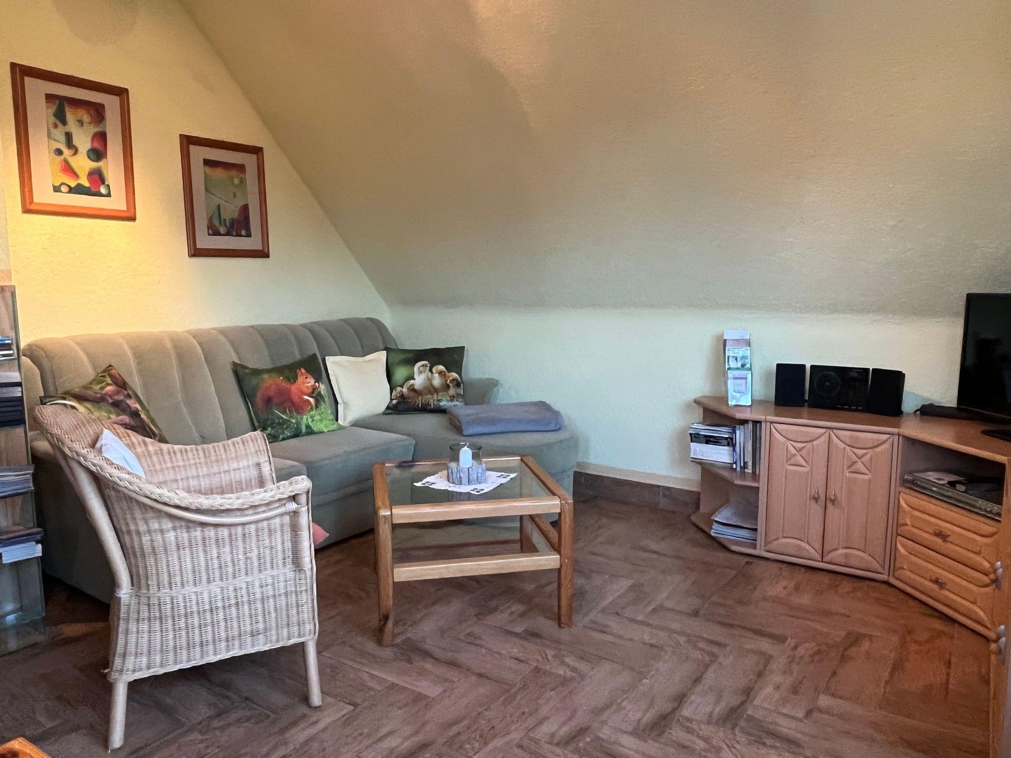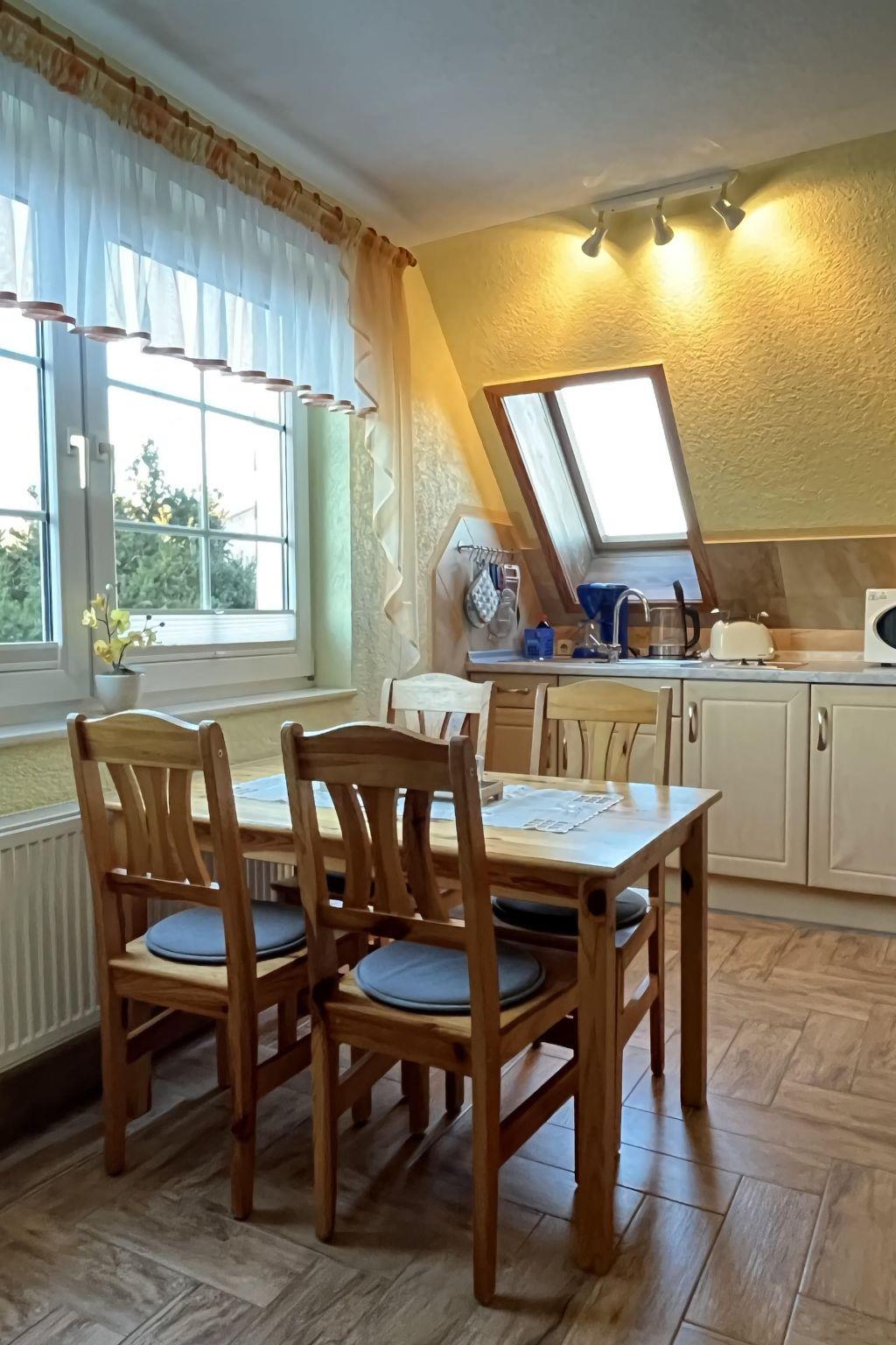 The interior of the holiday flat "Dorle" consists of 2 separate rooms on a living space of approx. 40 sqm on the 1st floor (attic). The cosy living area is furnished with a comfortable sofa set, satellite TV, radio, CD and DVD player. Adjacent is the dining area with a dining table and 4 chairs by the window with a view of the large garden and an open-plan kitchen with a skylight. The kitchen equipment includes a ceramic hob (2 hotplates), a fridge (with freezer compartment), coffee machine, toaster, kettle and microwave. Board games, books, CDs and DVDs provide entertainment on long evenings or rainy days. The bedroom has a comfortable double bed, ample storage space and a large south-facing window with a blackout blind. A daylight shower room completes the living area.