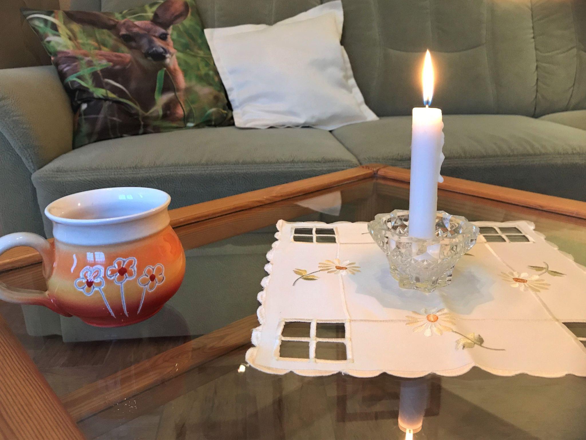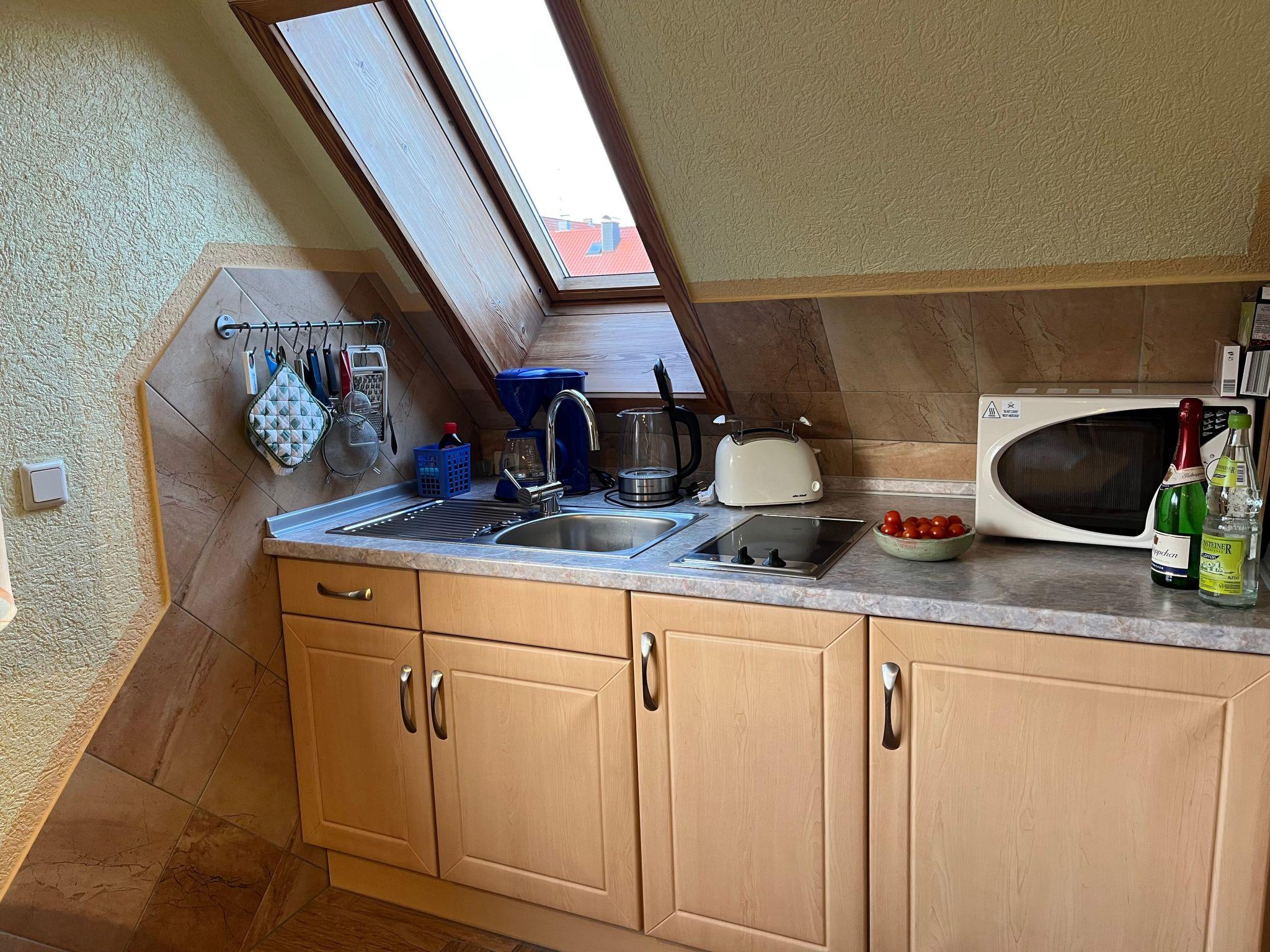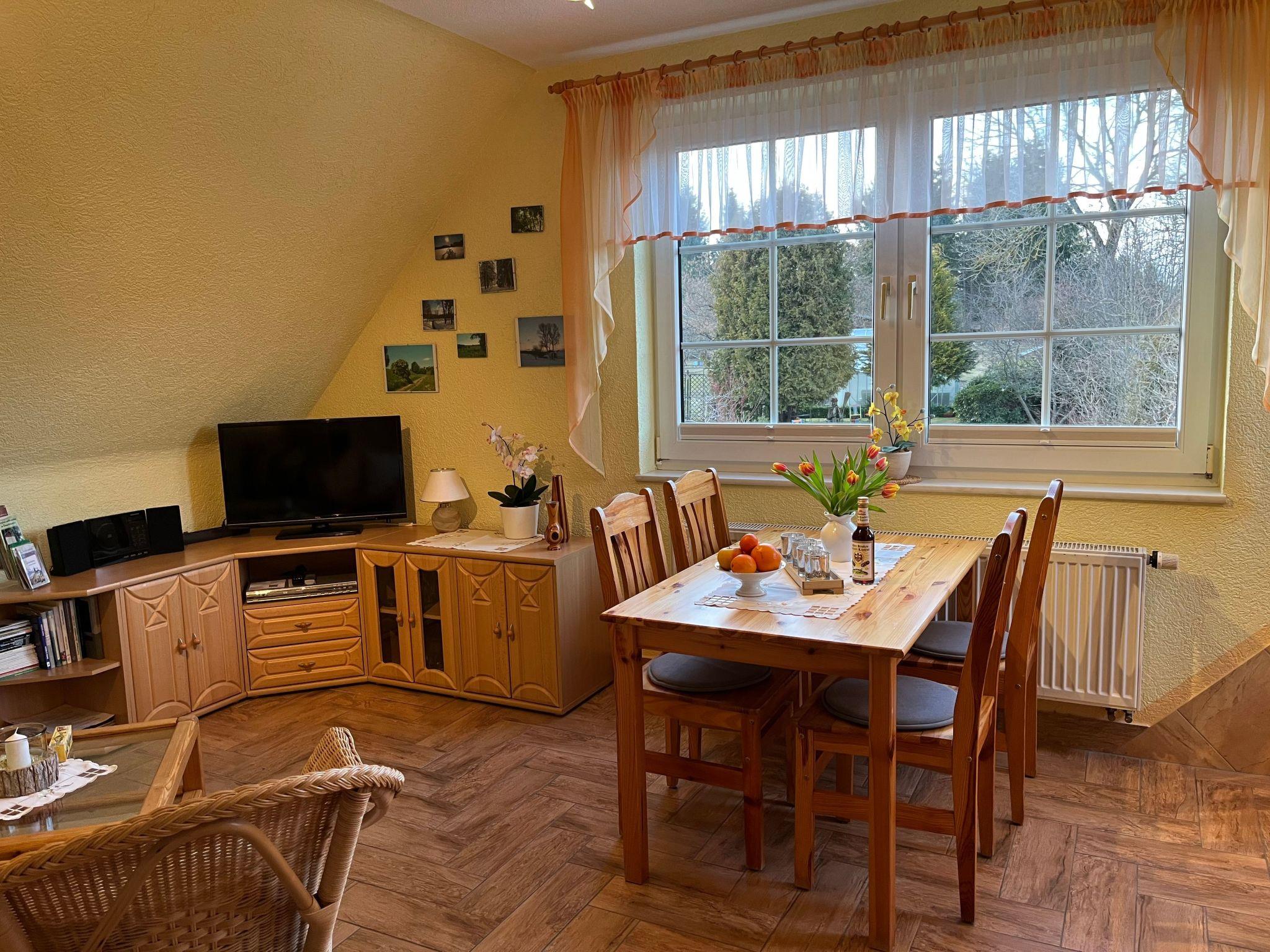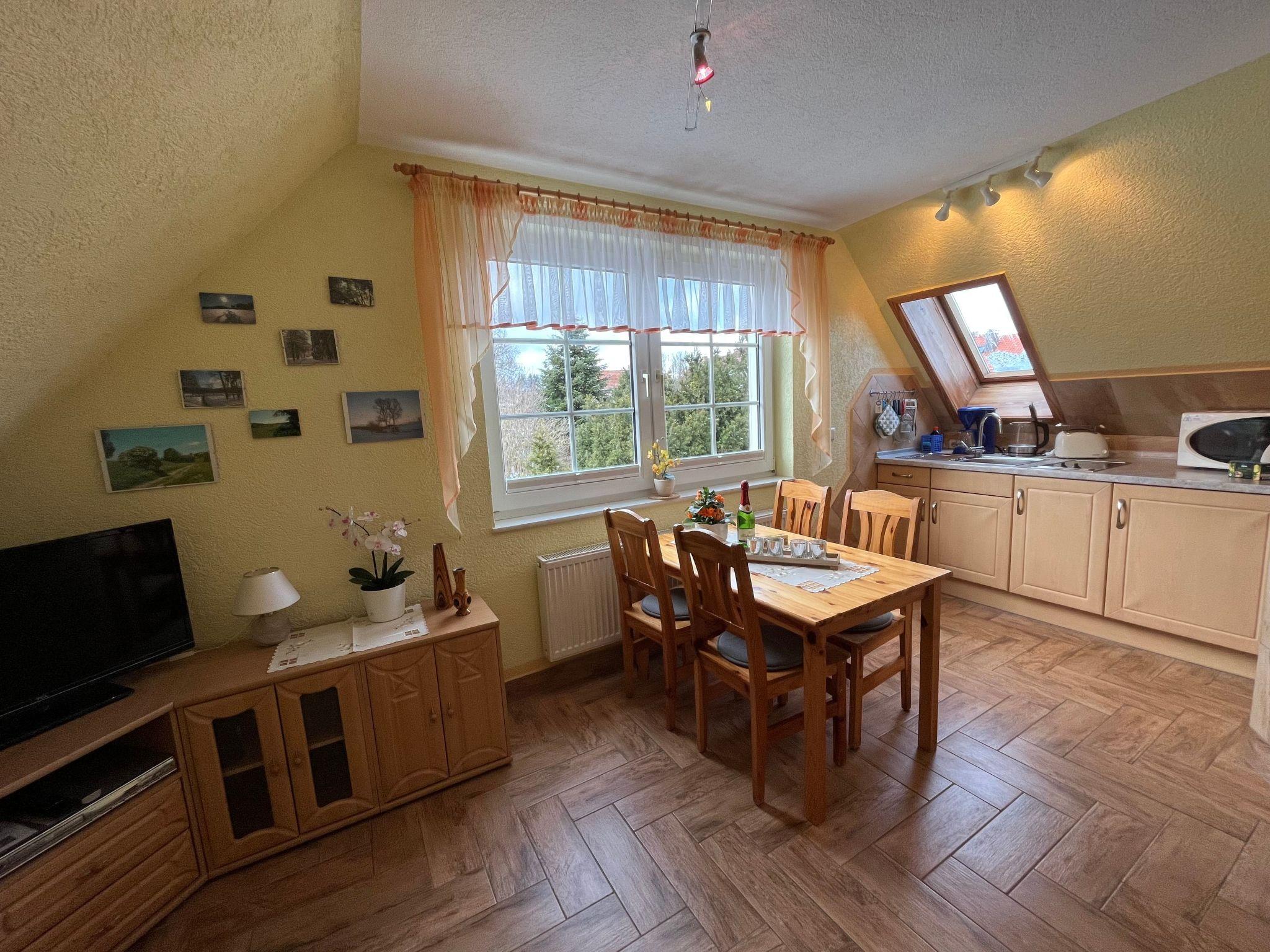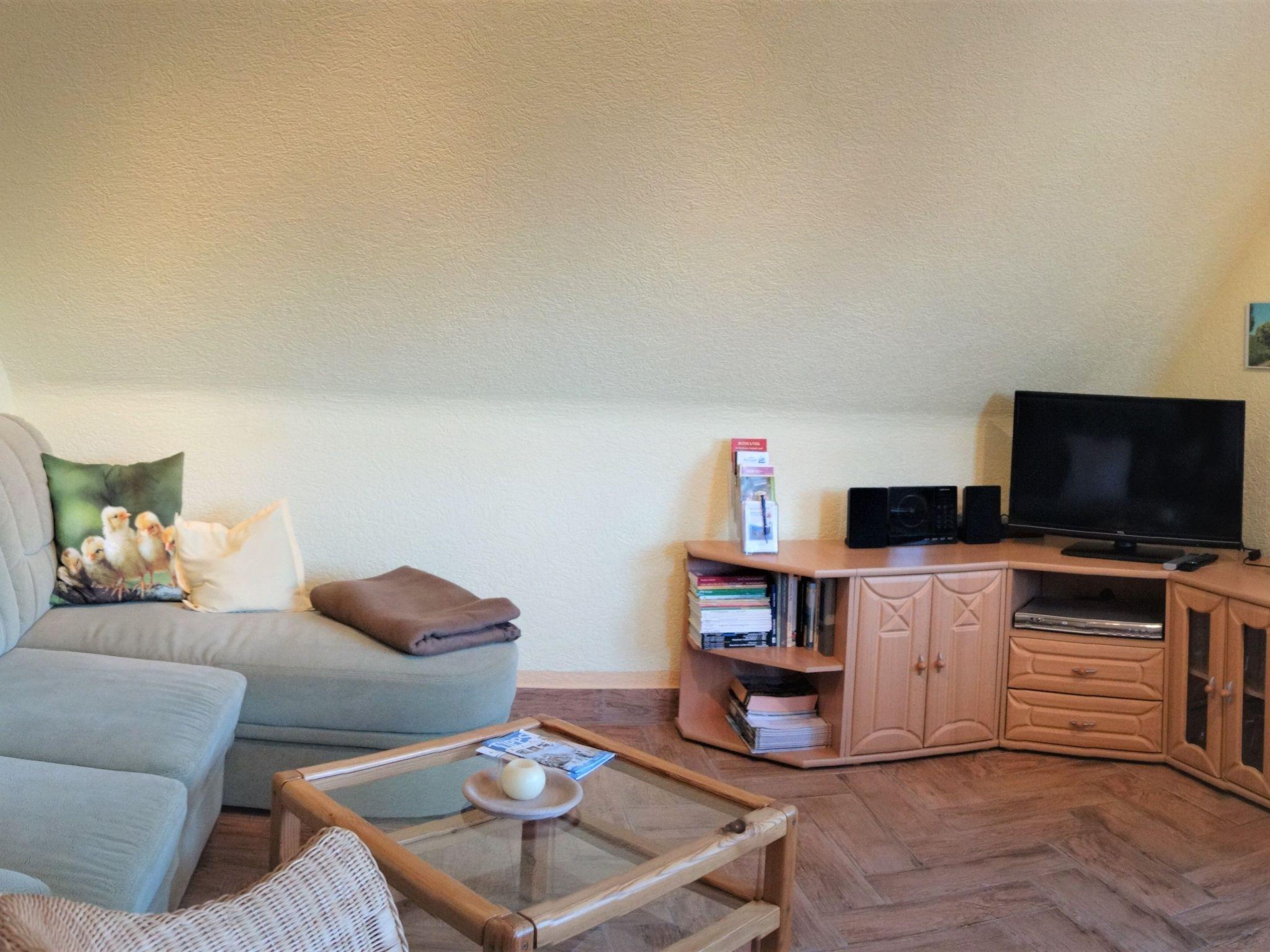 The interior of the holiday flat "Dorle" consists of 2 separate rooms on a living space of approx. 40 sqm on the 1st floor (attic). The cosy living area is furnished with a comfortable sofa set, satellite TV, radio, CD and DVD player. Adjacent is the dining area with a dining table and 4 chairs by the window with a view of the large garden and an open-plan kitchen with a skylight. The kitchen equipment includes a ceramic hob (2 hotplates), a fridge (with freezer compartment), coffee machine, toaster, kettle and microwave. Board games, books, CDs and DVDs provide entertainment on long evenings or rainy days. The bedroom has a comfortable double bed, ample storage space and a large south-facing window with a blackout blind. A daylight shower room completes the living area.