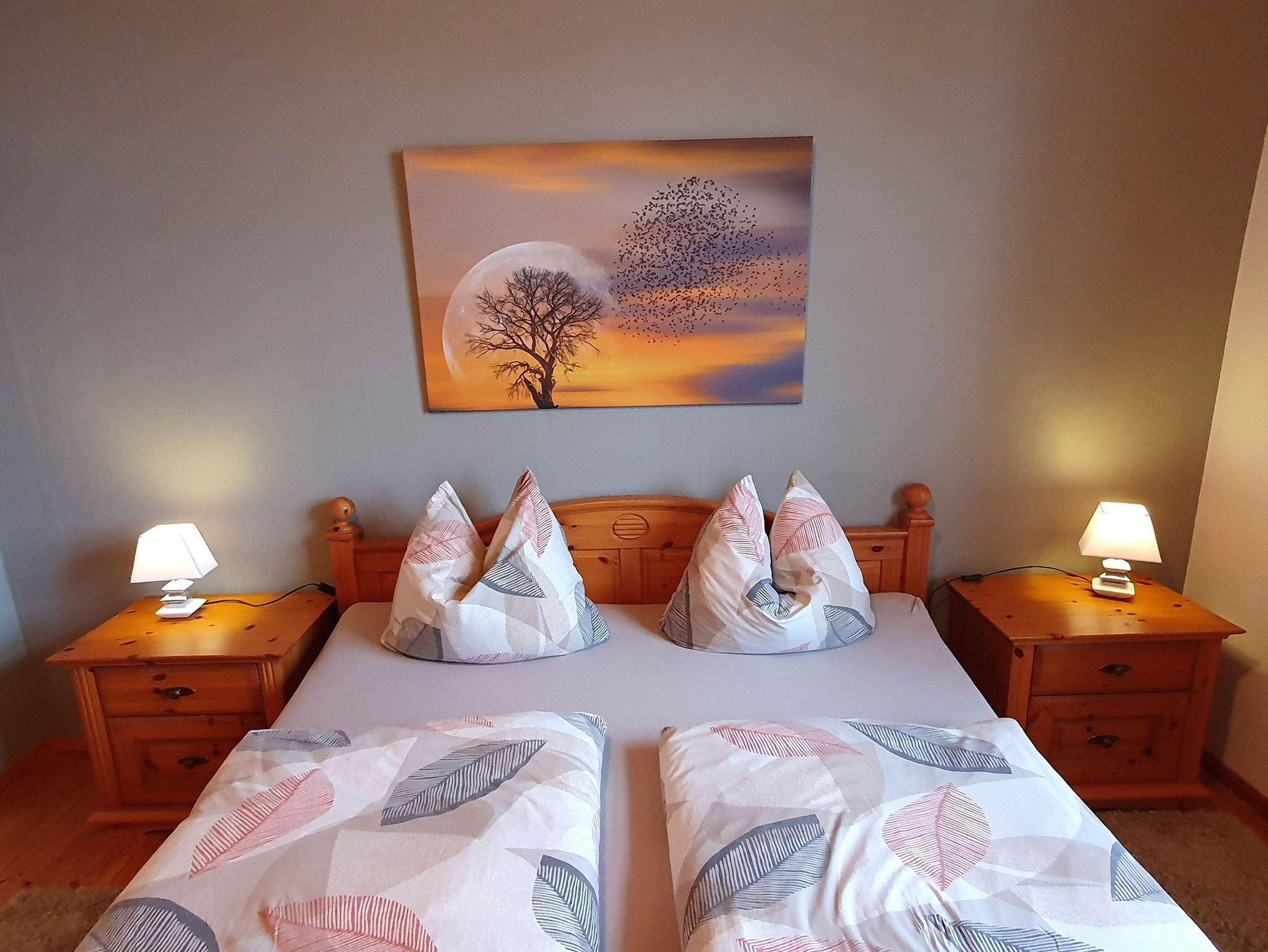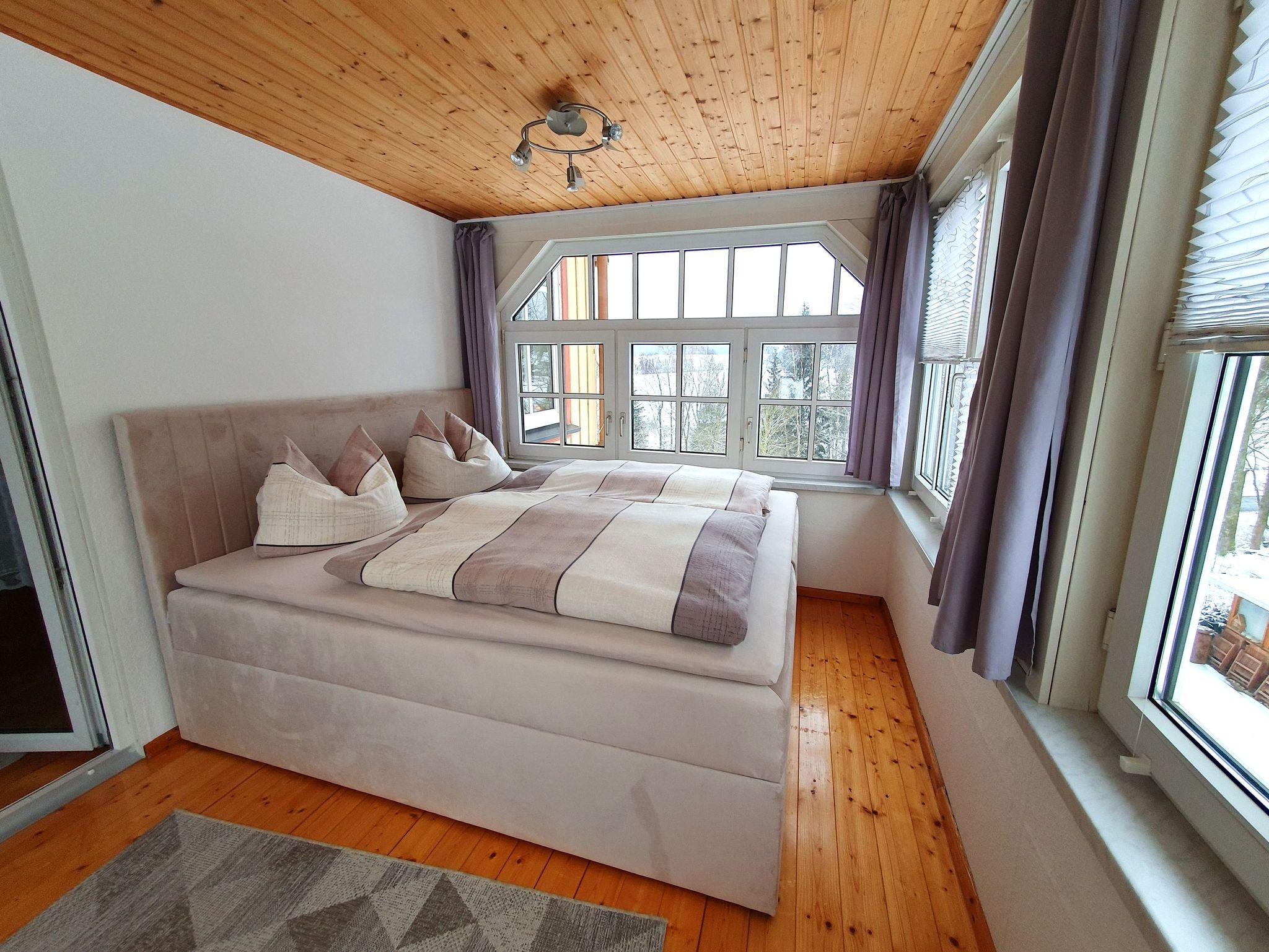 Zu der Ferienwohnung gehören zwei Schlafräume, ein Elternschlafzimmer mit einem Doppelbett und großen Kleiderschrank und eine weitere Schlafmöglichkeit in einer lichtdurchfluteten Veranda mit einem Boxspringbett. (Separater Raum)