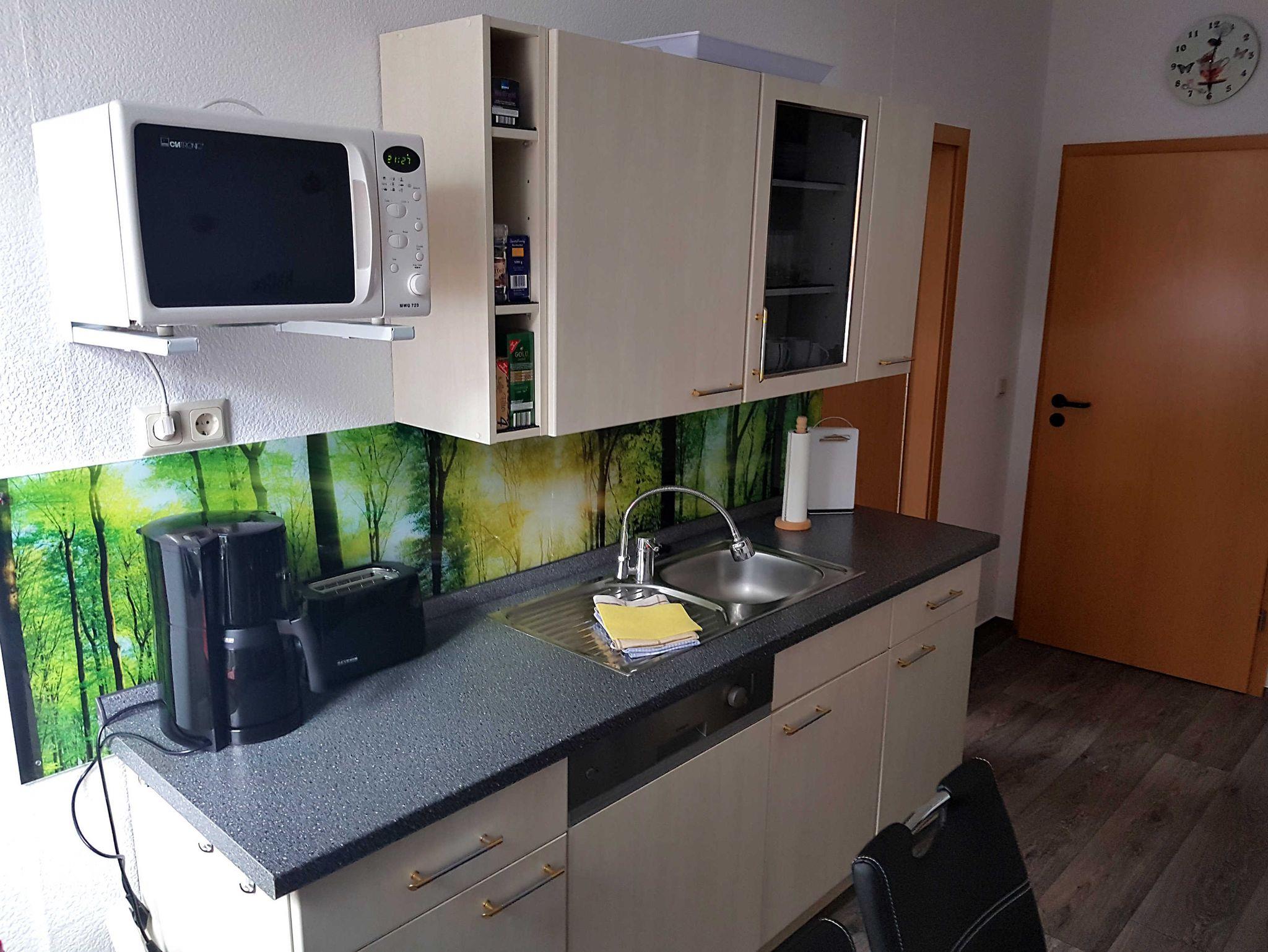 Die hell und voll ausgestattete Küche mit Backofen und Ceranfeld, Spülmaschine, Kaffeemaschine, Mikrowelle und Radio bietet Ihnen einen optimalen Start zu Ihren Touren.