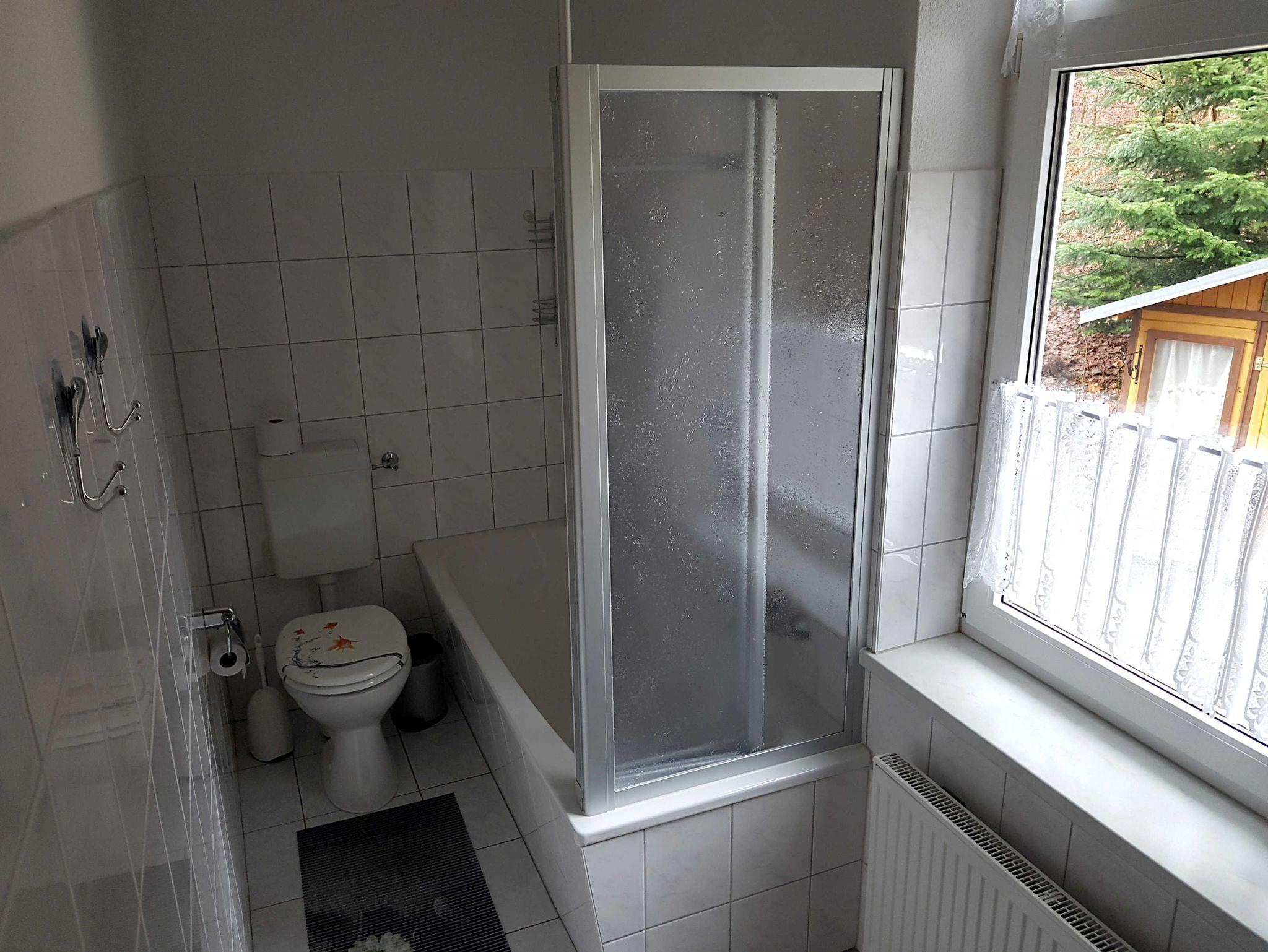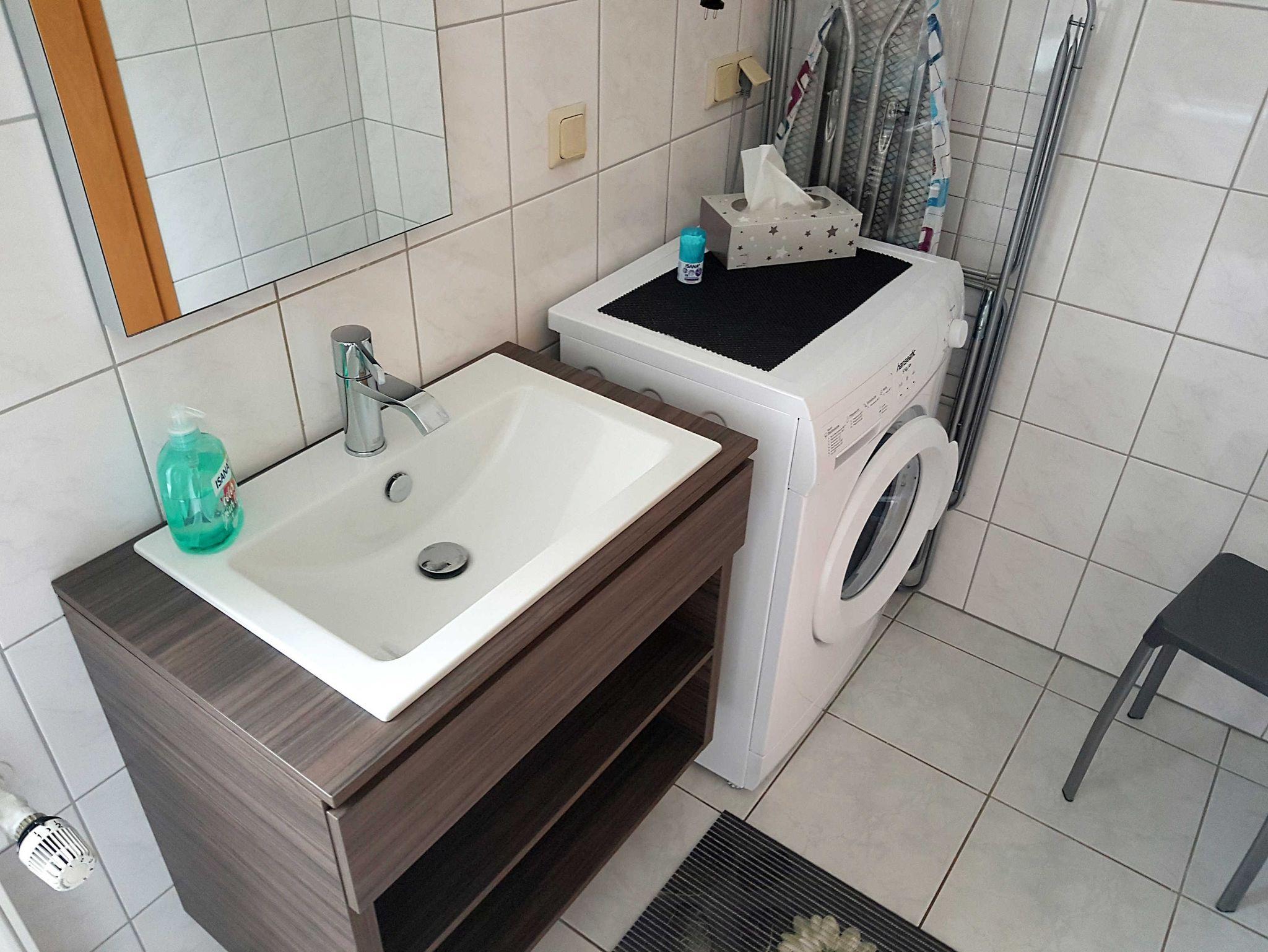 Das Bad hat ein Tageslichtfenster mit Blick auf den Wald. Es ist mit einer Badewanne mit Dusche, einer Waschmaschine, Haartrockner und einem modernen Waschtisch ausgestattet.