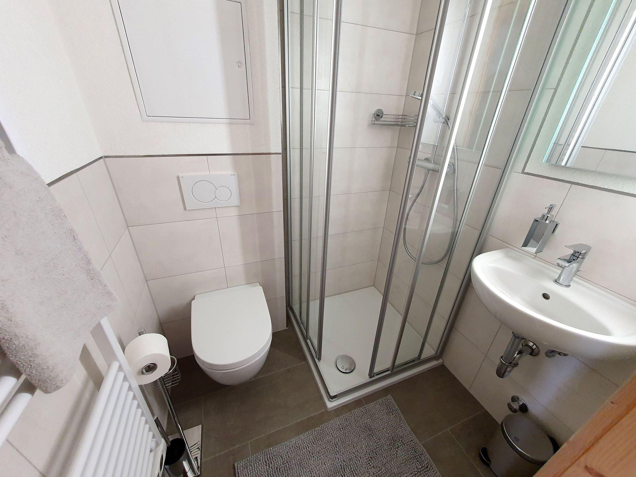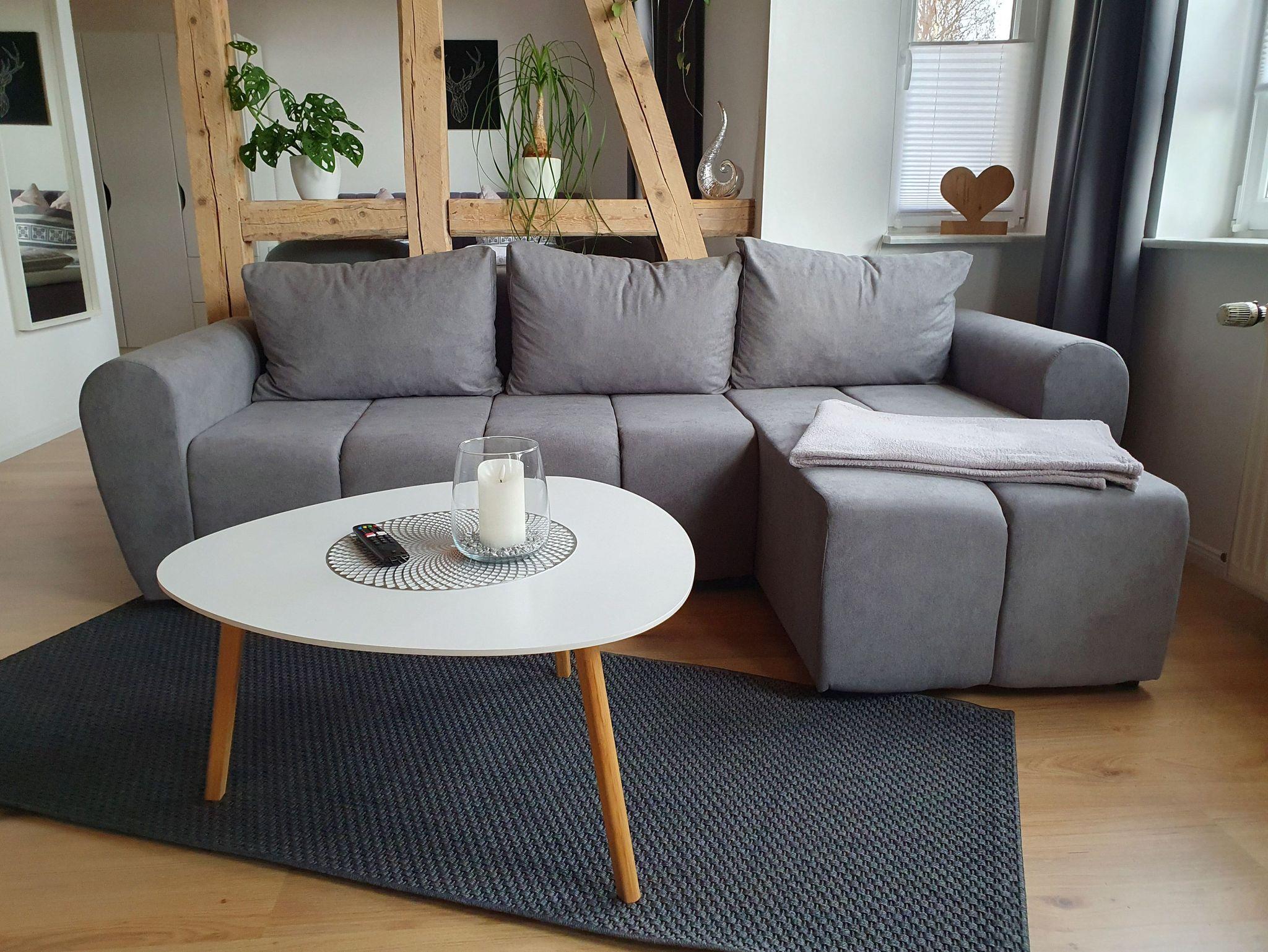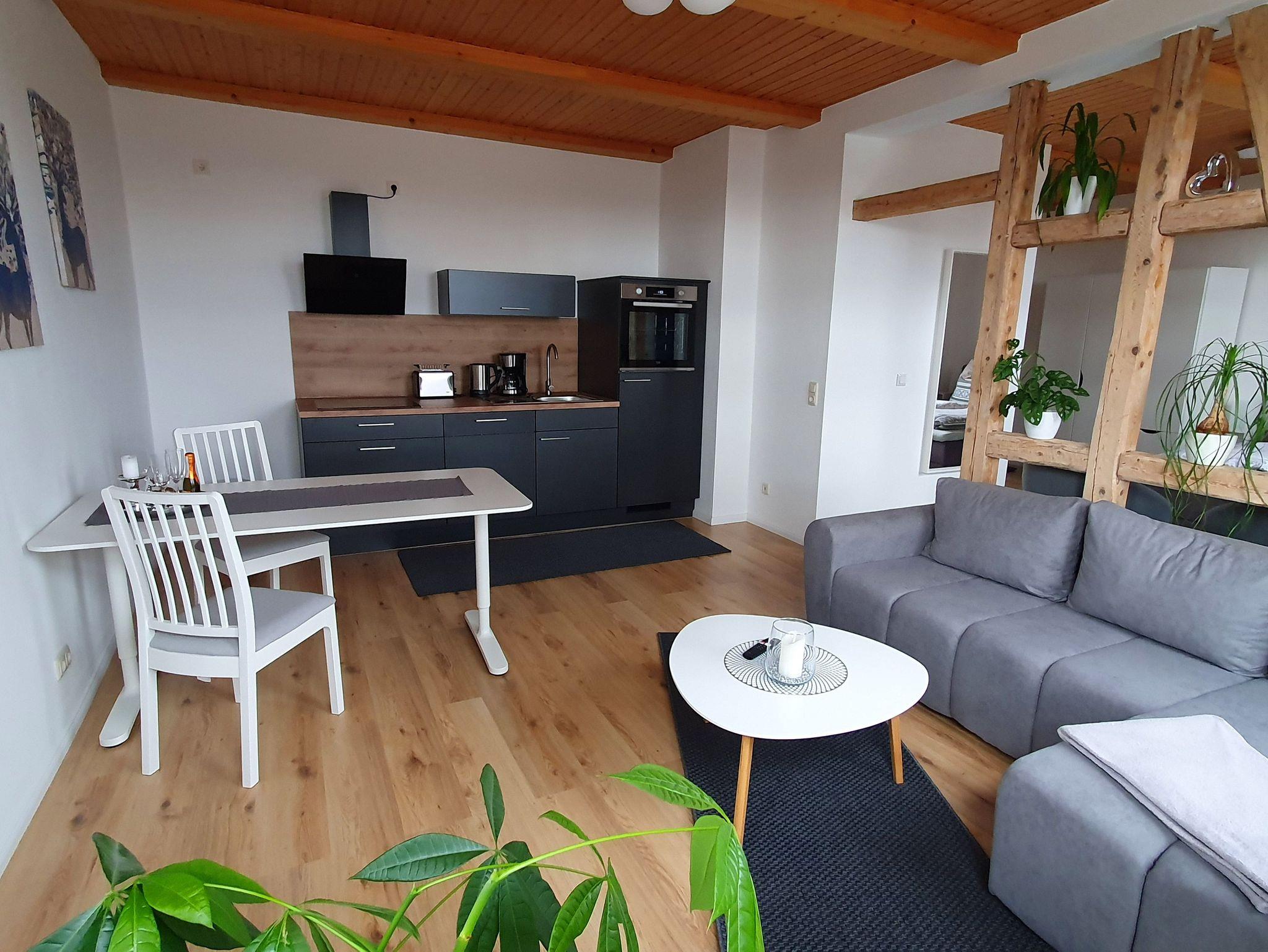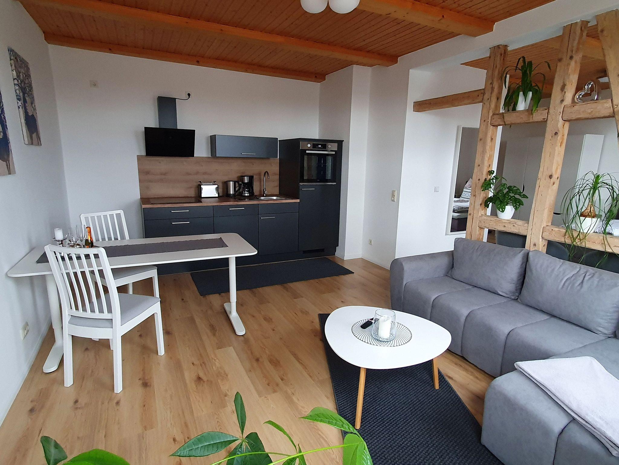 Die helle und offene Gestaltung lädt zum Entspannen ein, während Sie den Komfort einer voll ausgestatteten Küche und einer bequemen und komfortablen Couch genießen. Die Ferienwohnung hat eine Größe von 45 m², wobei der Wohn- und Schlafbereich durch ein offenes Fachwerk getrennt ist. Es erwartet Sie eine Einbauküche mit Ceranfeld und Backofen, Kühlschrank mit Gefriermöglichkeit, Geschirrspüler und Esstisch. Der Schlafbereich ist mit einem Boxspringbett, einem Kleiderschrank und zwei Sessel ausgestattet. Das Bad verfügt über eine Dusche.