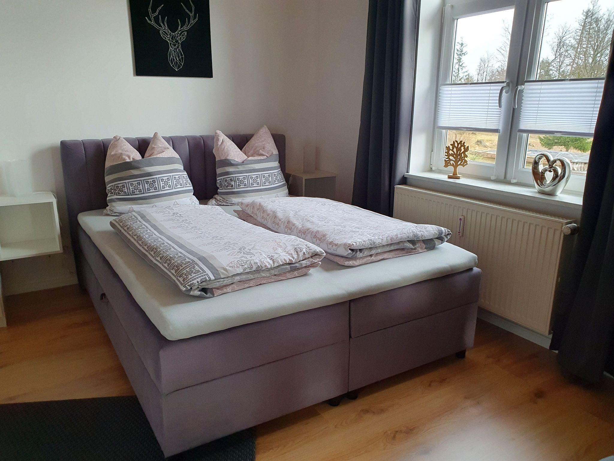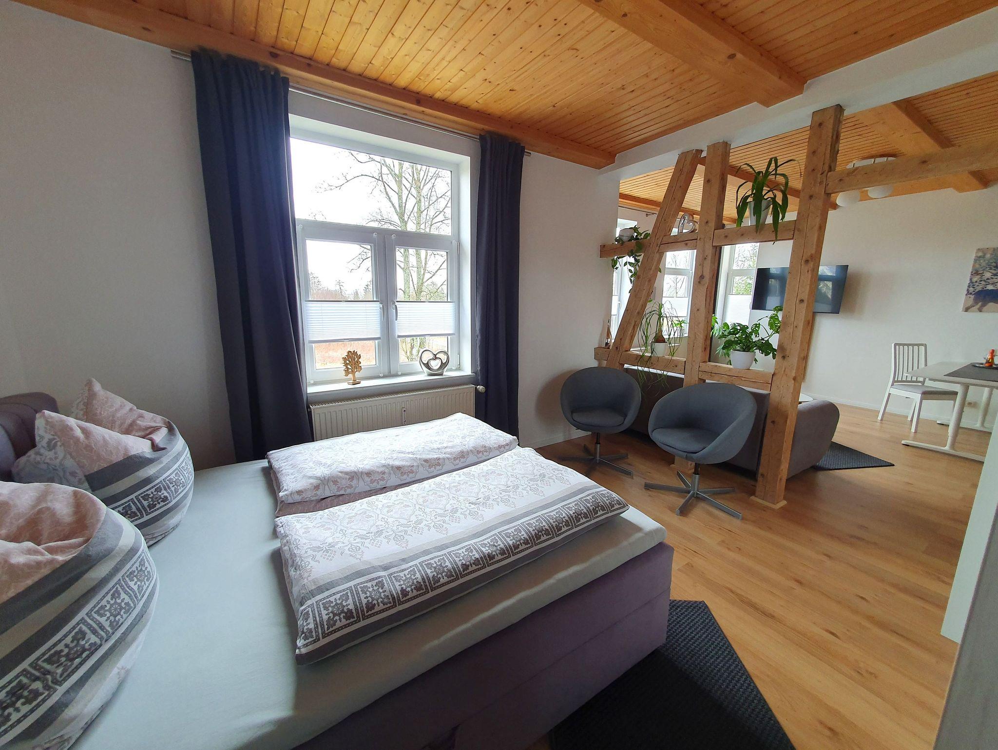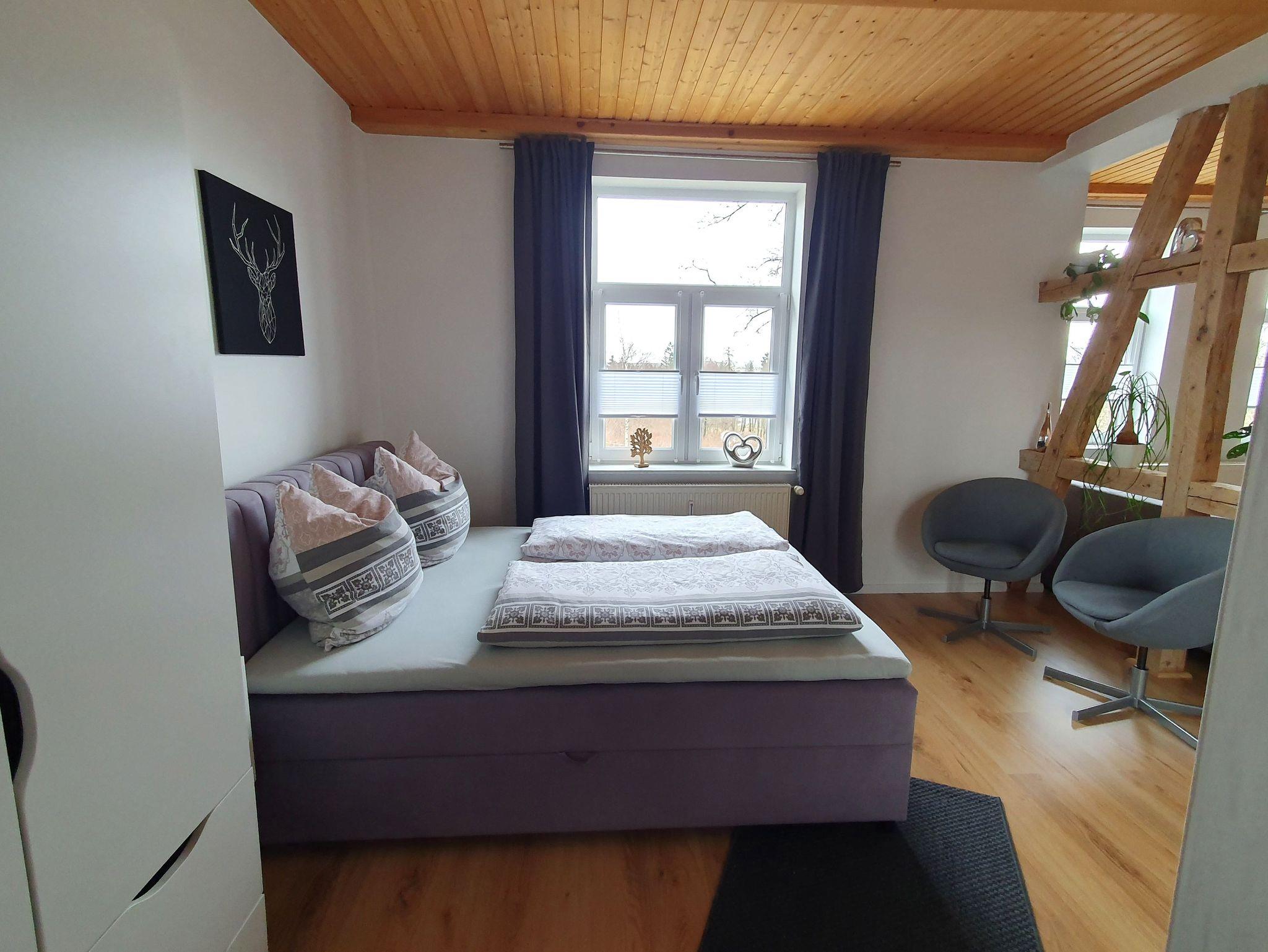 In unserer Ferienwohnung können Sie die Seele baumeln lassen. Sie befindet sich im 1. Obergeschoss des Hauses. Die Wohnung lädt mit einem modernen Boxspringbett, einem gemütlichen Sofa und einem hochwertigen Badezimmer zum Wohlfühlen ein. Das charmante Fachwerk sorgt für einen ganz besonderen Flair in der Wohnung. Ob kleine Auszeit, Familienurlaub oder verlängertes Wochenende - hier sind Sie genau richtig! Natürlich ist auch Ihr Vierbeiner herzlich willkommen.