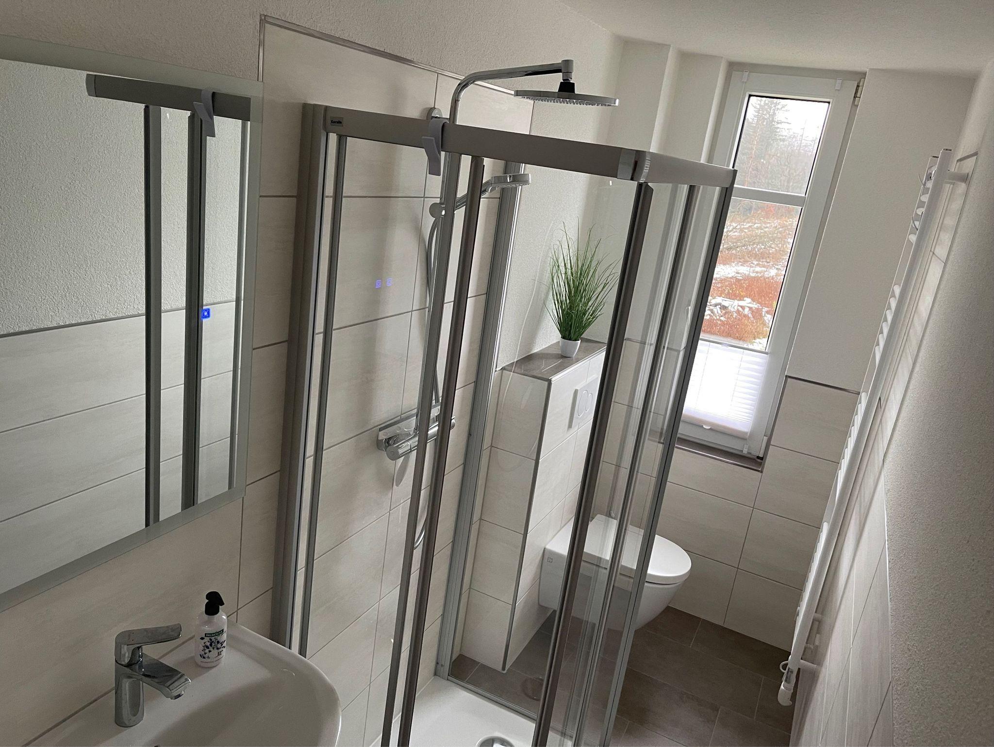 Das Badezimmer ist mit einer Dusche ausgestattet und verfügt über ein Tageslichtfenster.