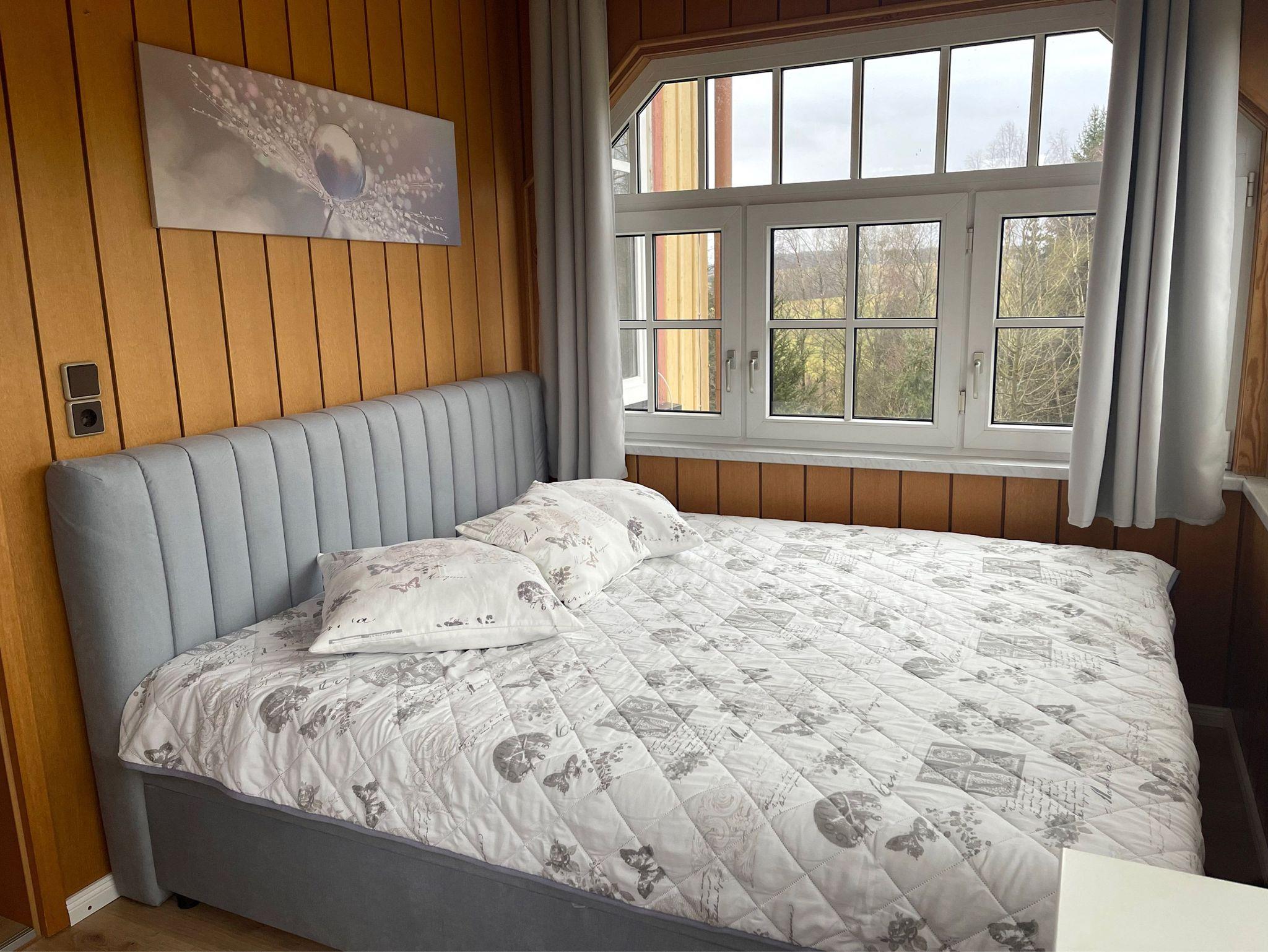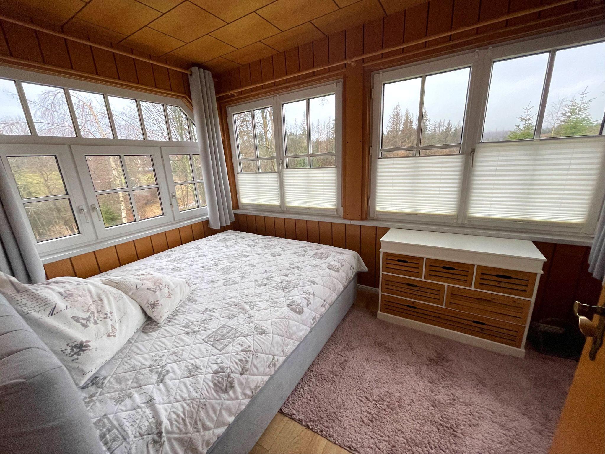 Über das Wohnzimmer gelangen Sie in das Schlafzimmer mit einem Doppelbett und einem Kleiderschrank.