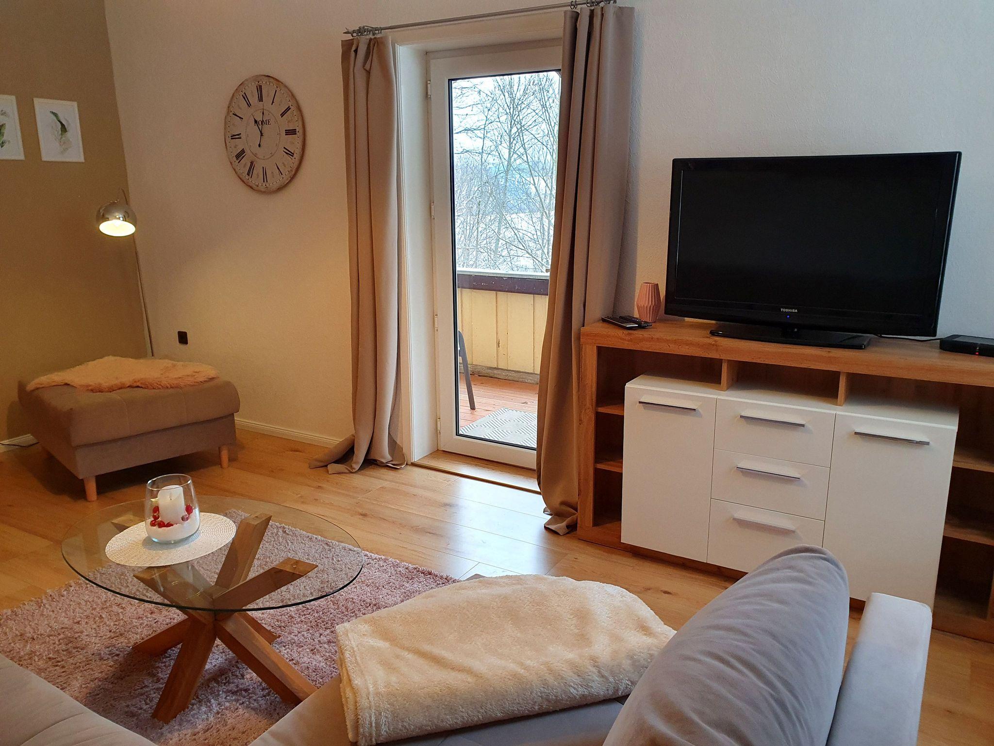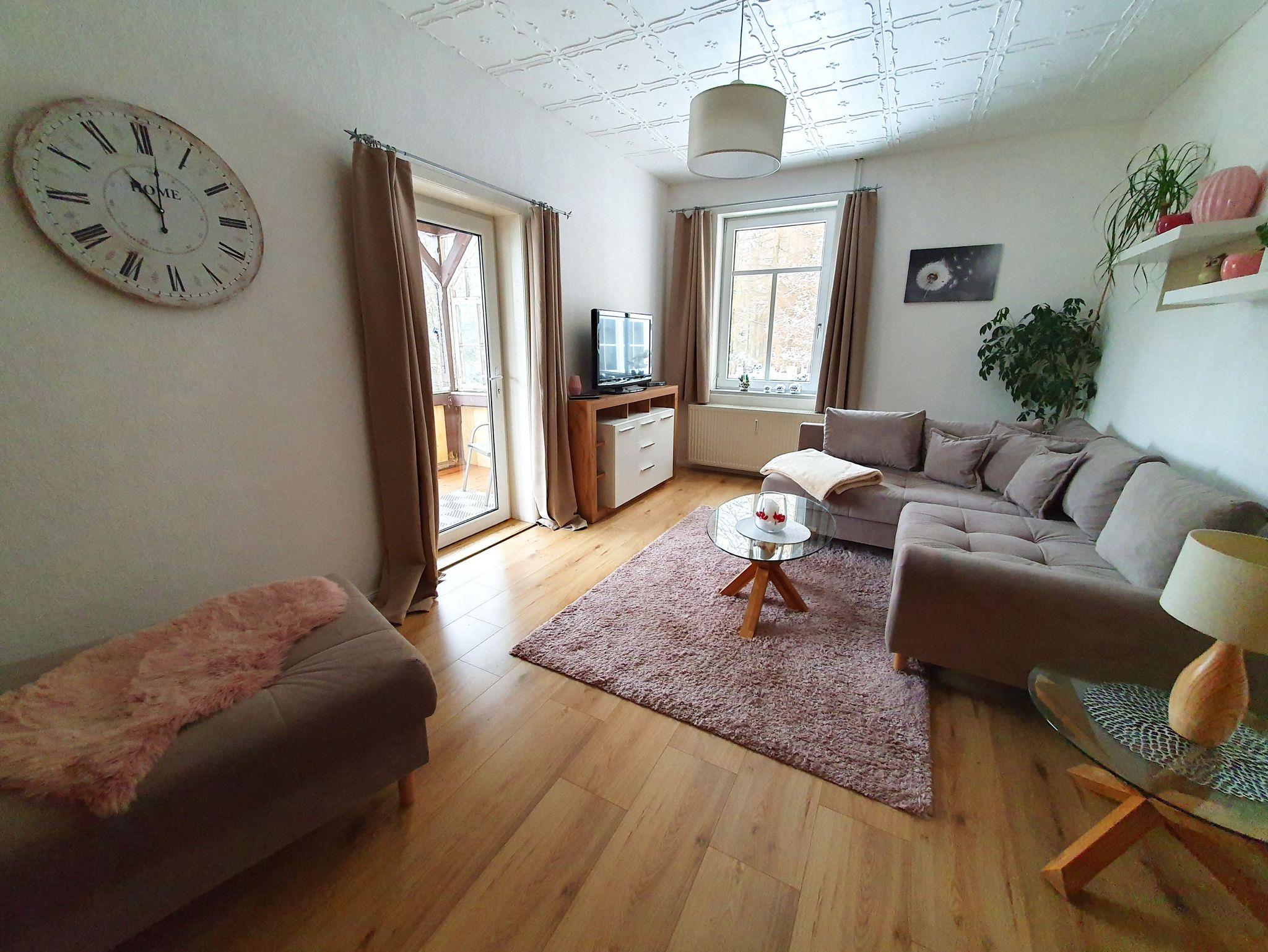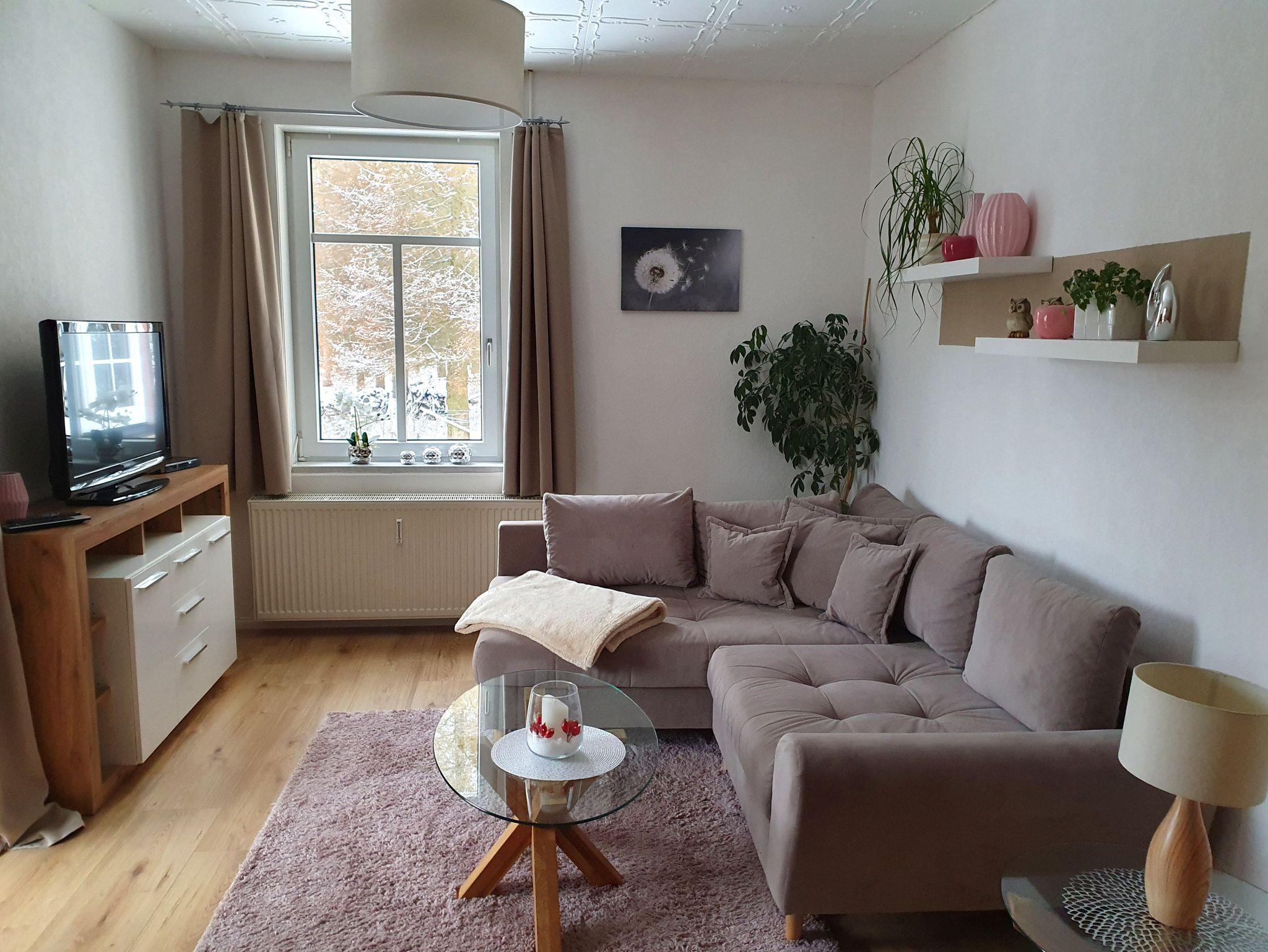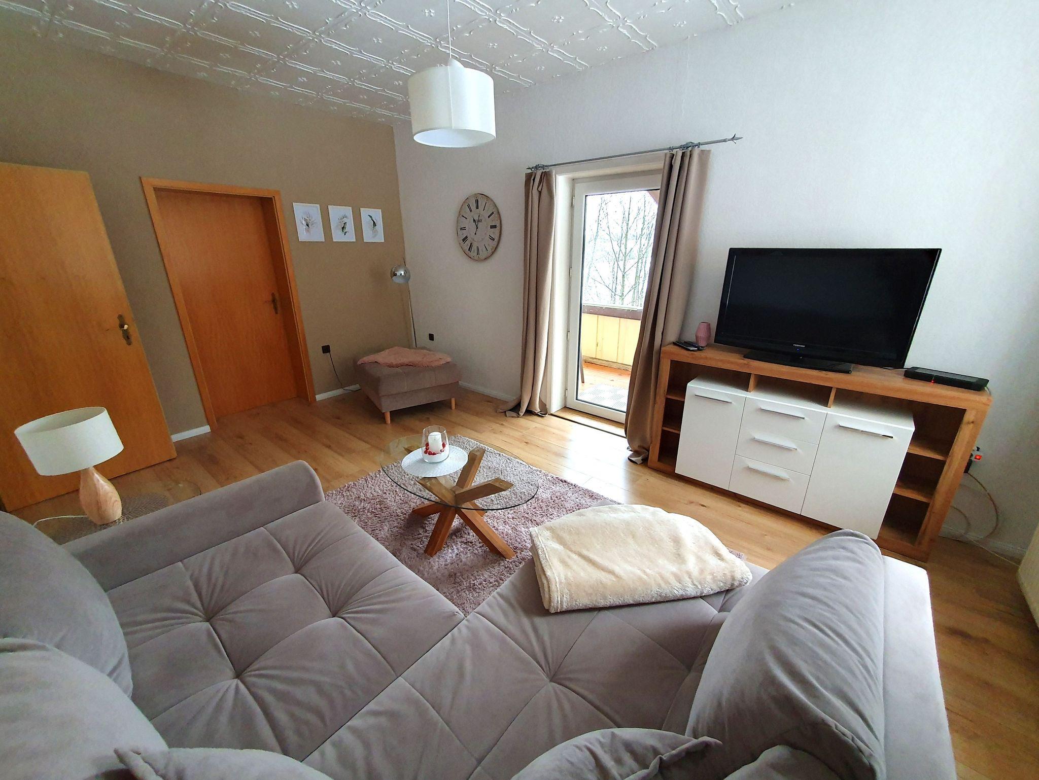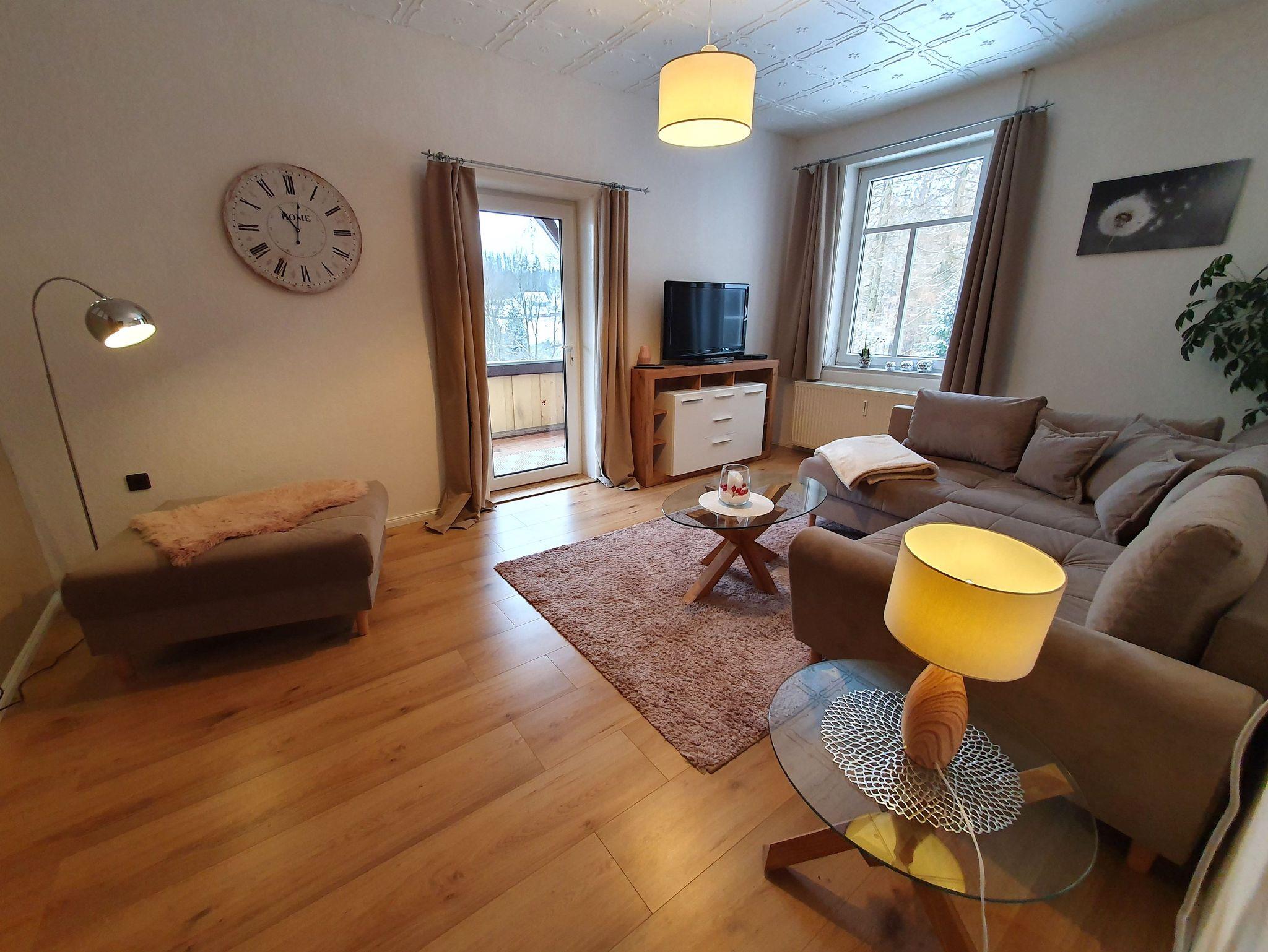 Zeit zum Erholen ermöglicht auch das große Wohnzimmer. Die Kombination aus einer gemütlichen Eckcouch und einem Flachbildfernseher eignet sich perfekt für einen Ausklang nach einem erlebnisreichen Tag bei uns im Oberharz.