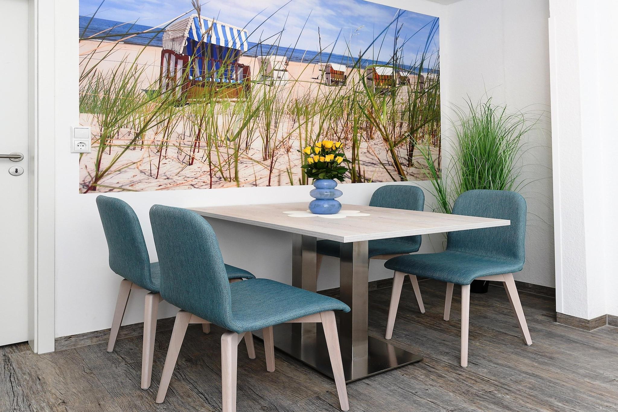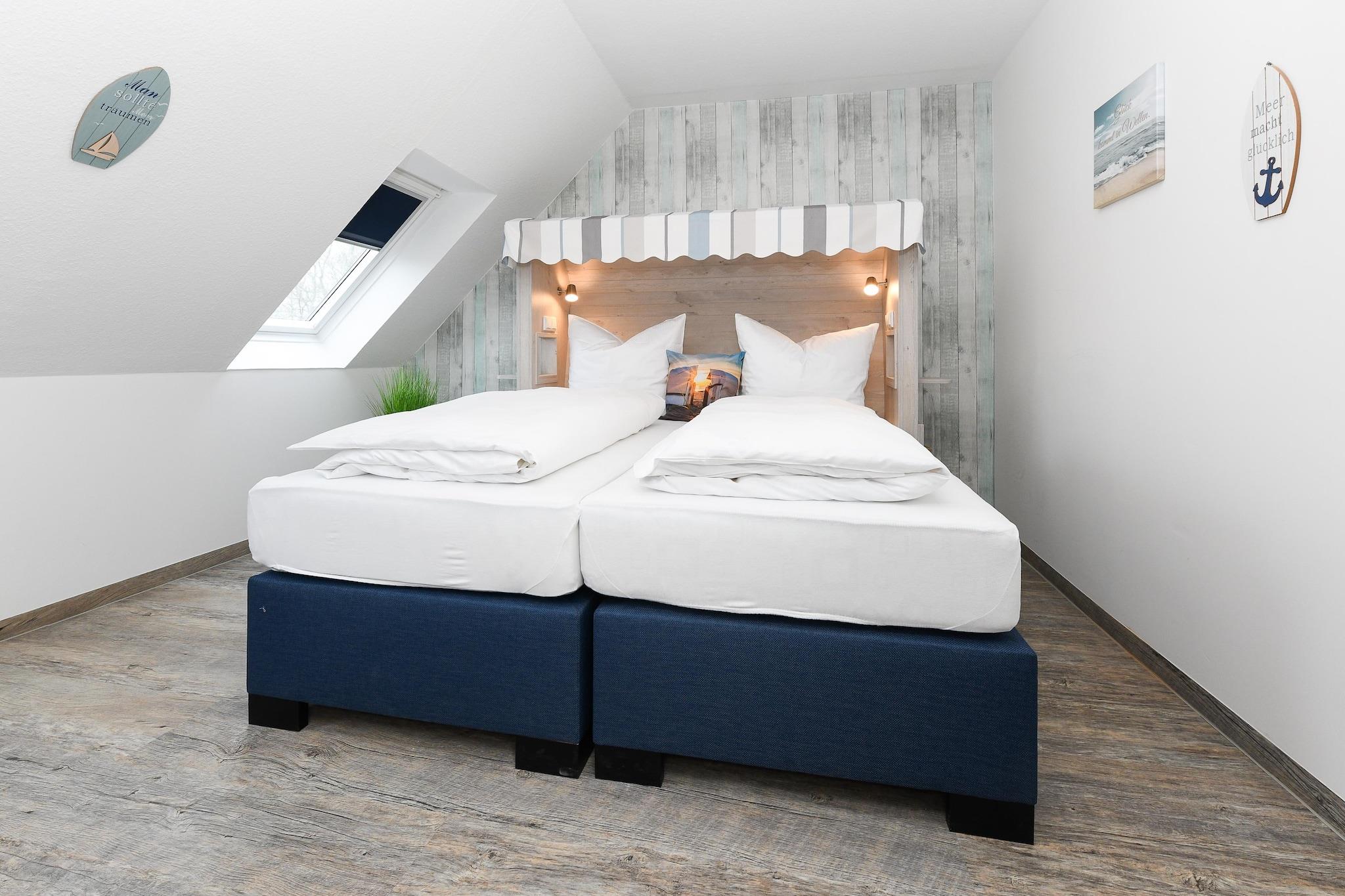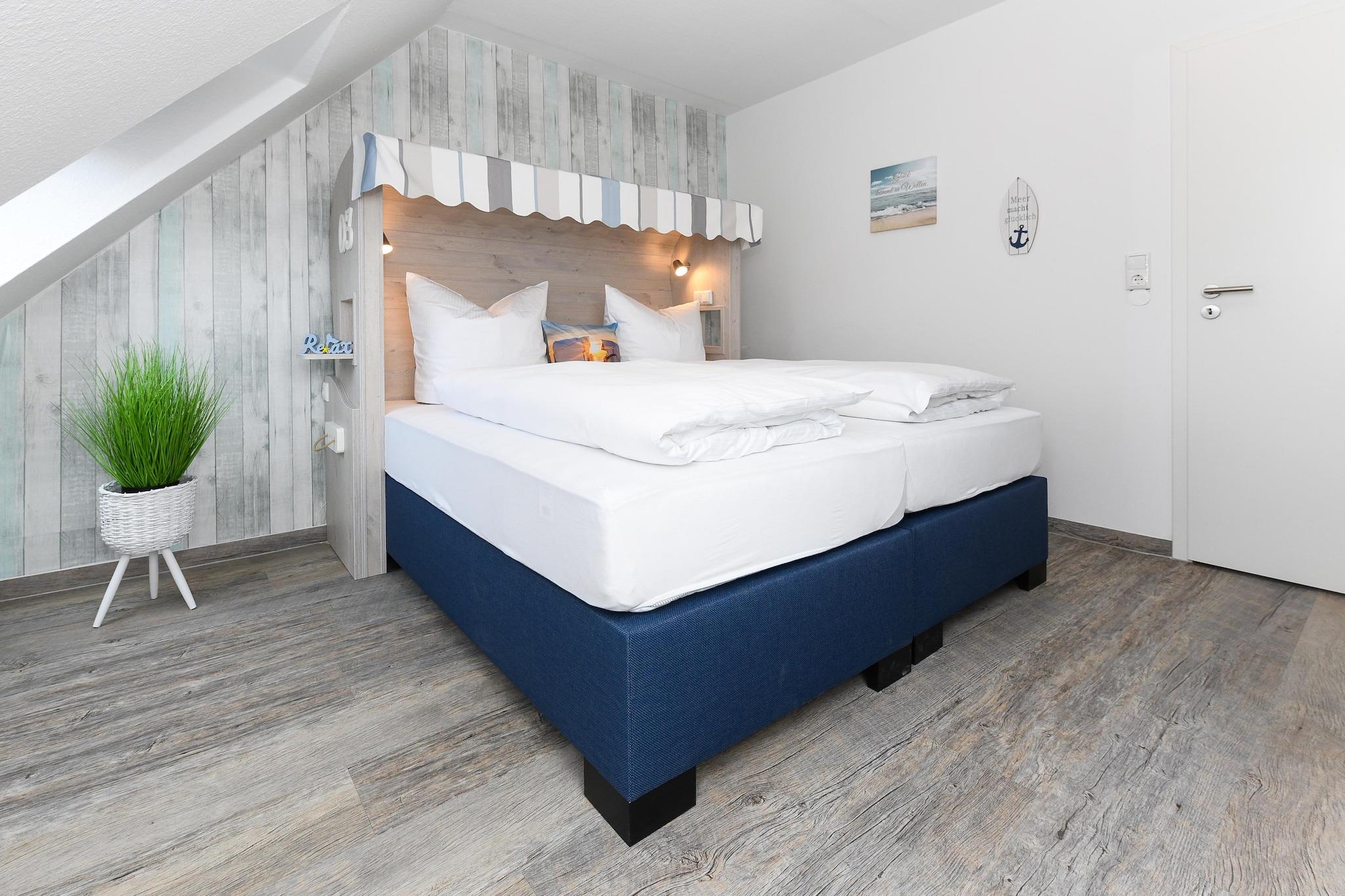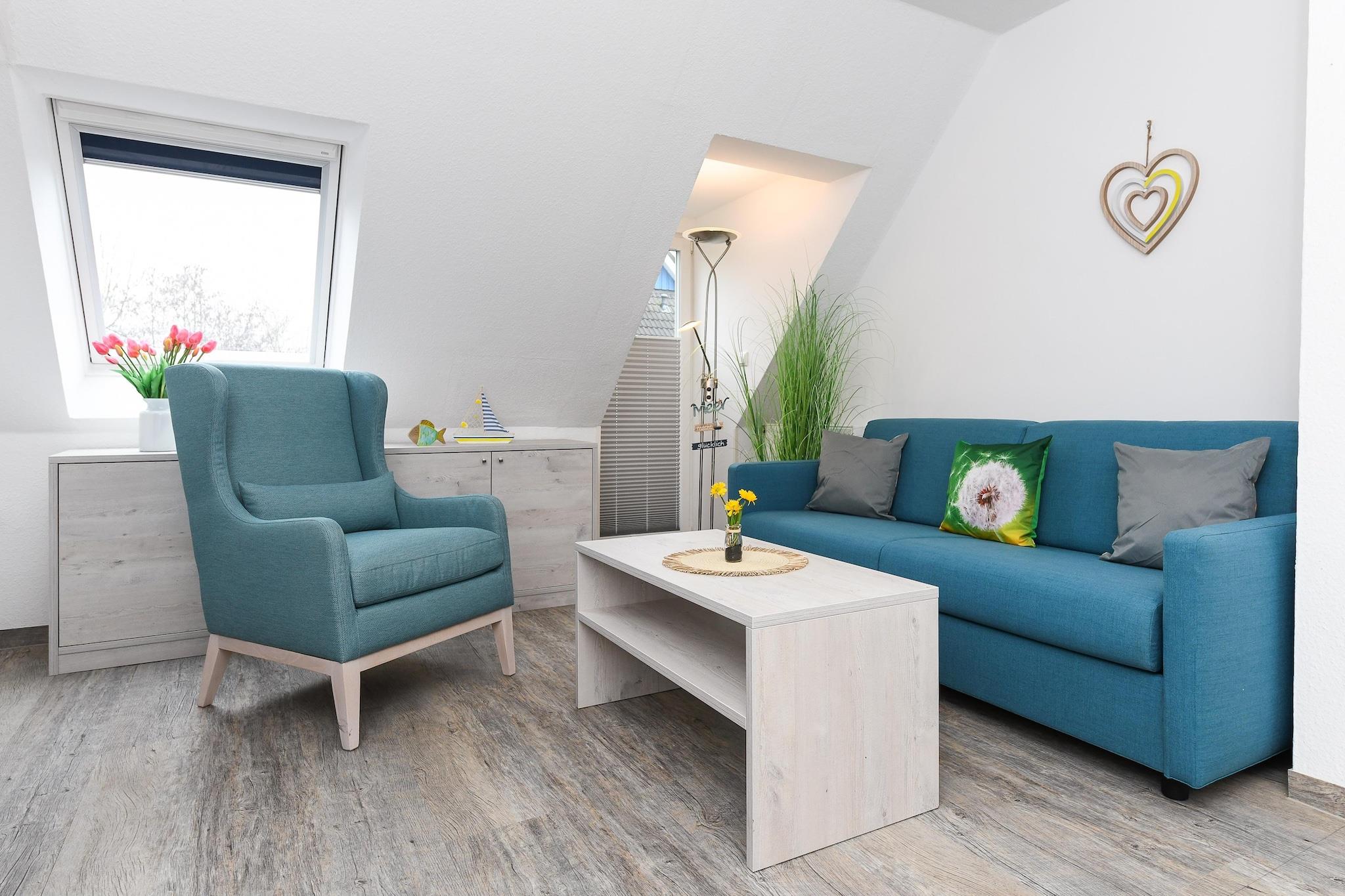 Denne koselige leiligheten i første etasje, på omtrent 50 m², tilbyr alt familier og de som søker avslapning trenger for en avslappende ferie ved Nordsjøen. Leiligheten er ideell for 1 til 4 personer, pluss et ekstra småbarn. Den har en lys stue med integrert kjøkken, et separat soverom, et barnerom og et moderne bad med dusj og toalett. Den private terrassen inviterer deg til å nyte solfylte frokoster eller avslappende kvelder utendørs. Gratis Wi-Fi, moderne kjøkkenapparater, flatskjerm-TV og madrasser av høy kvalitet sikrer komforten i hjemmet. Spesielt praktisk for familier: vaskemaskin og tørketrommel er tilgjengelig i fellesområdet. Den velstelte hagen bak huset gir god plass til lek og avslapning. Takket være den rolige beliggenheten og nærheten til stranden, sentrum og fritidsaktiviteter, er leiligheten ideell for par eller barnefamilier som ønsker å nyte ferien sin ved Nordsjøkysten. Høydepunkter: Wi-Fi, forbruksbaserte energikostnader og en sengetøypakke inkludert. Merknad om sluttrengjøring: For opphold på færre enn 5 netter betales et gebyr på EURO80; ellers er sluttrengjøring inkludert.
