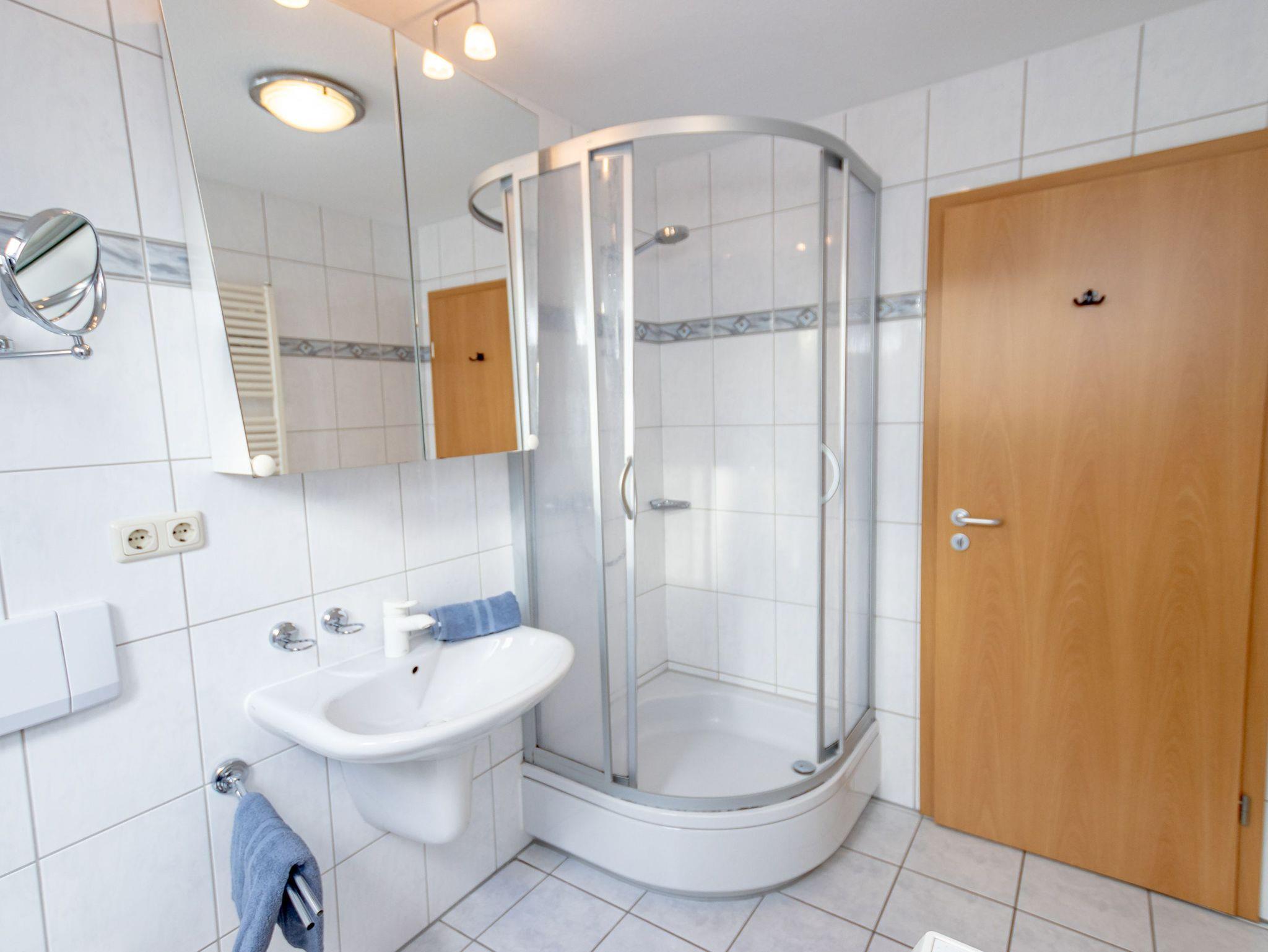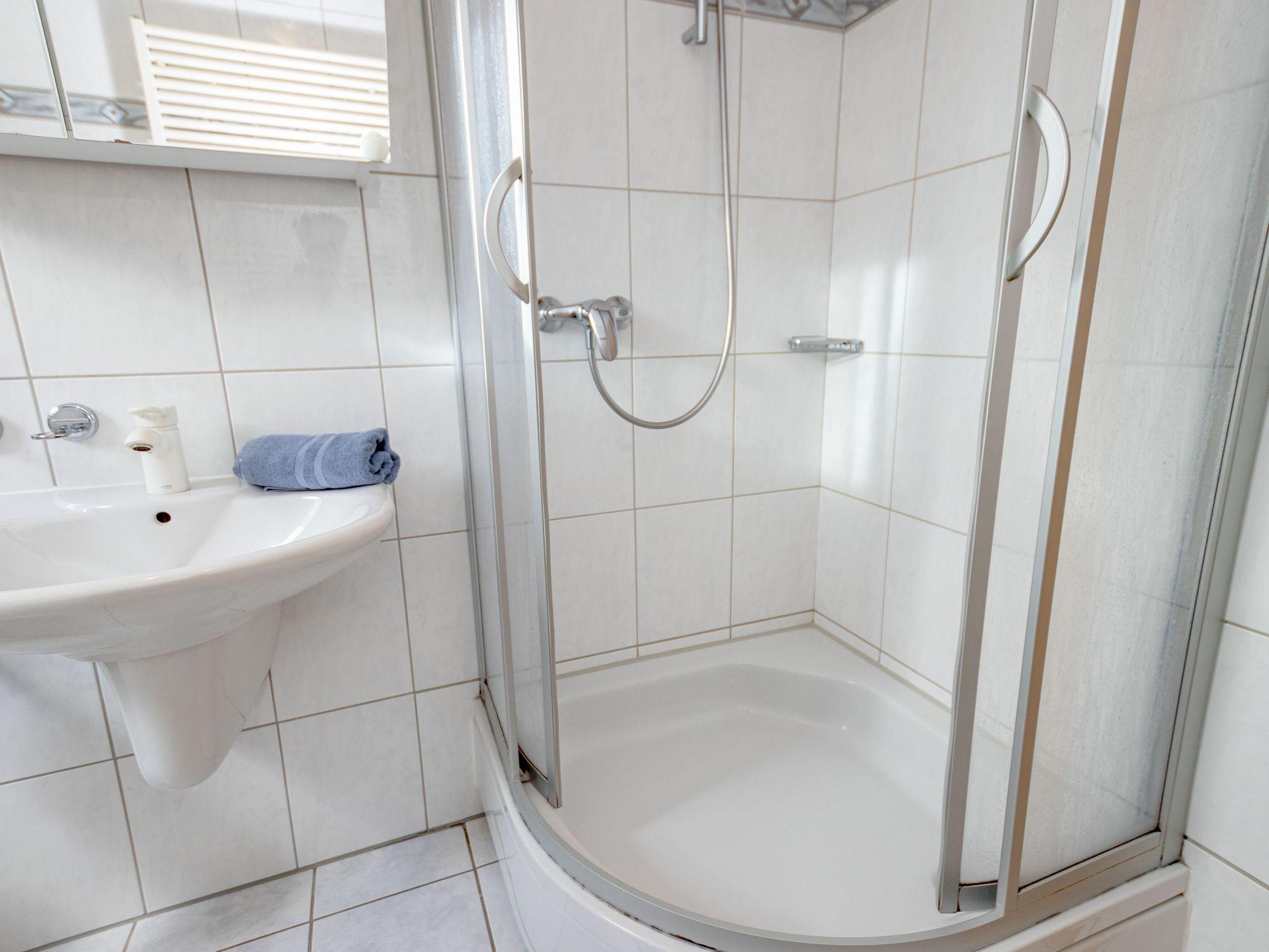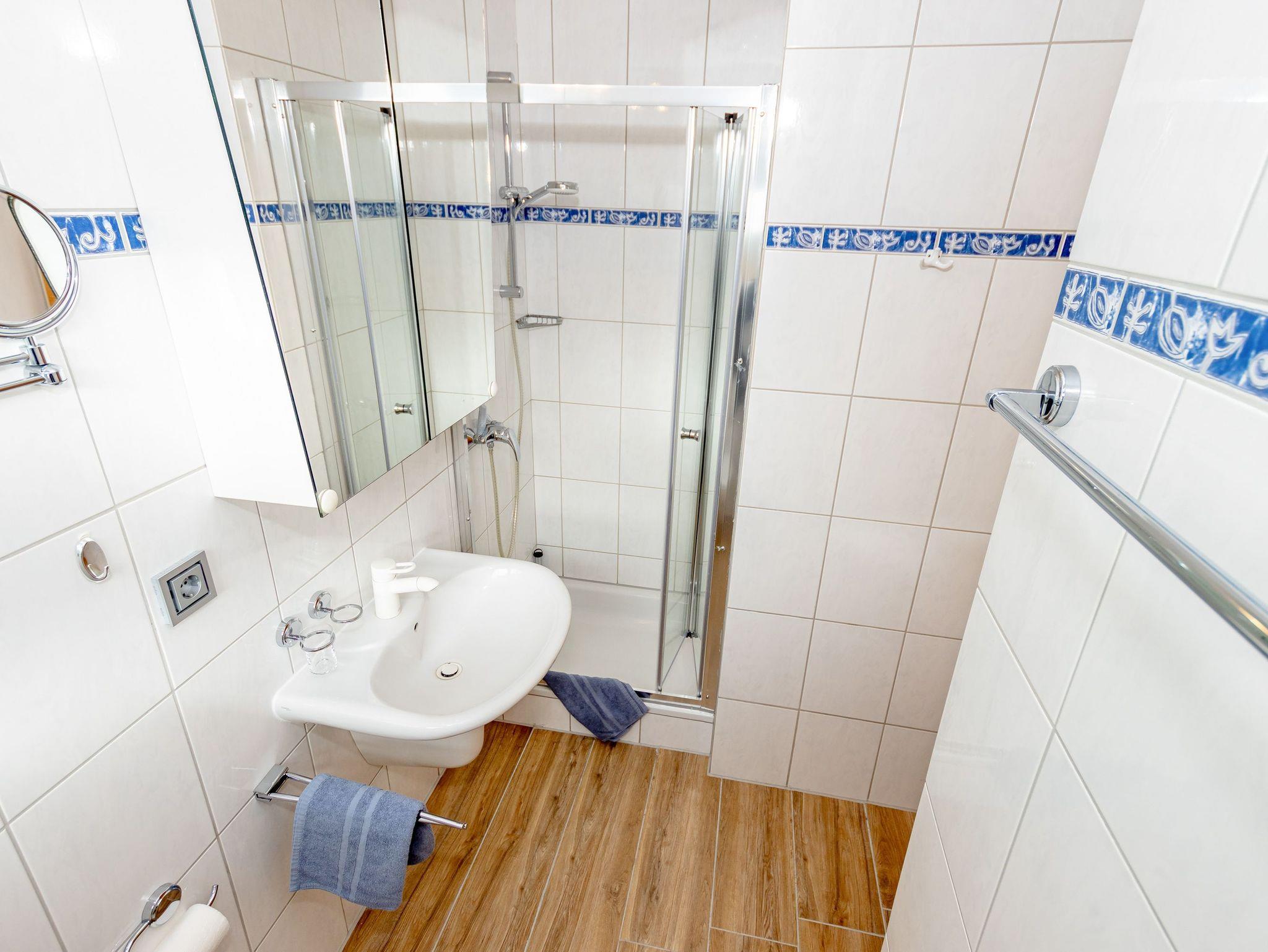 - Badezimmer mit Dusche, Waschtisch und WC