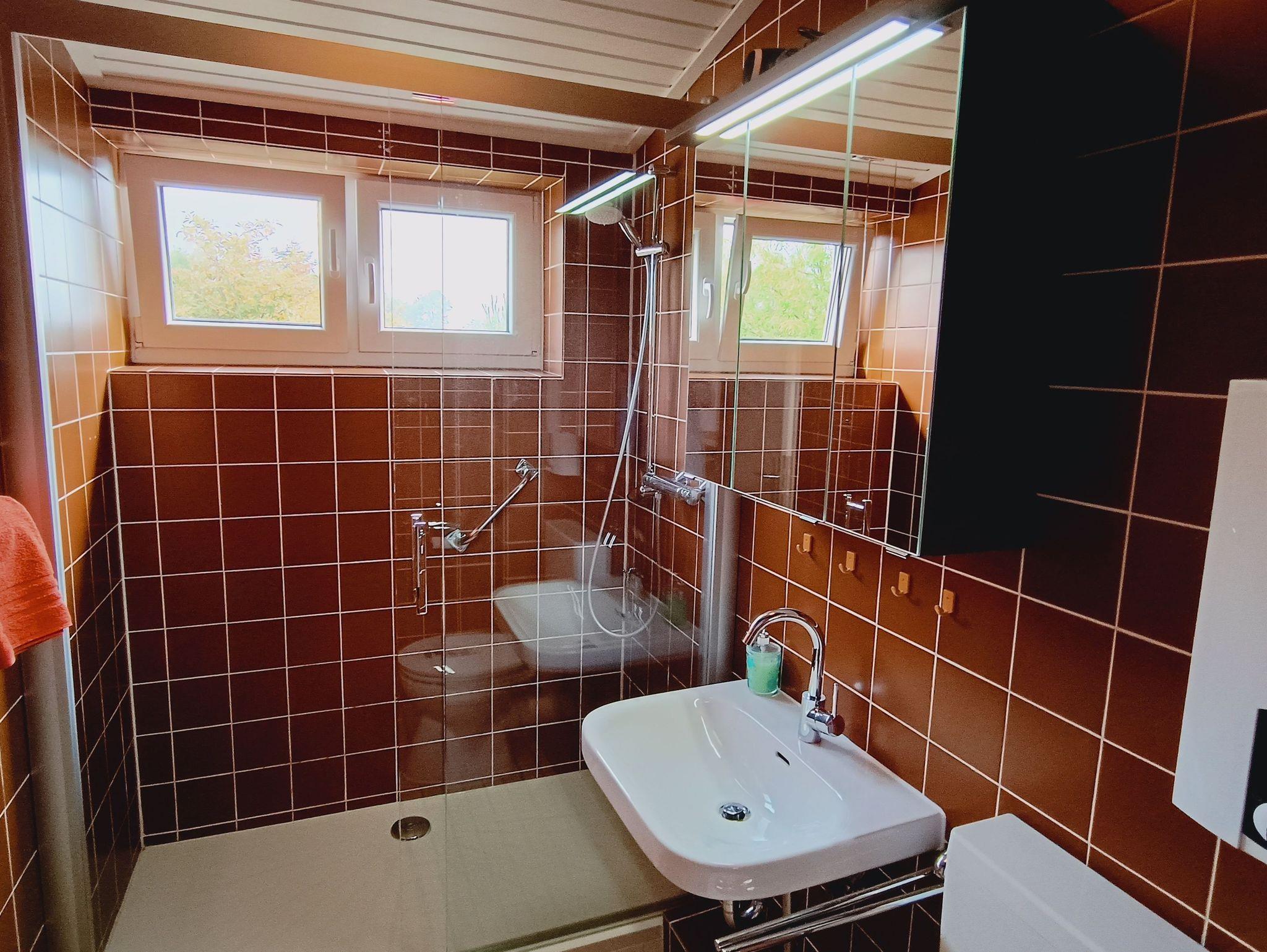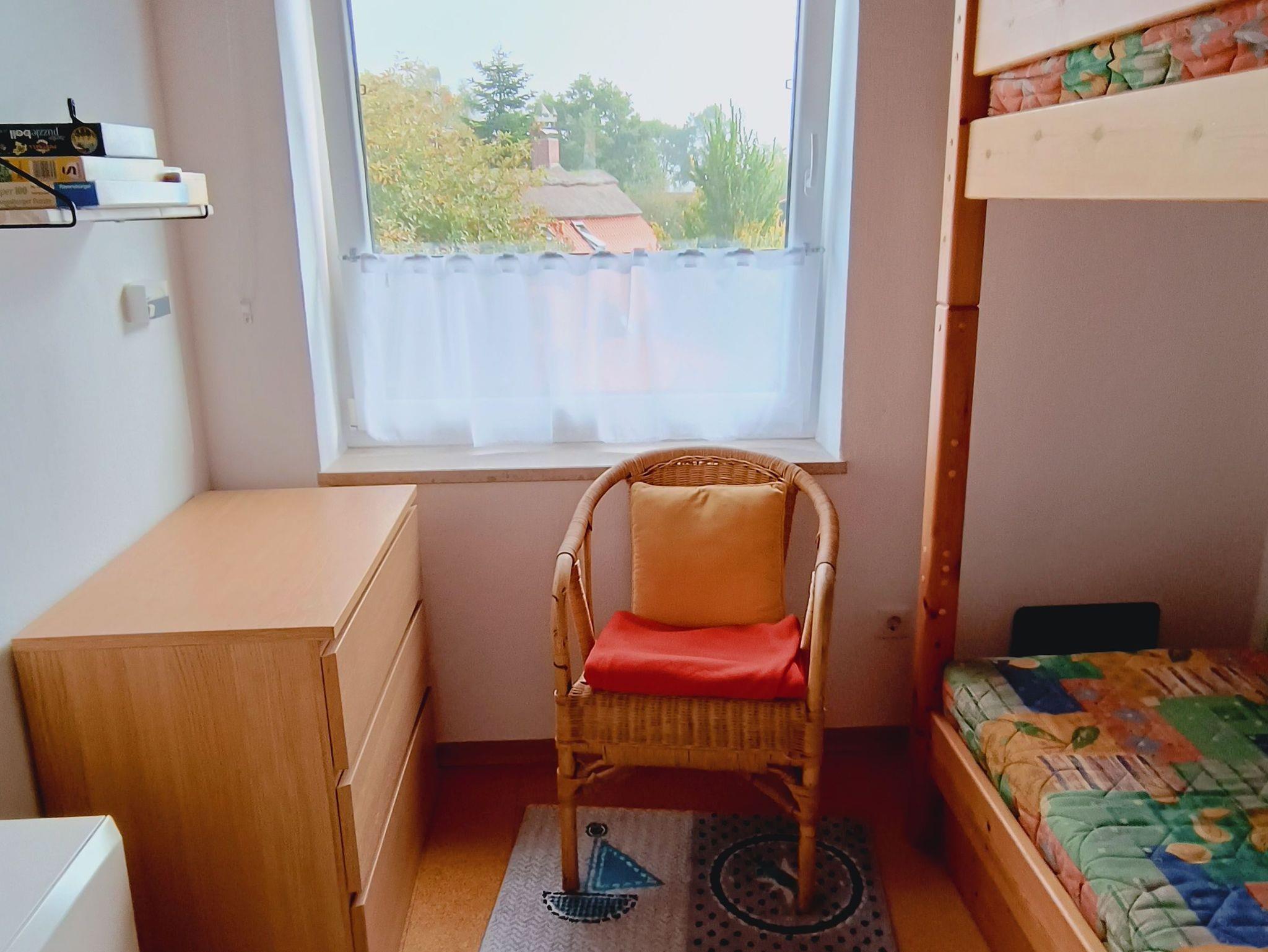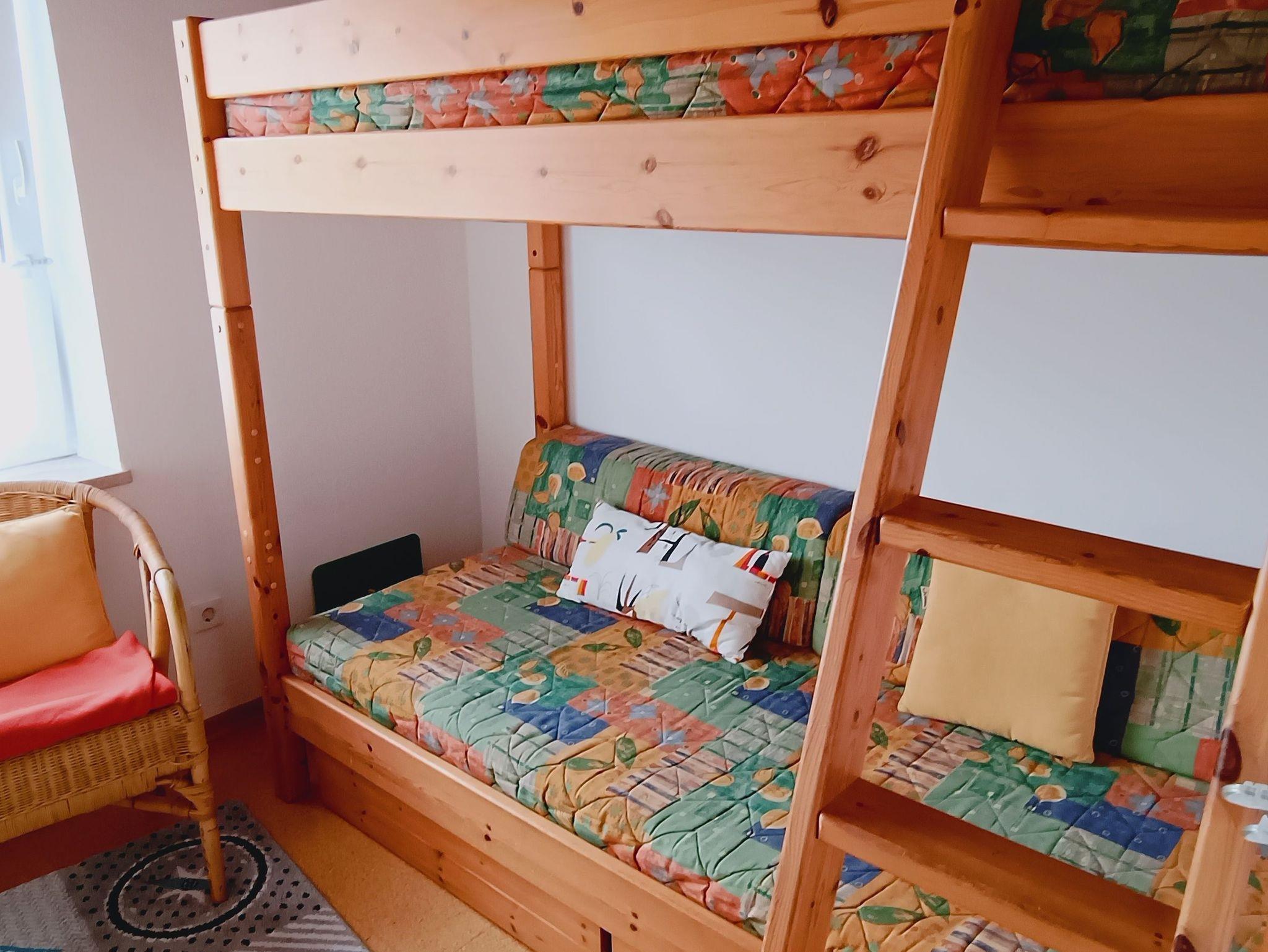 Unsere Wohnung ist ca. 41 m² groß. Sie besteht aus Wohnzimmer mit Essplatz und offener Küche, 1 Schlafraum mit Doppelbett, 1 Kinderzimmer mit Etagenbett, Duschbad, Flur mit Einbauschrank und Balkon mit Gartenmöbeln. Die Holzdecke im Wohnraum steigt von Zimmerhöhe auf über 4 m an, wobei die Balken der Dachkonstruktion freigelassen worden sind. Ein zusätzliches Fenster im oberen Bereich lässt die Räume großzügig und hell erscheinen. Es handelt sich um eine Nichtraucherwohnung, ebenso ist die Mitnahme von Haustieren nicht erlaubt. Für die Kinder gibt es einen Hochstuhl, Bobby Car, Bollerwagen, Sand- und Spielsachen u.v.m., für die Großen SAT-TV, CD- und DVD-/Blu-ray-Player, Bücher und Spiele.