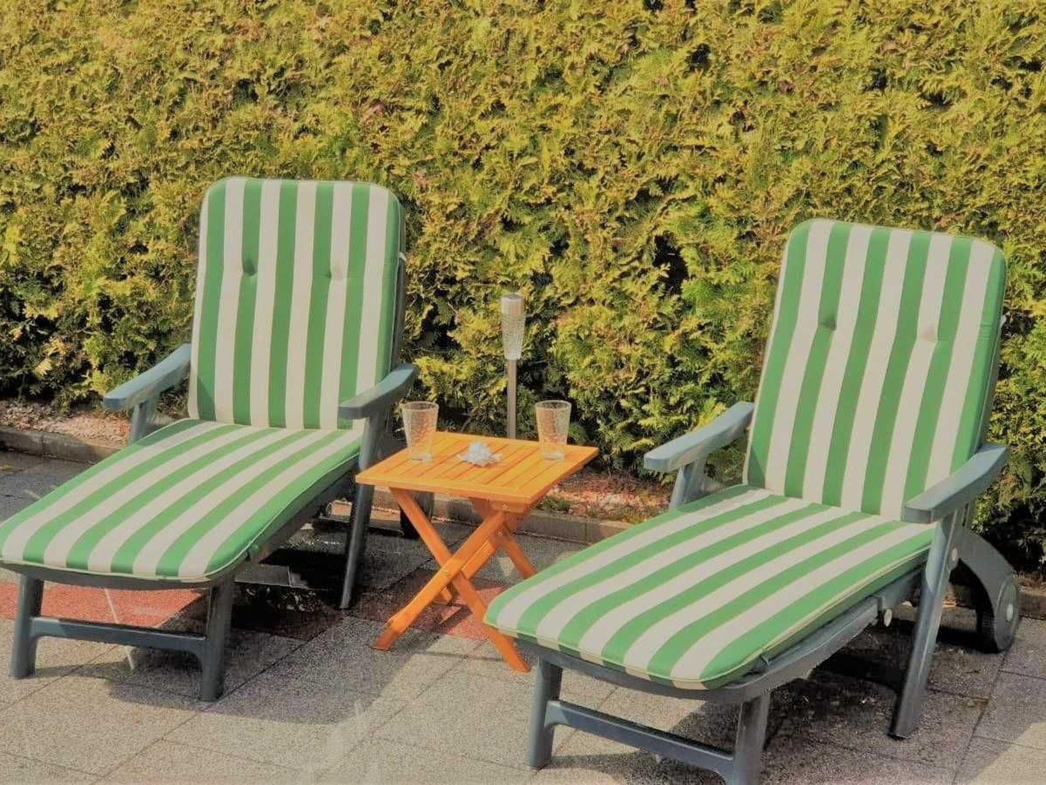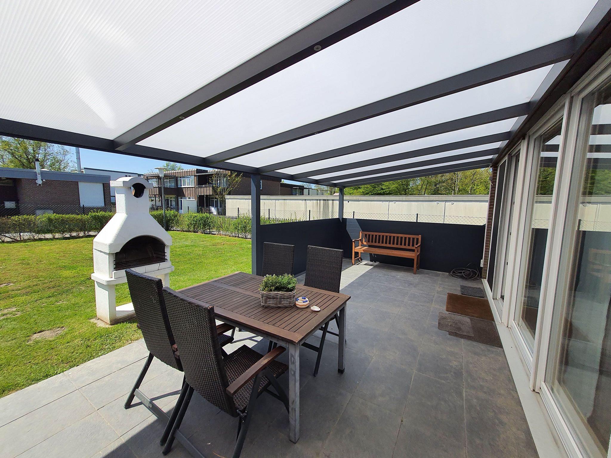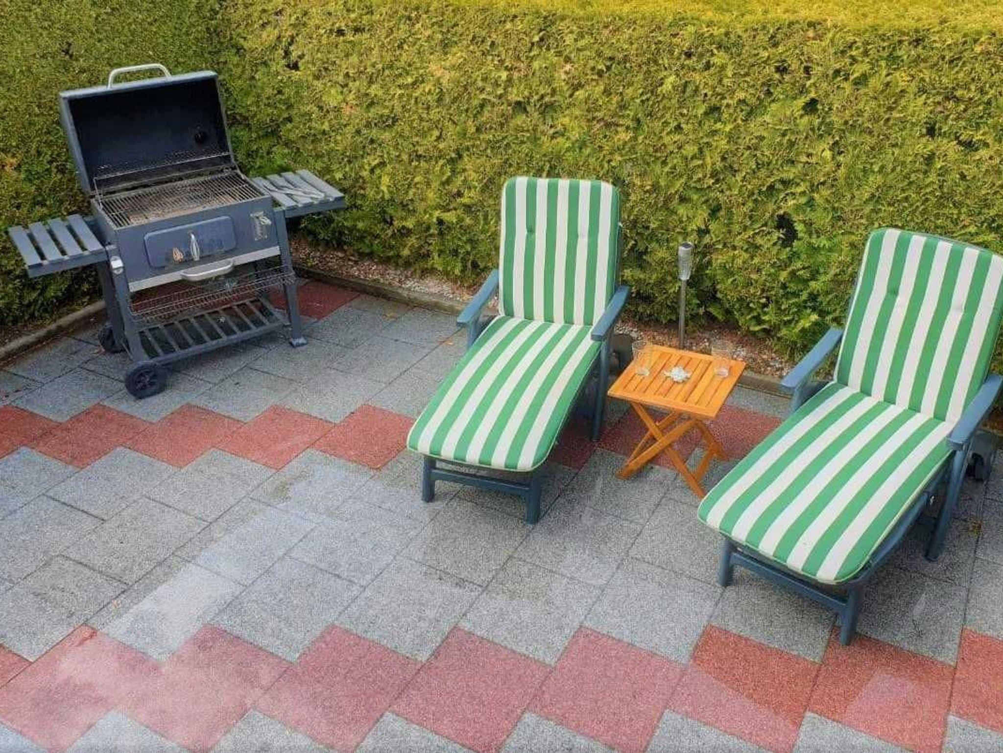 • Die Terrasse mit Innenhofcharakter, überdachte Sitzecke, Liegestühle, Grill ist durch eine Hecke und einen kleinen Zaun geschützt.