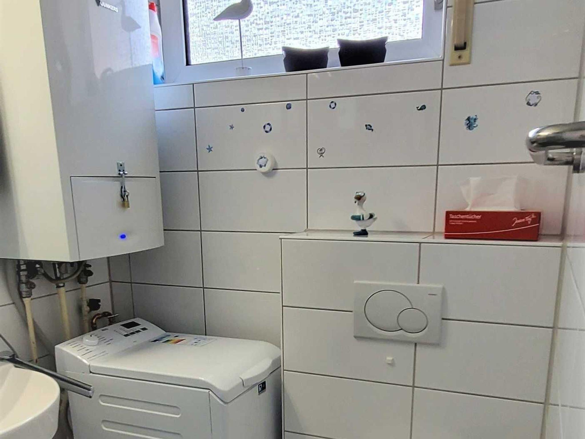 • Das Badezimmer ist hell gefliest mit blauen Farbtupfern. Ausstattung: Dusche, Allibert-Spiegelschrank, Waschtisch, WC. (Plus Fön, Handspiegel, Badhocker).