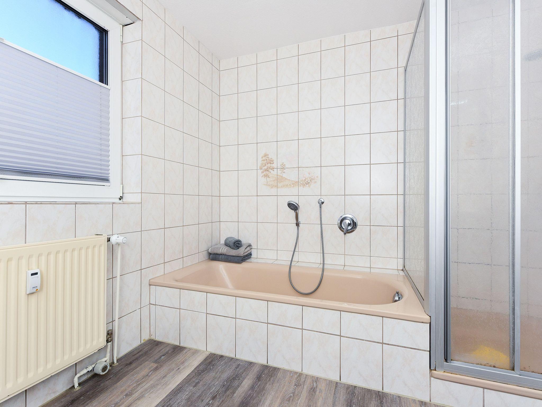 Badezimmer mit Badewanne, Dusche, Waschtisch und WC
