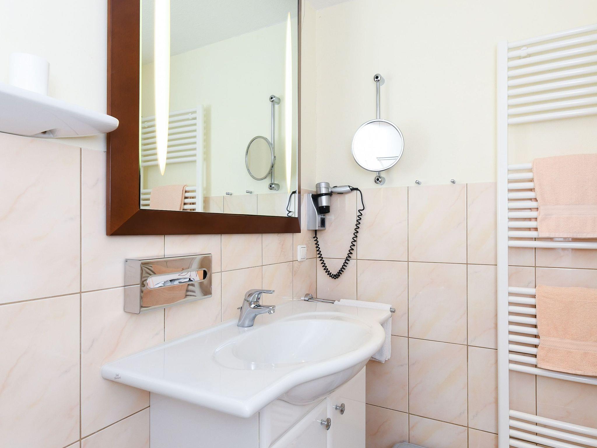 Badezimmer mit Dusche, Waschtisch und WC