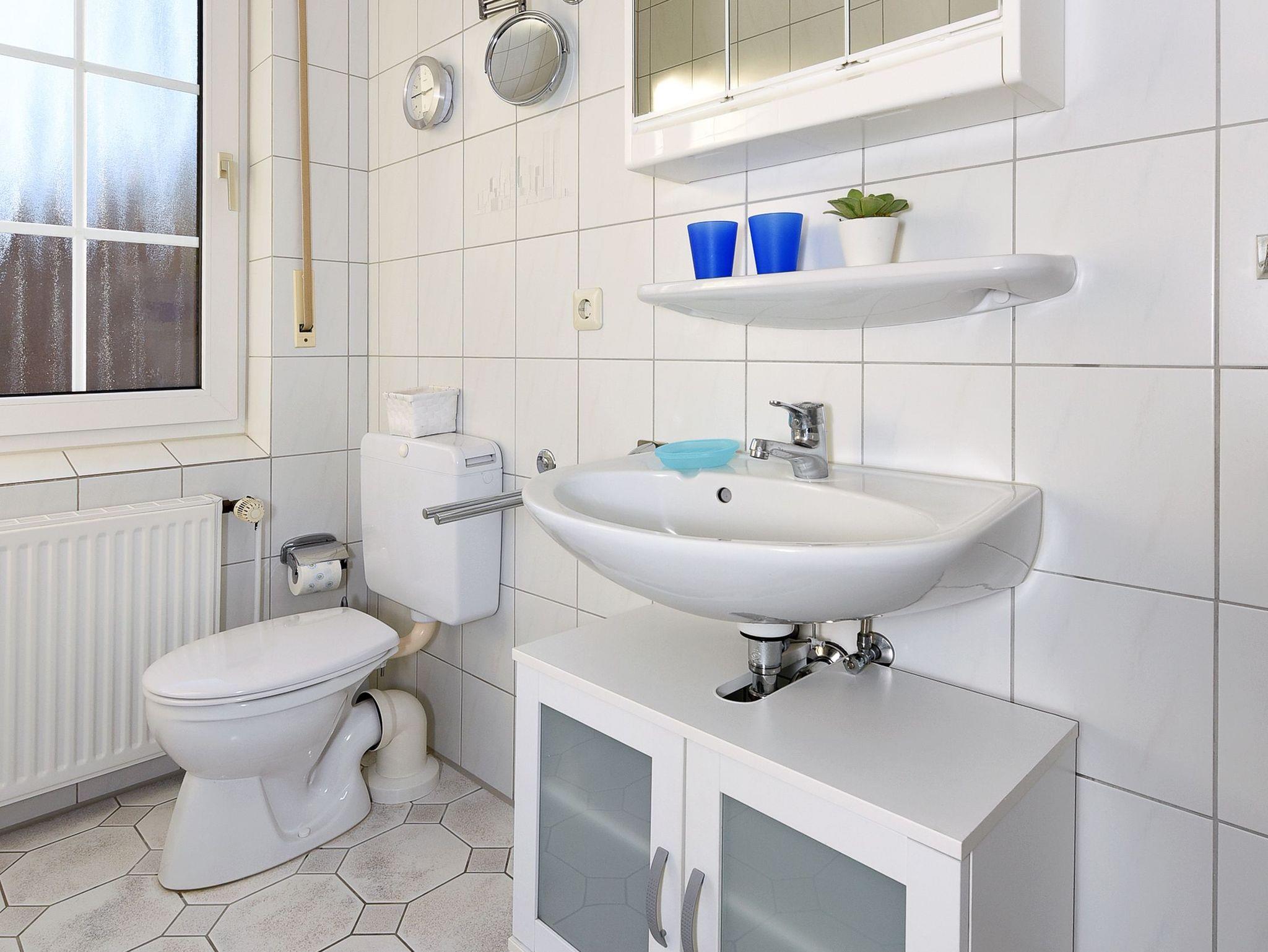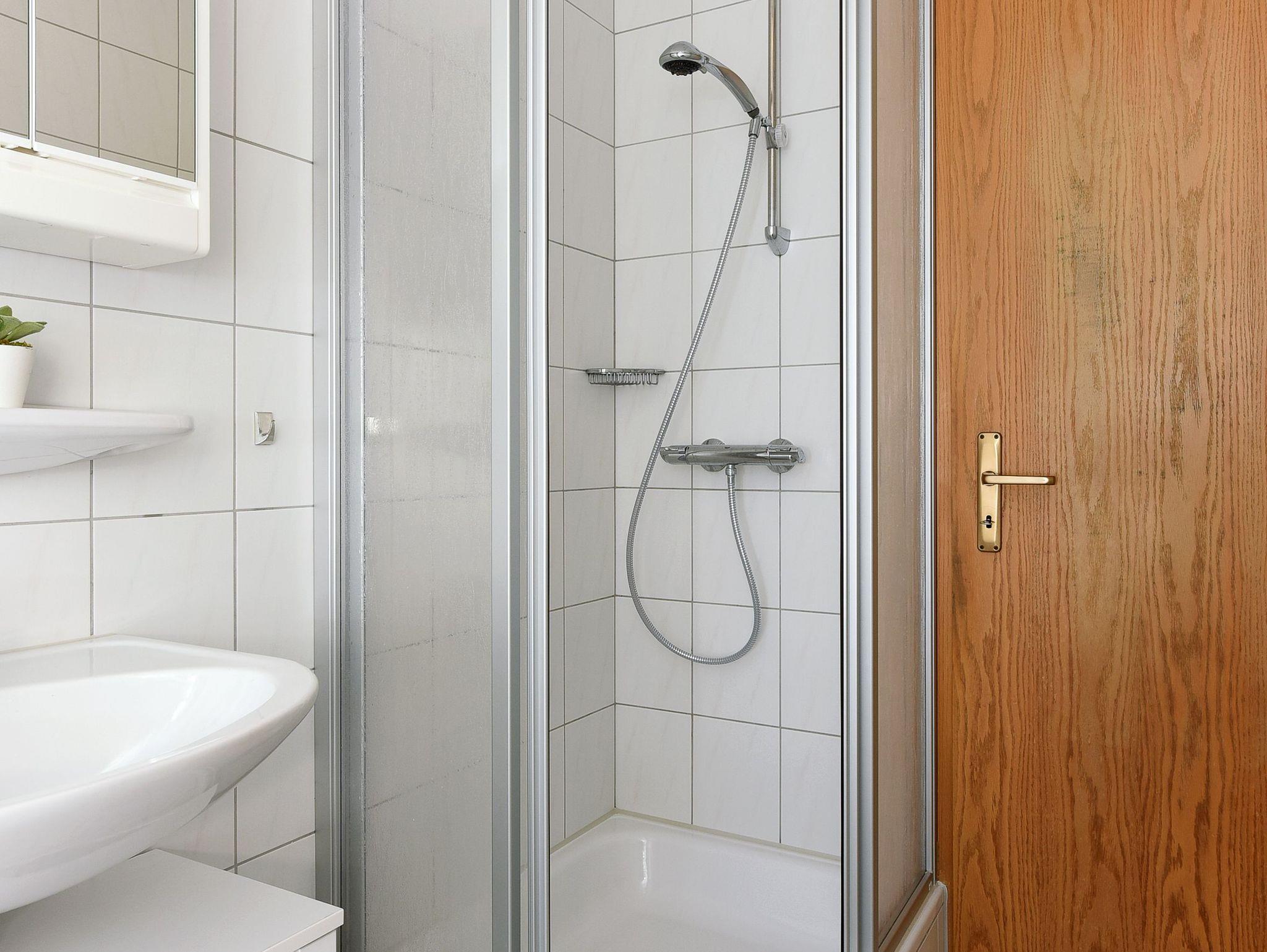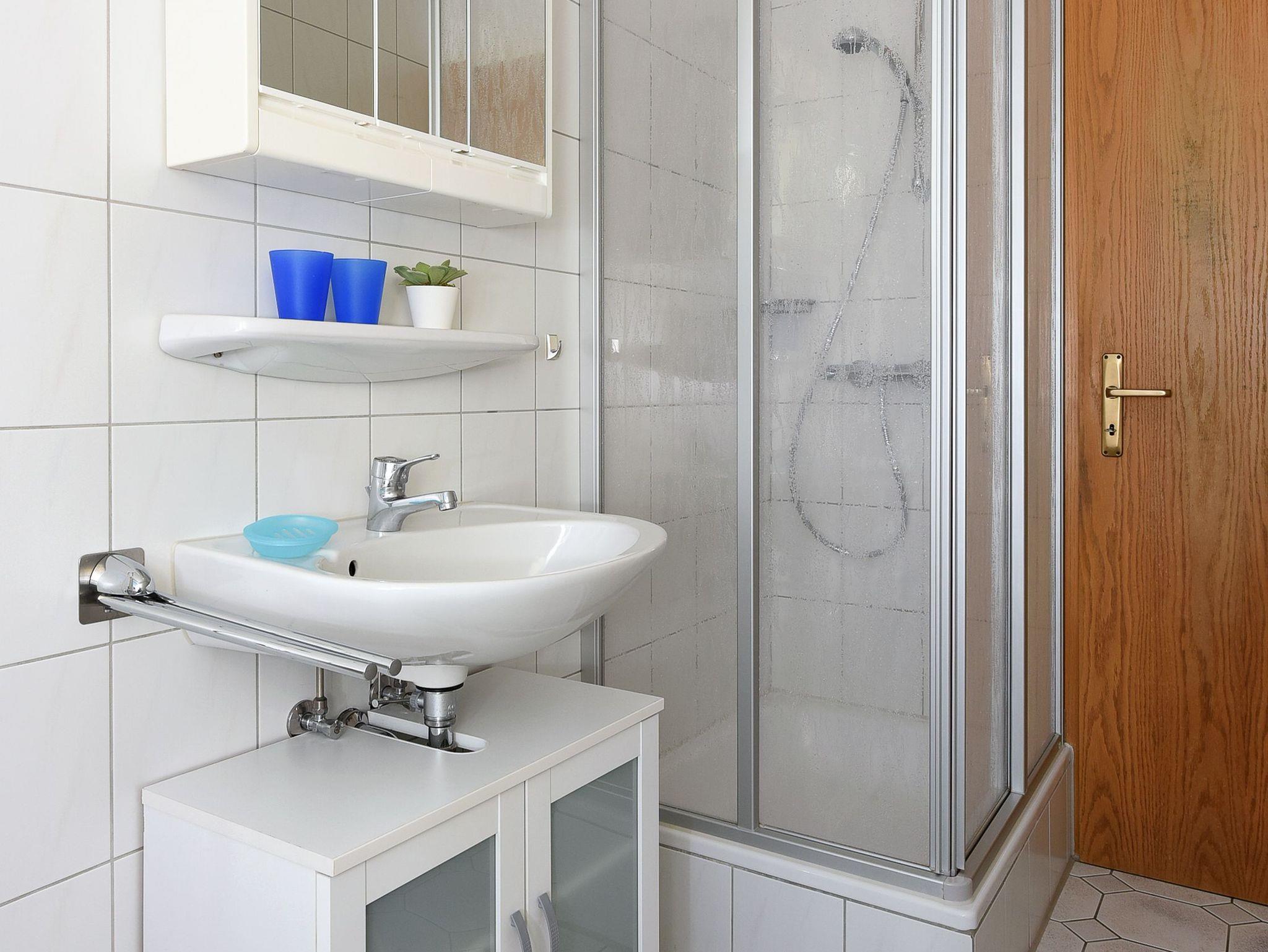 Badezimmer mit Dusche, Waschtisch und WC