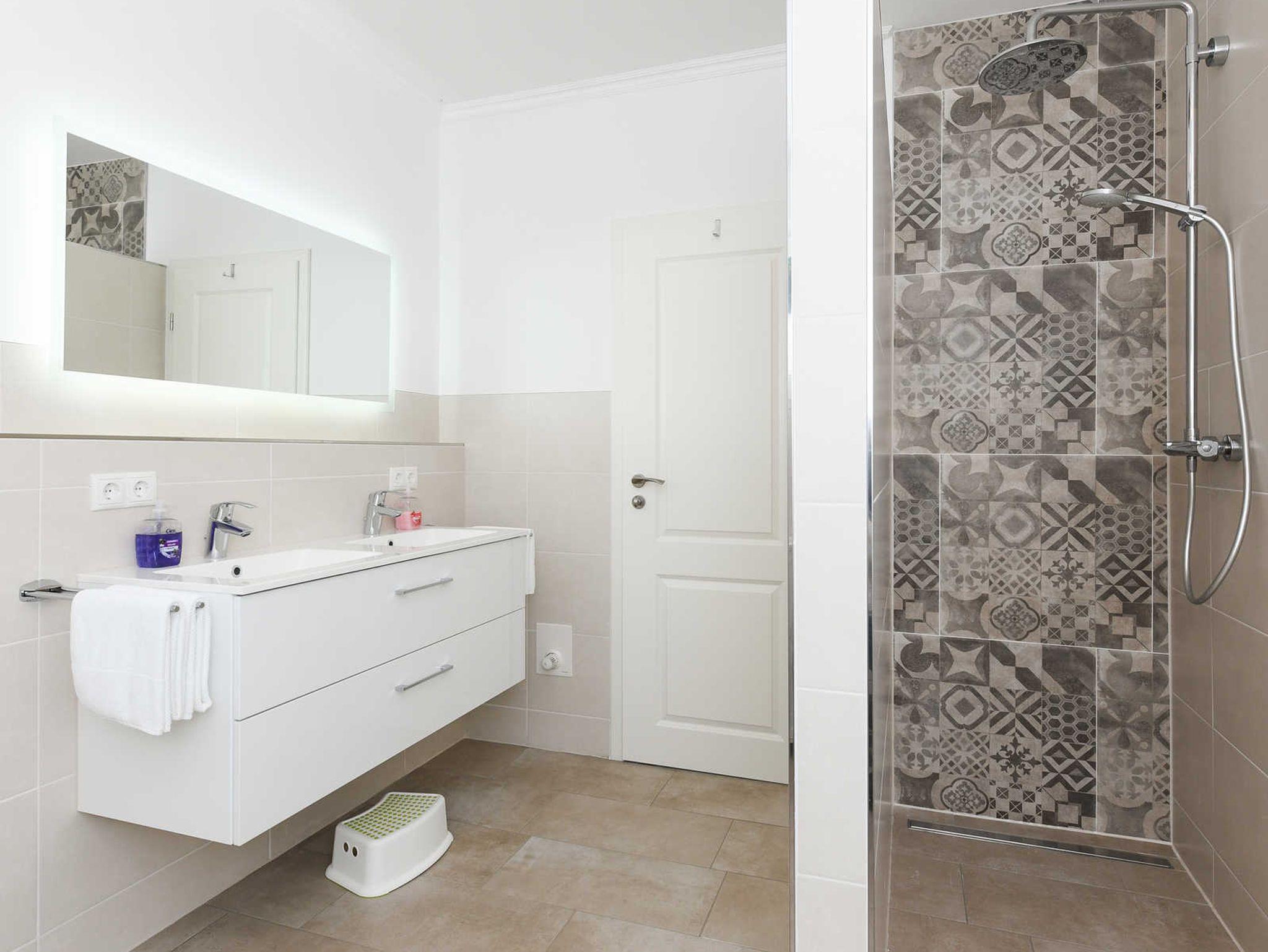 Badezimmer mit Dusche, Waschtisch und WC