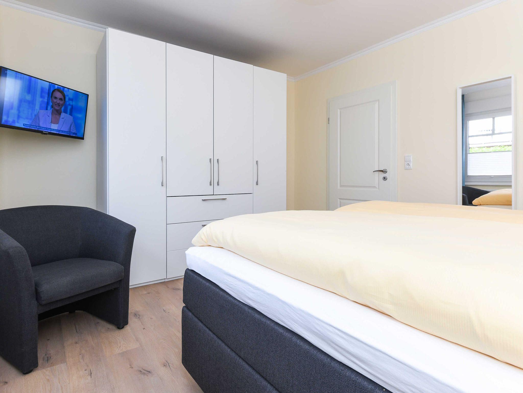 Die Ferienwohnung Sonnendeck, ebenfalls im ersten Obergeschoss ist optimal für 2 Gäste. Es steht im Schlafzimmer aber auch noch ein Schrankbett zum Ausklappen für einen dritten Gast zur Verfügung.