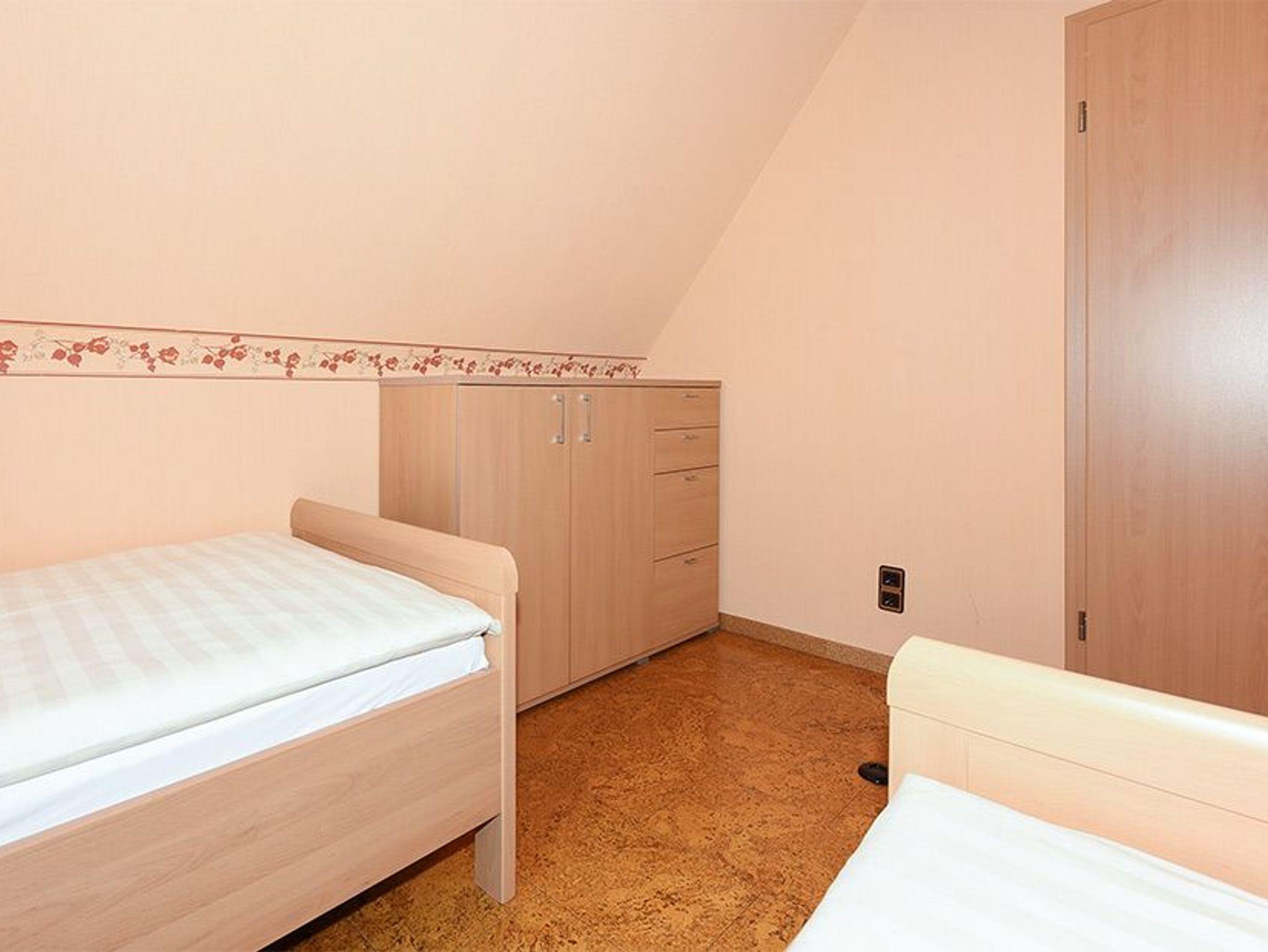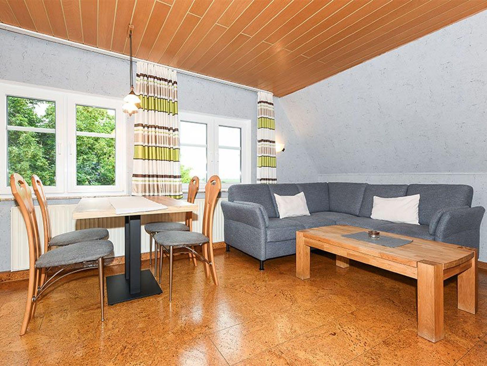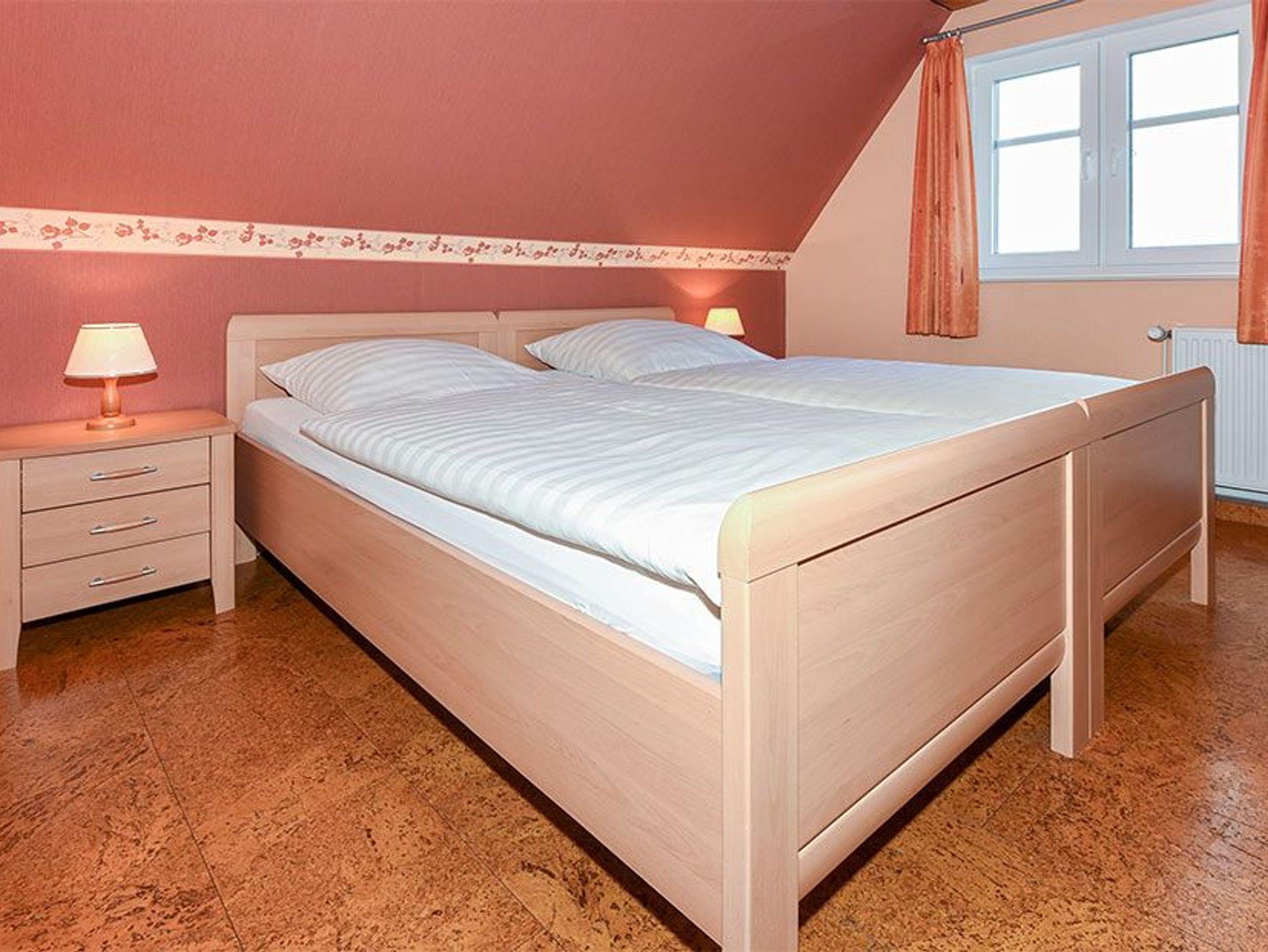 Größe ca. 50 Quadratmeter, Wohnraum mit integrierter Küche, Schlafzimmer, zweites separates Schlafzimmer/Kinderzimmer, Badezimmer mit Dusche, Waschtisch und WC, Obergeschoss, optimal für 2 bis 4 Personen.