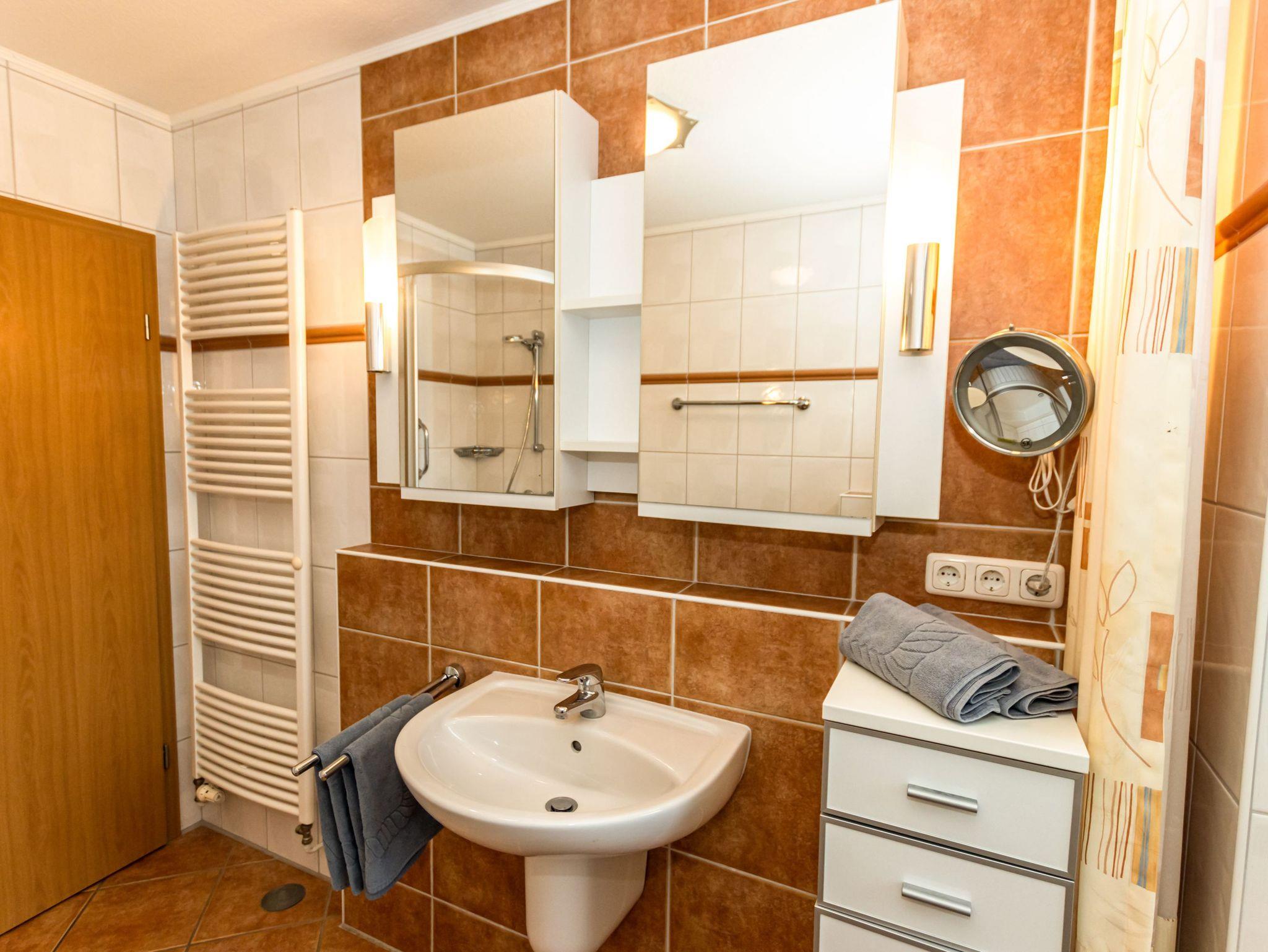 - Badezimmer mit Dusche, Waschtisch und WC
