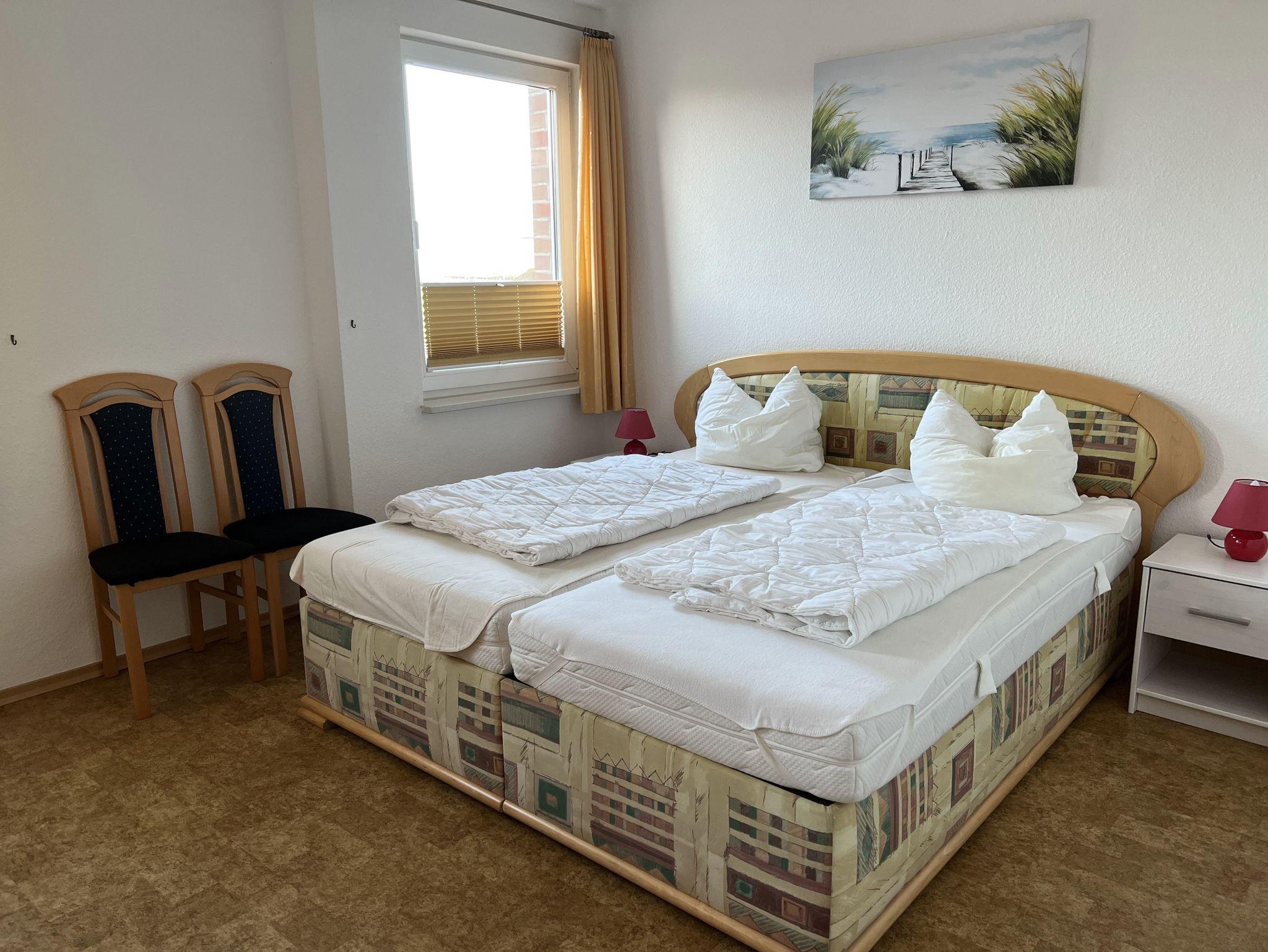 Ferienwohnung Roter Sand, Elternschlafzimmer mit Doppelbett, Kinderschlafzimmer 2 Betten als Hochbett, Badezimmer mit Dusche und WC, Wohnzimmer mit Essbereich und Küche, Balkon