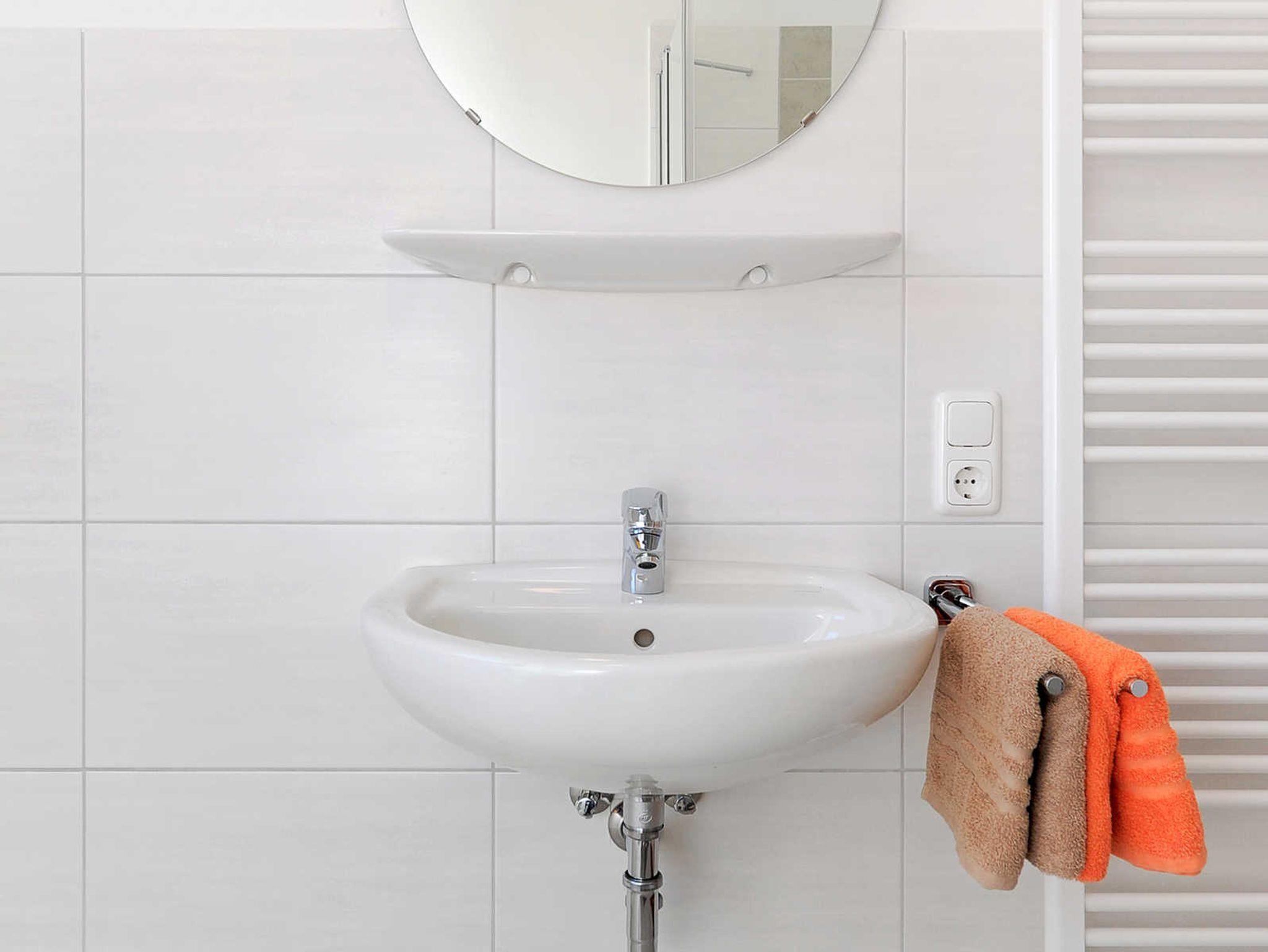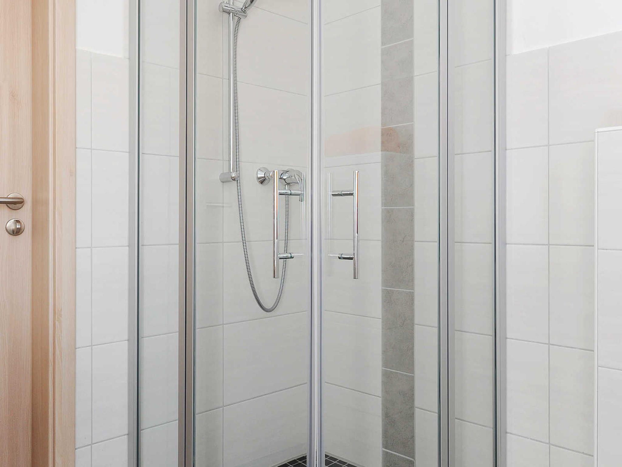 Badezimmer mit Dusche, Waschtisch und WC